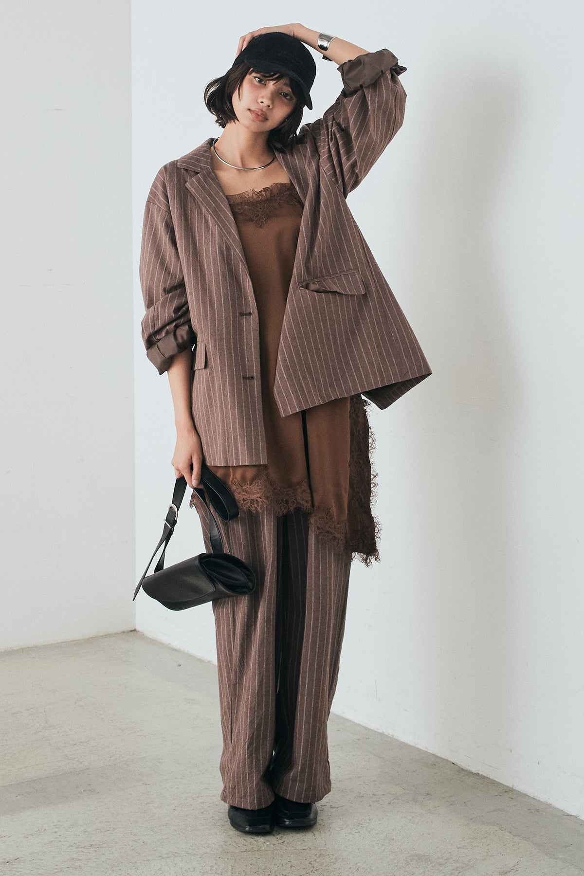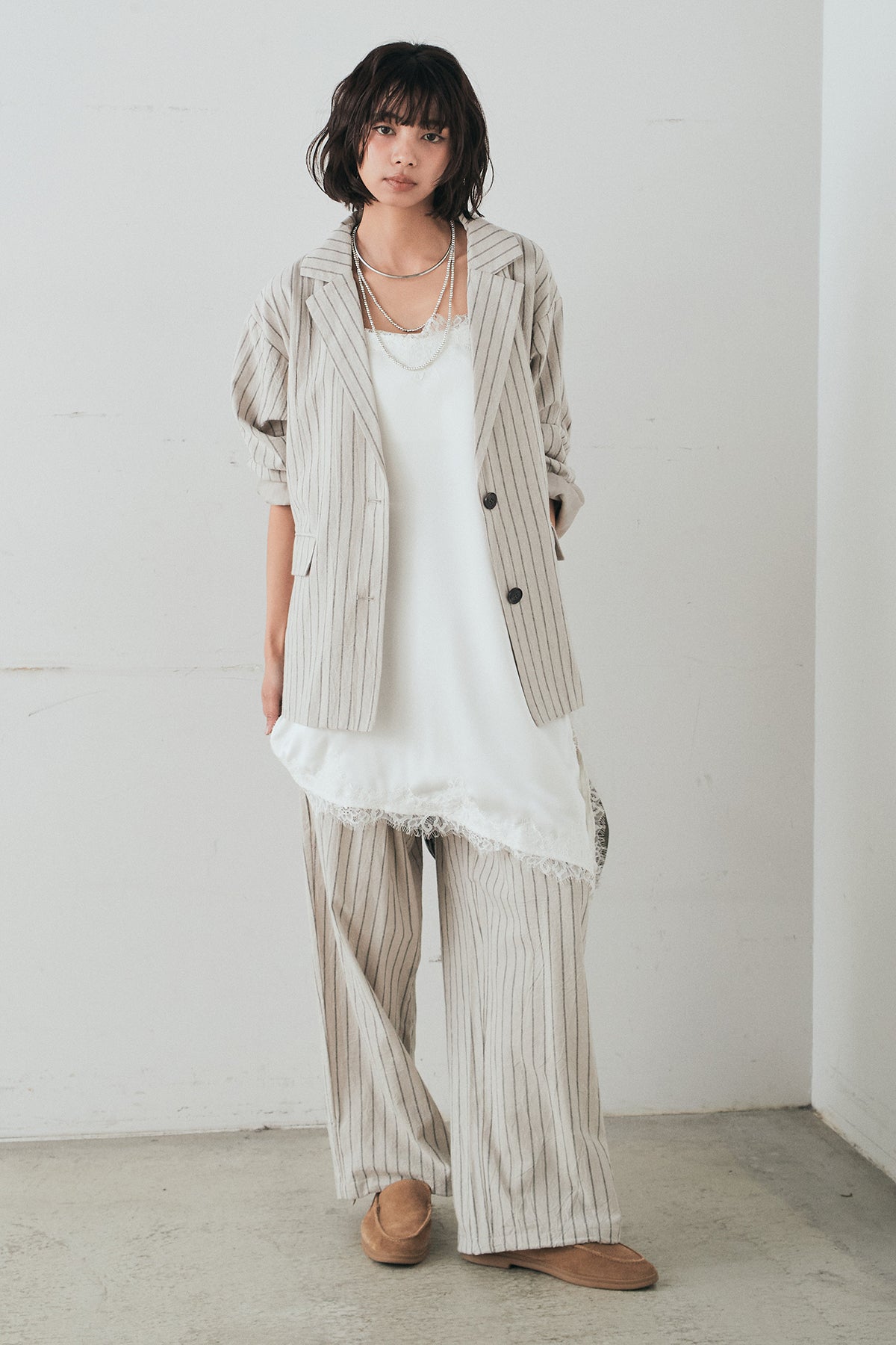 [SET]リネンライクストライプテーラードジャケット+リネンライクストライプタックイージーパンツ(2set)