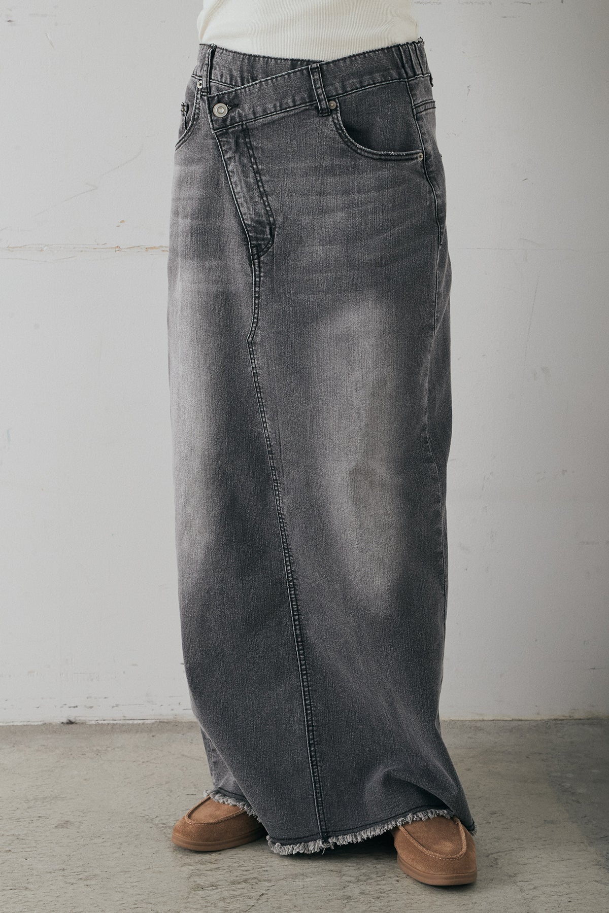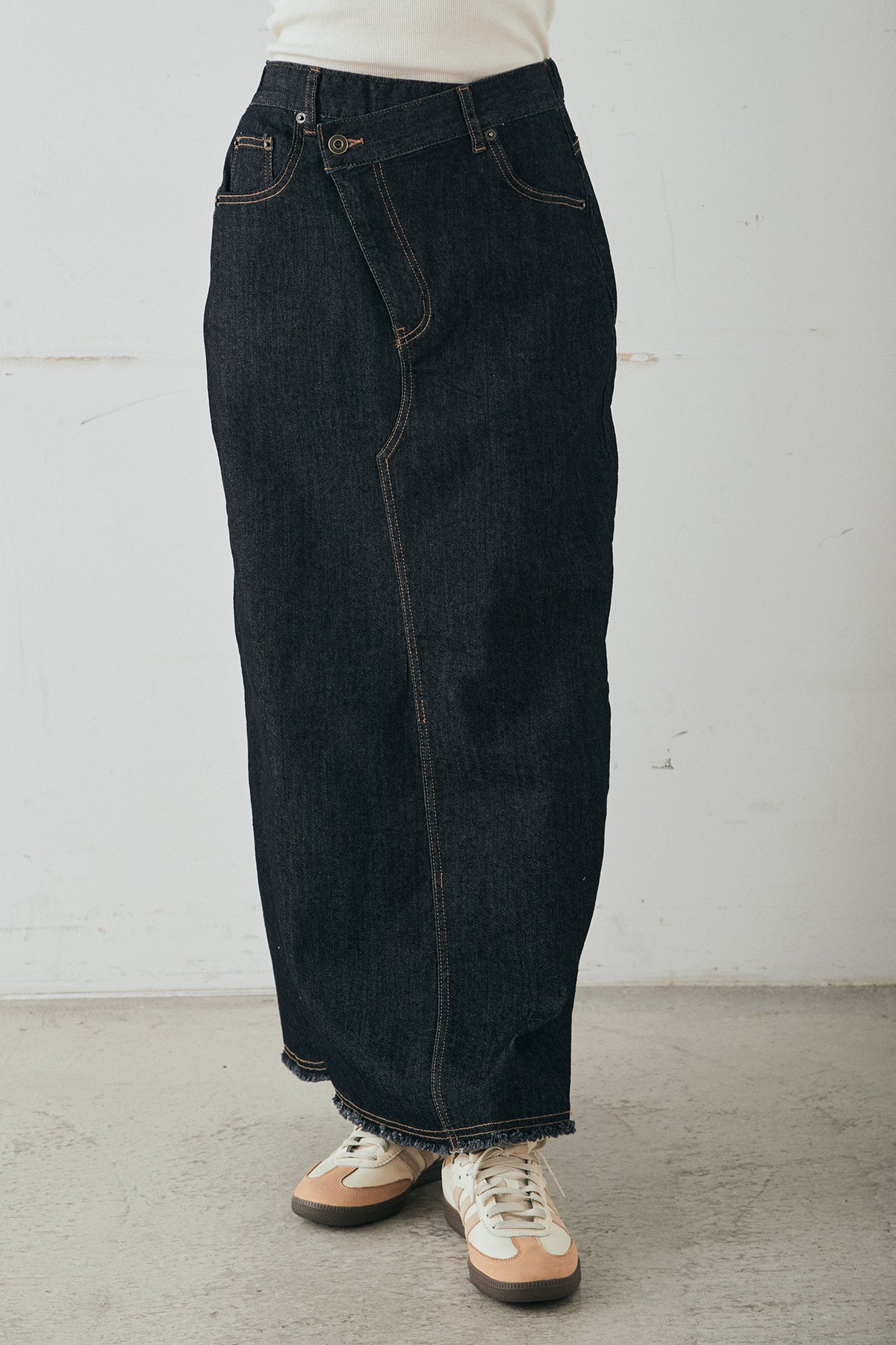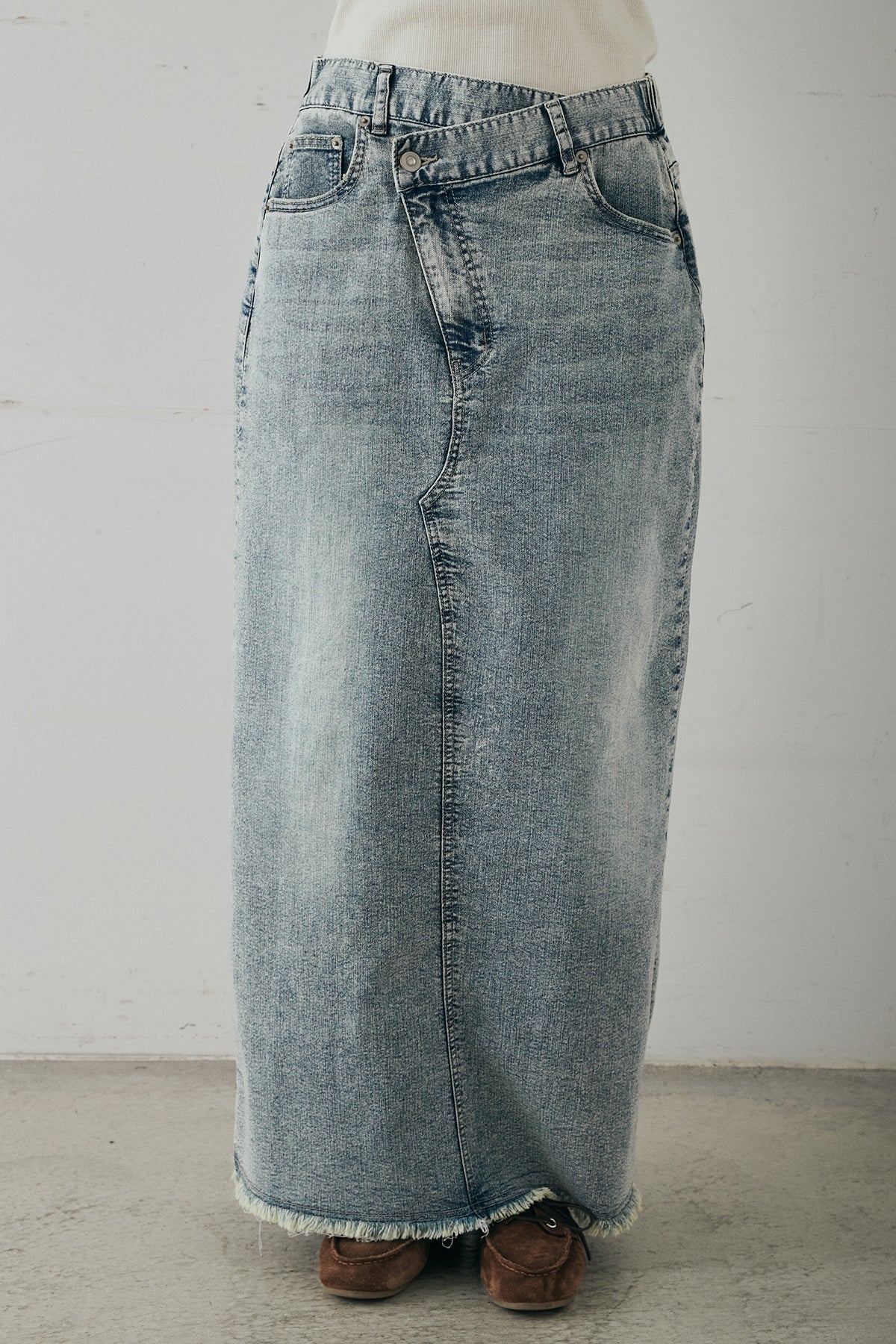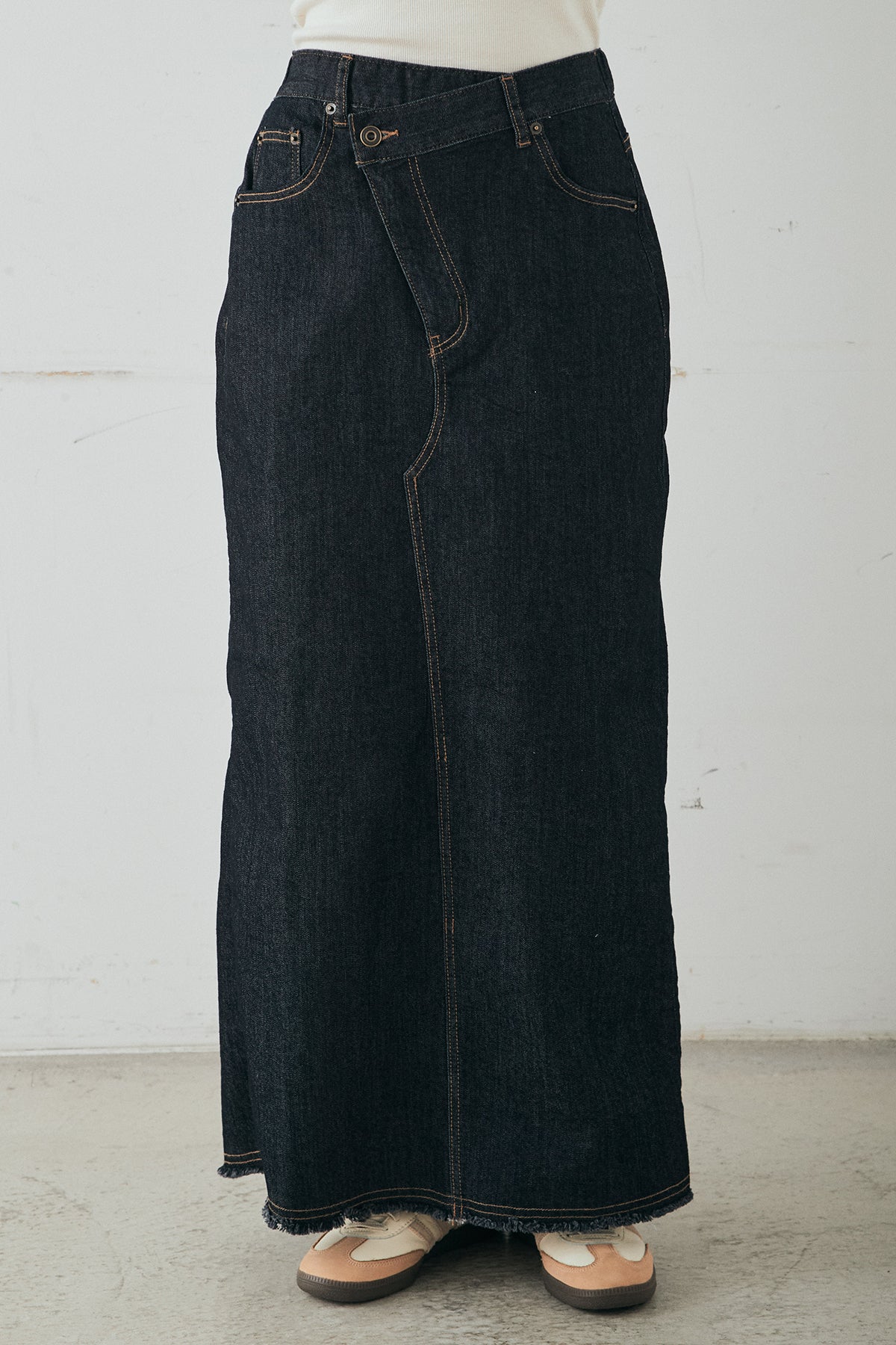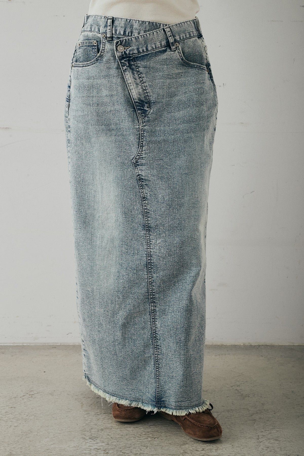 ウエストのクロスデザインが印象的なデニムタイトスカート。 程よく身体に沿うすっきりとしたシルエットが、カジュアルな素材感の中にも洗練された雰囲気をプラスします。ヴィンテージライクな加工感がスタイリングに奥行きを与え、シンプルなトップス合わせでもこなれた印象に。 ロング丈ながら動きやすく、デイリーに取り入れやすい一本。シーズンを問わず幅広いスタイリングに活躍するアイテムです。