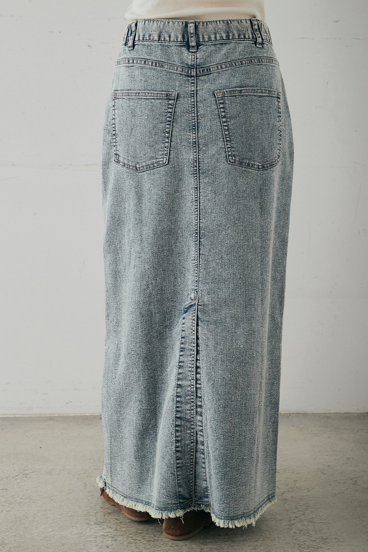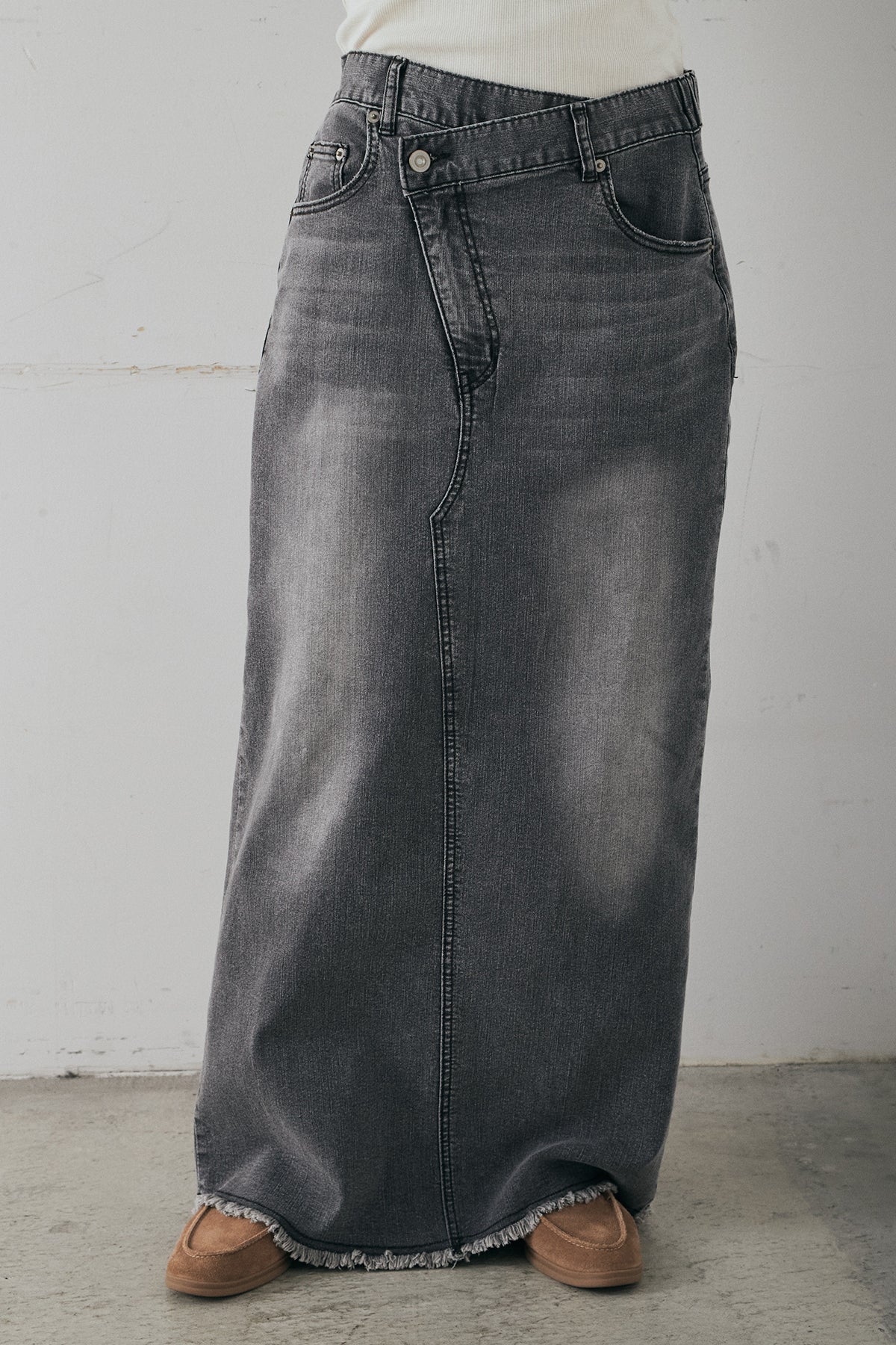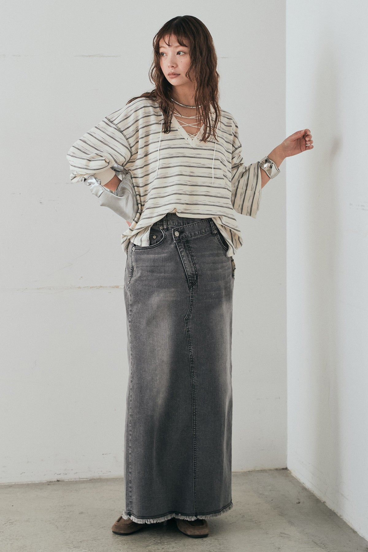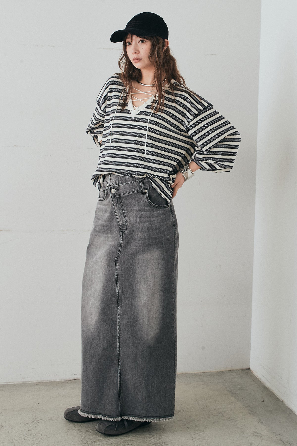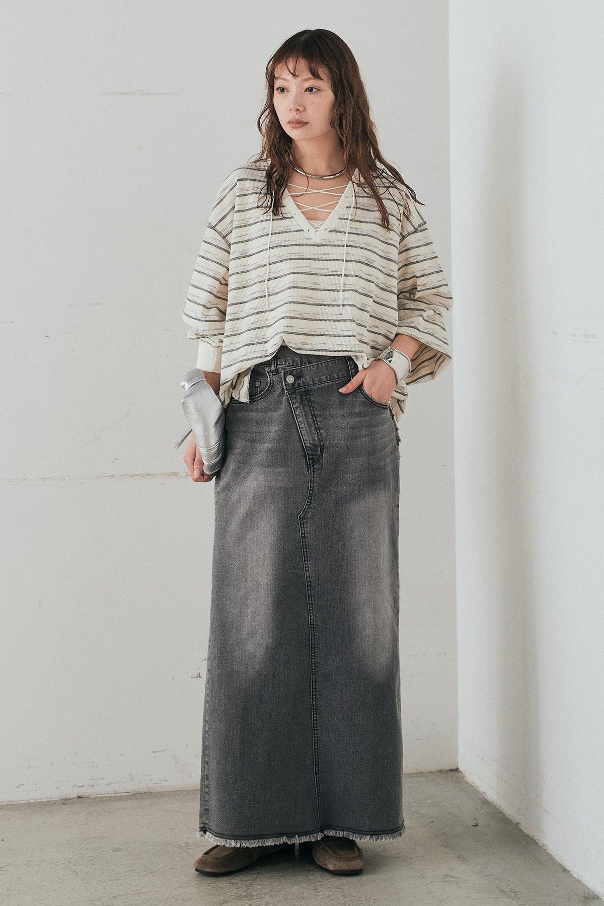 ウエストのクロスデザインが印象的なデニムタイトスカート。 程よく身体に沿うすっきりとしたシルエットが、カジュアルな素材感の中にも洗練された雰囲気をプラスします。ヴィンテージライクな加工感がスタイリングに奥行きを与え、シンプルなトップス合わせでもこなれた印象に。 ロング丈ながら動きやすく、デイリーに取り入れやすい一本。シーズンを問わず幅広いスタイリングに活躍するアイテムです。