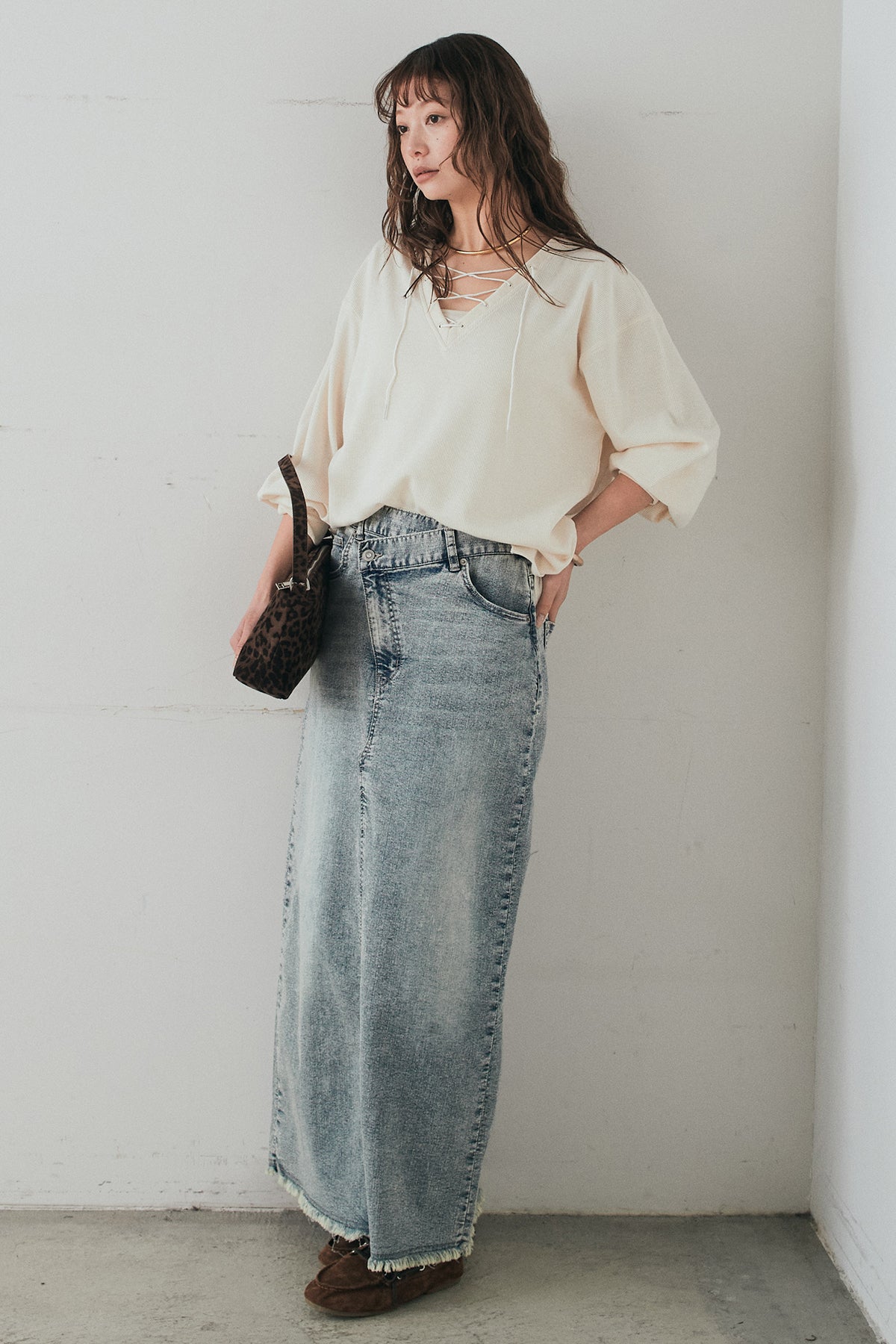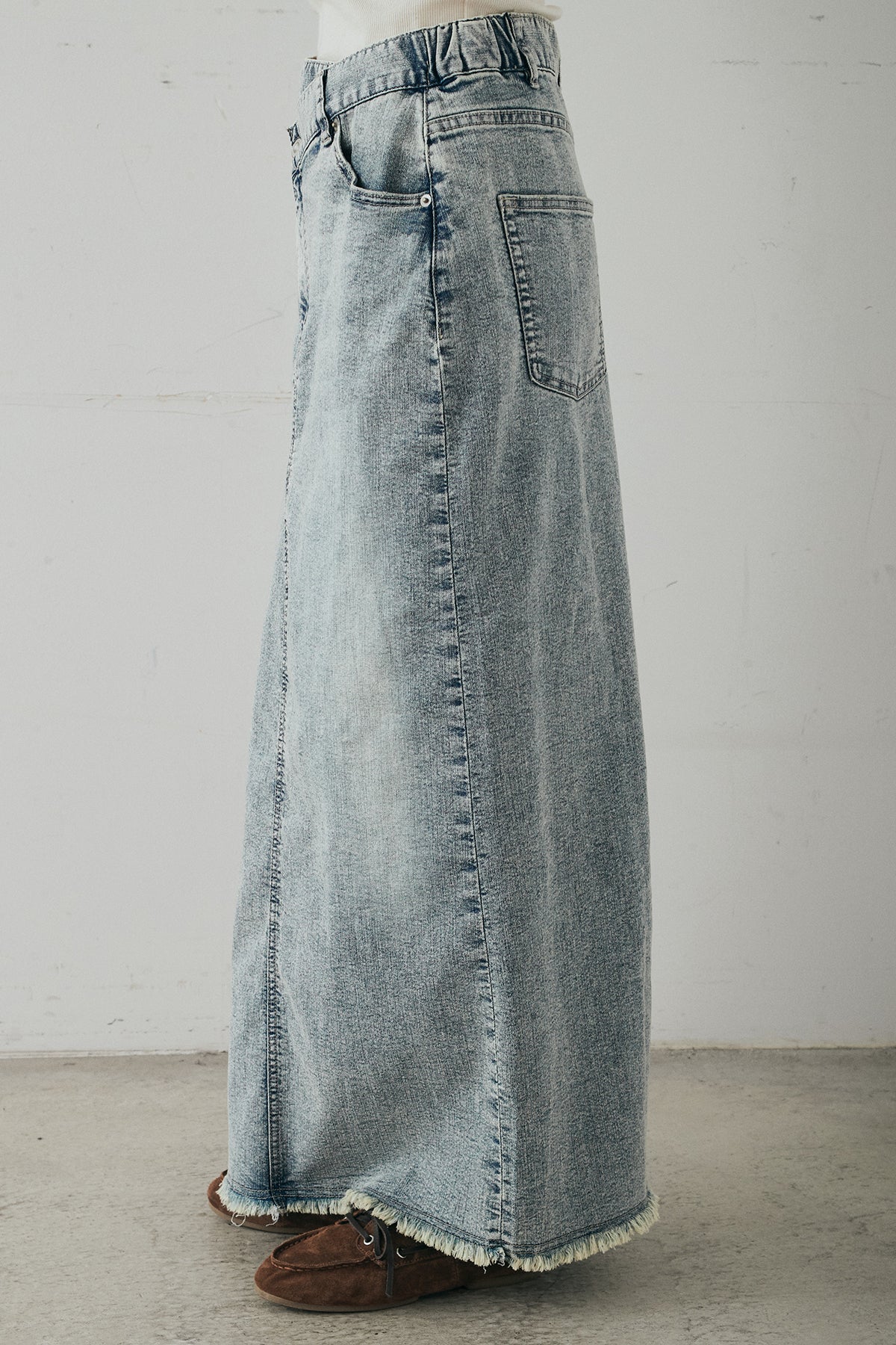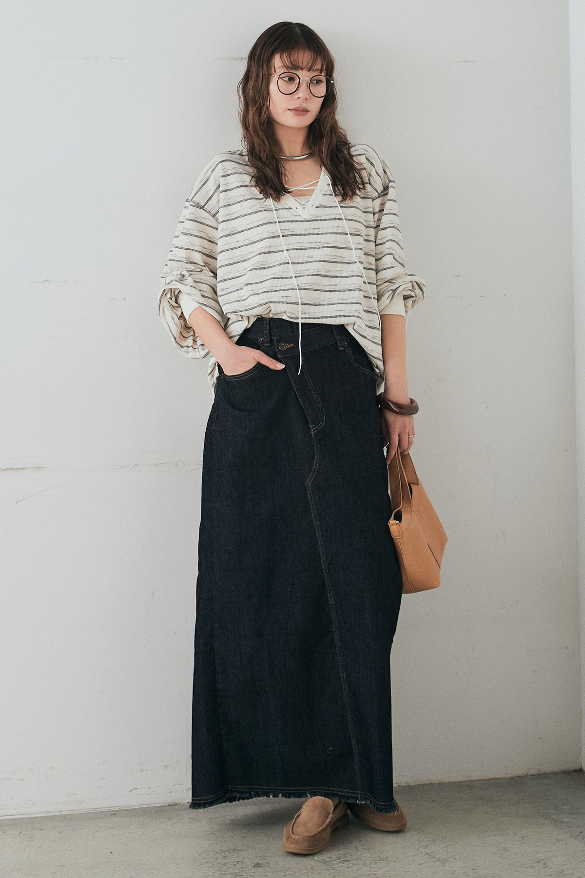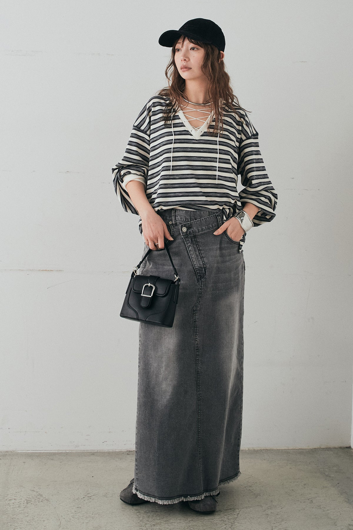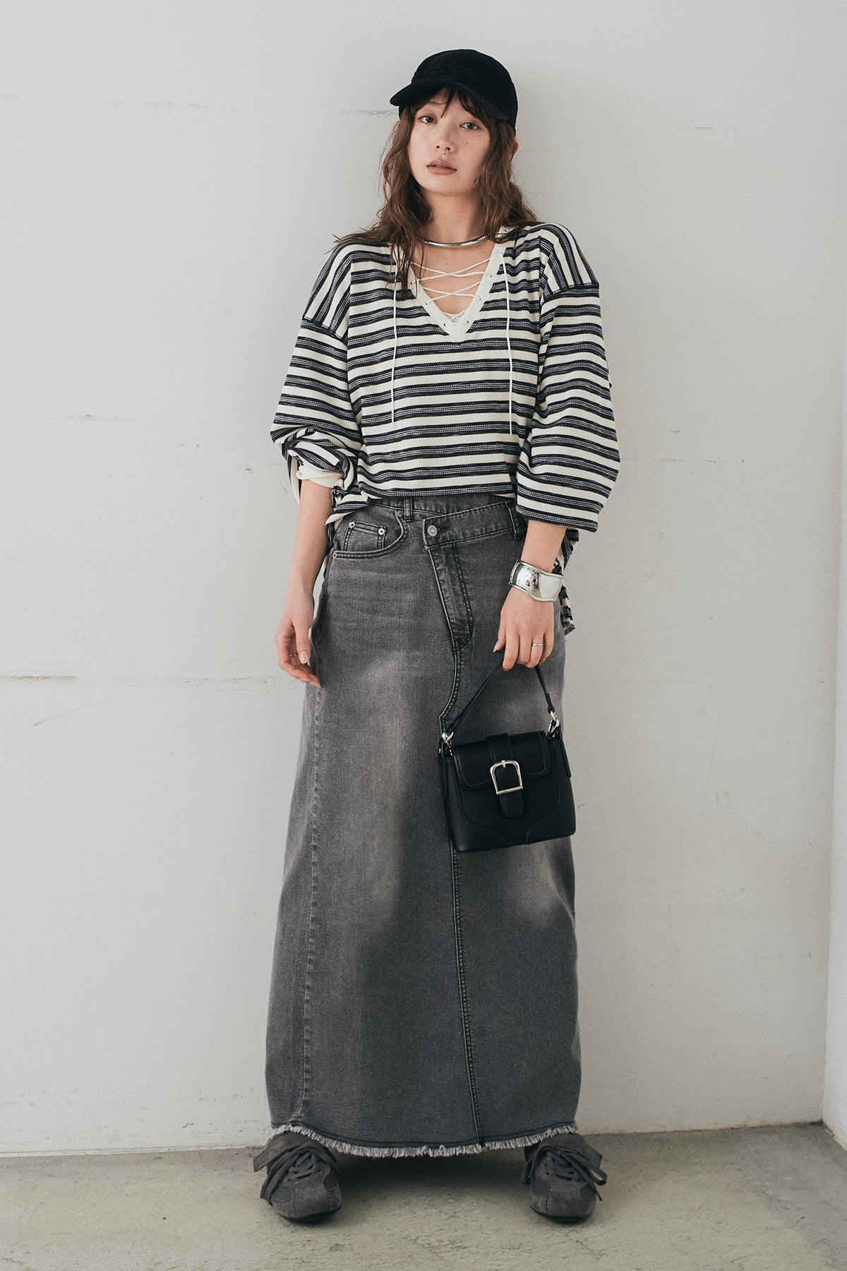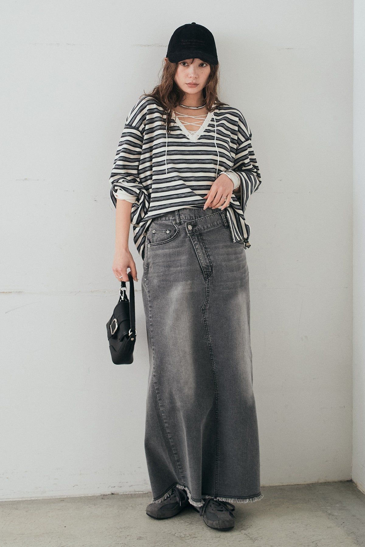 ウエストのクロスデザインが印象的なデニムタイトスカート。 程よく身体に沿うすっきりとしたシルエットが、カジュアルな素材感の中にも洗練された雰囲気をプラスします。ヴィンテージライクな加工感がスタイリングに奥行きを与え、シンプルなトップス合わせでもこなれた印象に。 ロング丈ながら動きやすく、デイリーに取り入れやすい一本。シーズンを問わず幅広いスタイリングに活躍するアイテムです。