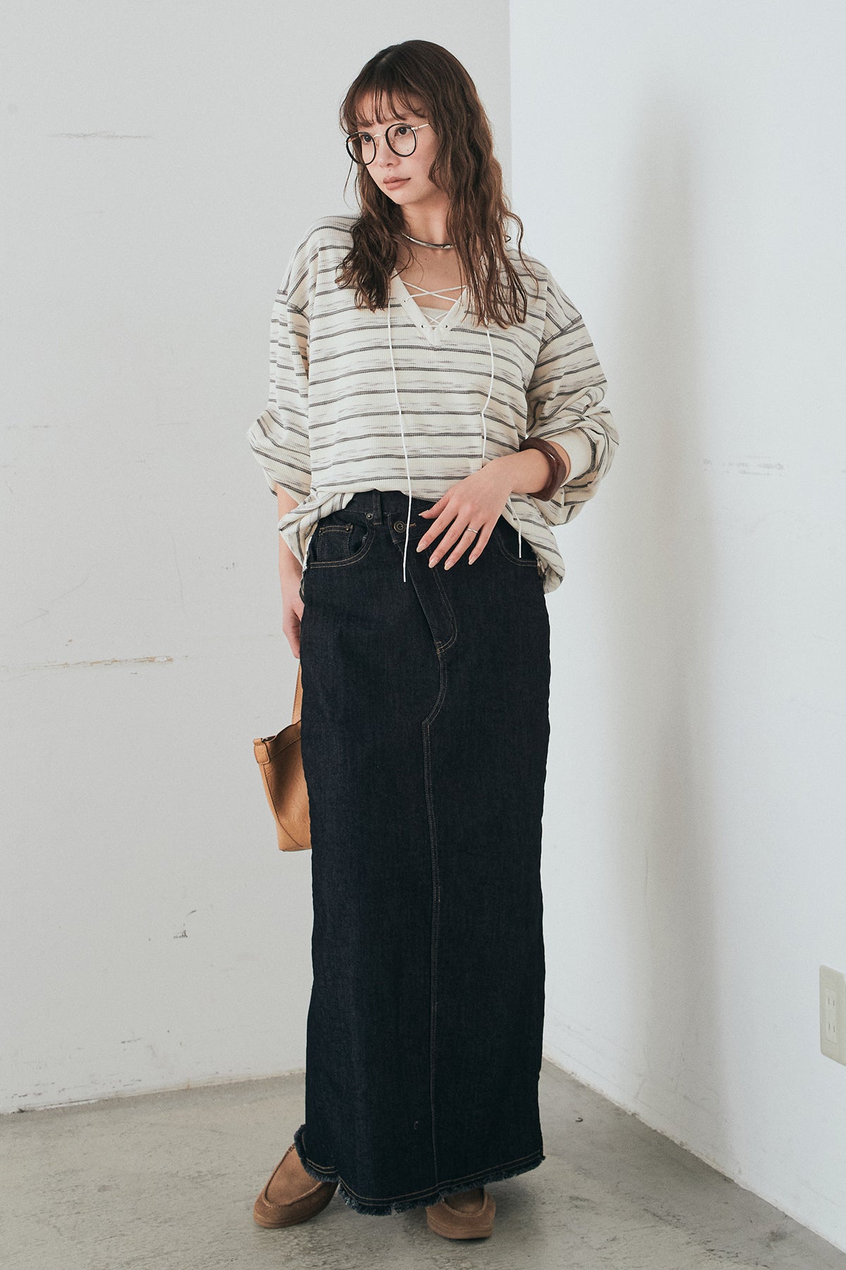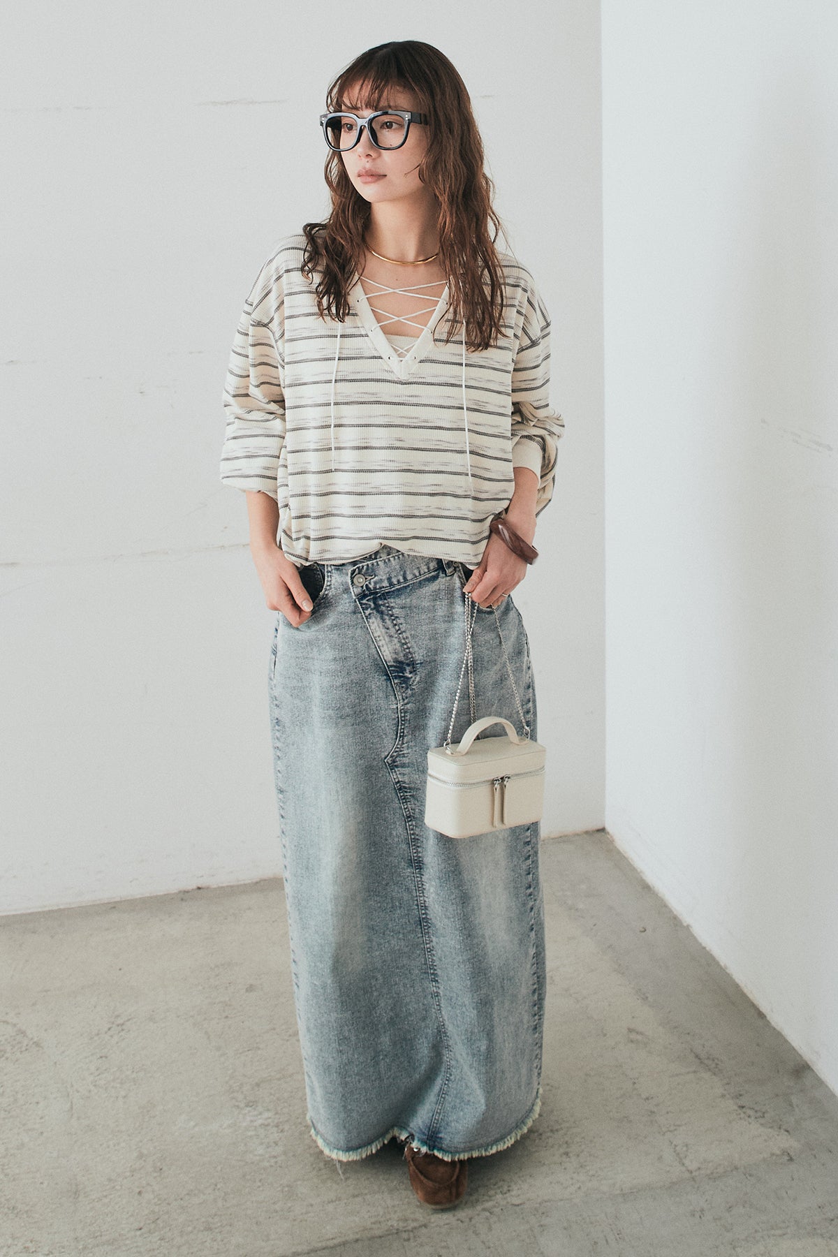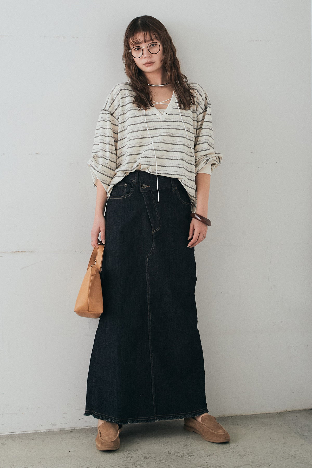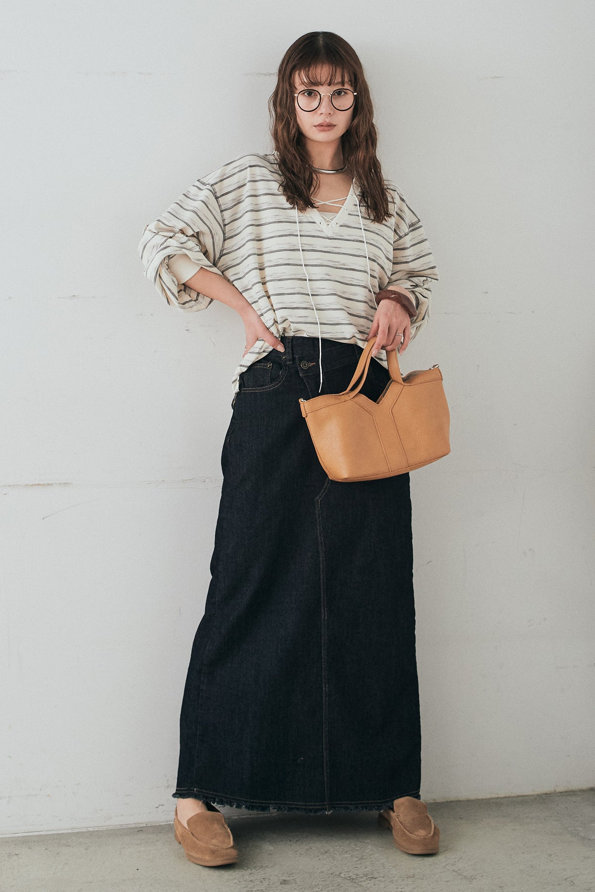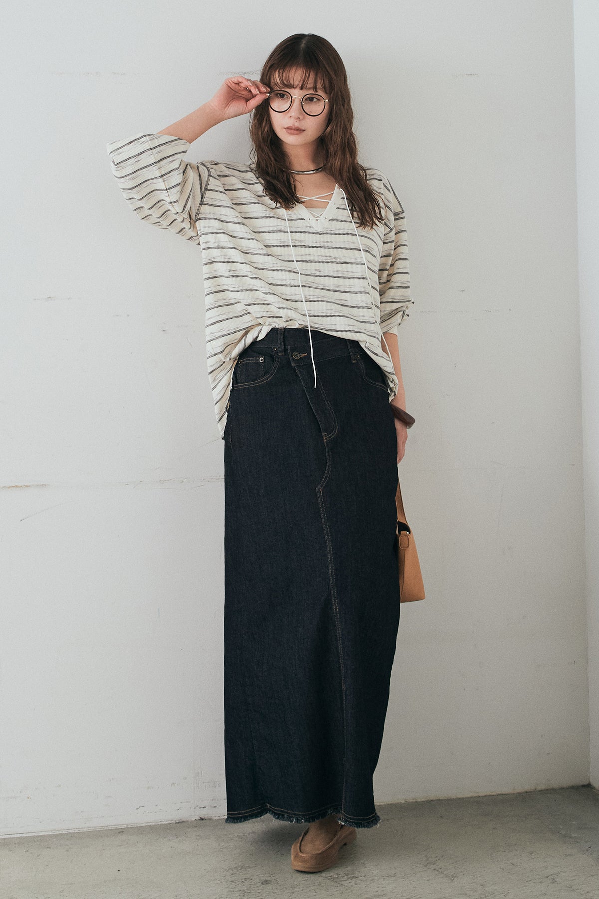 ウエストのクロスデザインが印象的なデニムタイトスカート。 程よく身体に沿うすっきりとしたシルエットが、カジュアルな素材感の中にも洗練された雰囲気をプラスします。ヴィンテージライクな加工感がスタイリングに奥行きを与え、シンプルなトップス合わせでもこなれた印象に。 ロング丈ながら動きやすく、デイリーに取り入れやすい一本。シーズンを問わず幅広いスタイリングに活躍するアイテムです。
