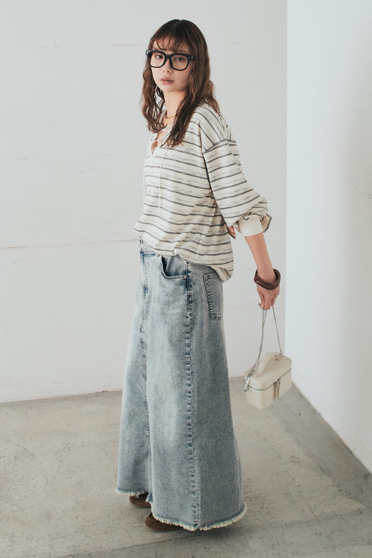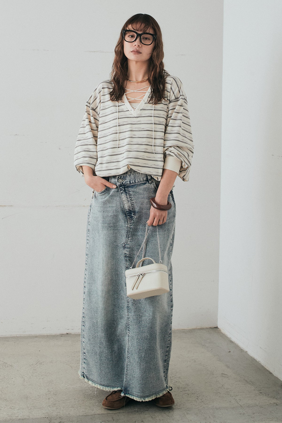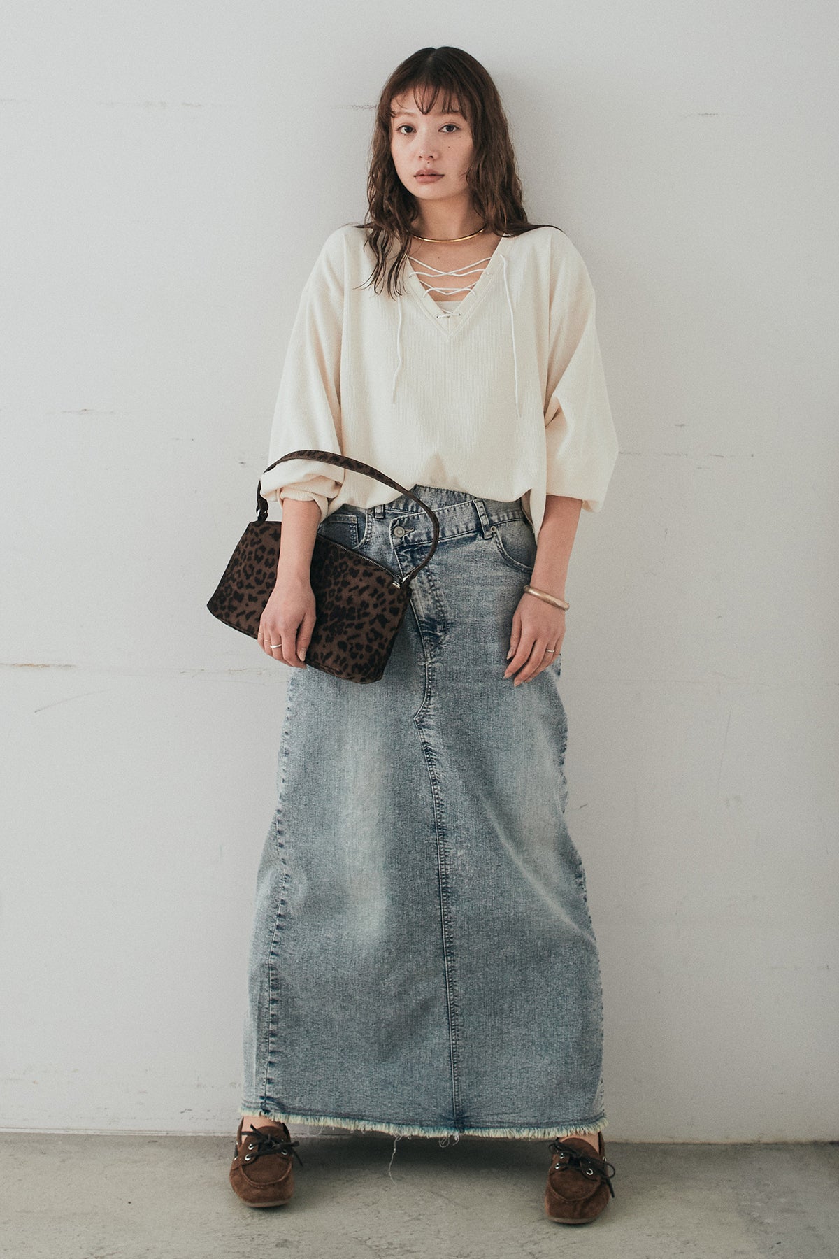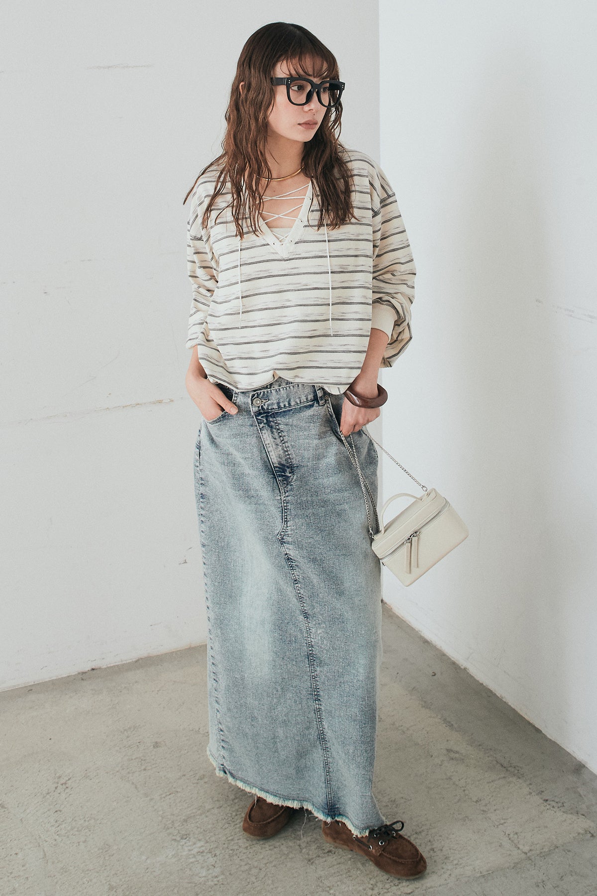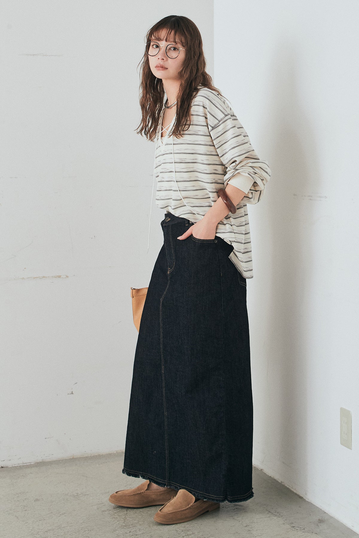 ウエストのクロスデザインが印象的なデニムタイトスカート。 程よく身体に沿うすっきりとしたシルエットが、カジュアルな素材感の中にも洗練された雰囲気をプラスします。ヴィンテージライクな加工感がスタイリングに奥行きを与え、シンプルなトップス合わせでもこなれた印象に。 ロング丈ながら動きやすく、デイリーに取り入れやすい一本。シーズンを問わず幅広いスタイリングに活躍するアイテムです。
