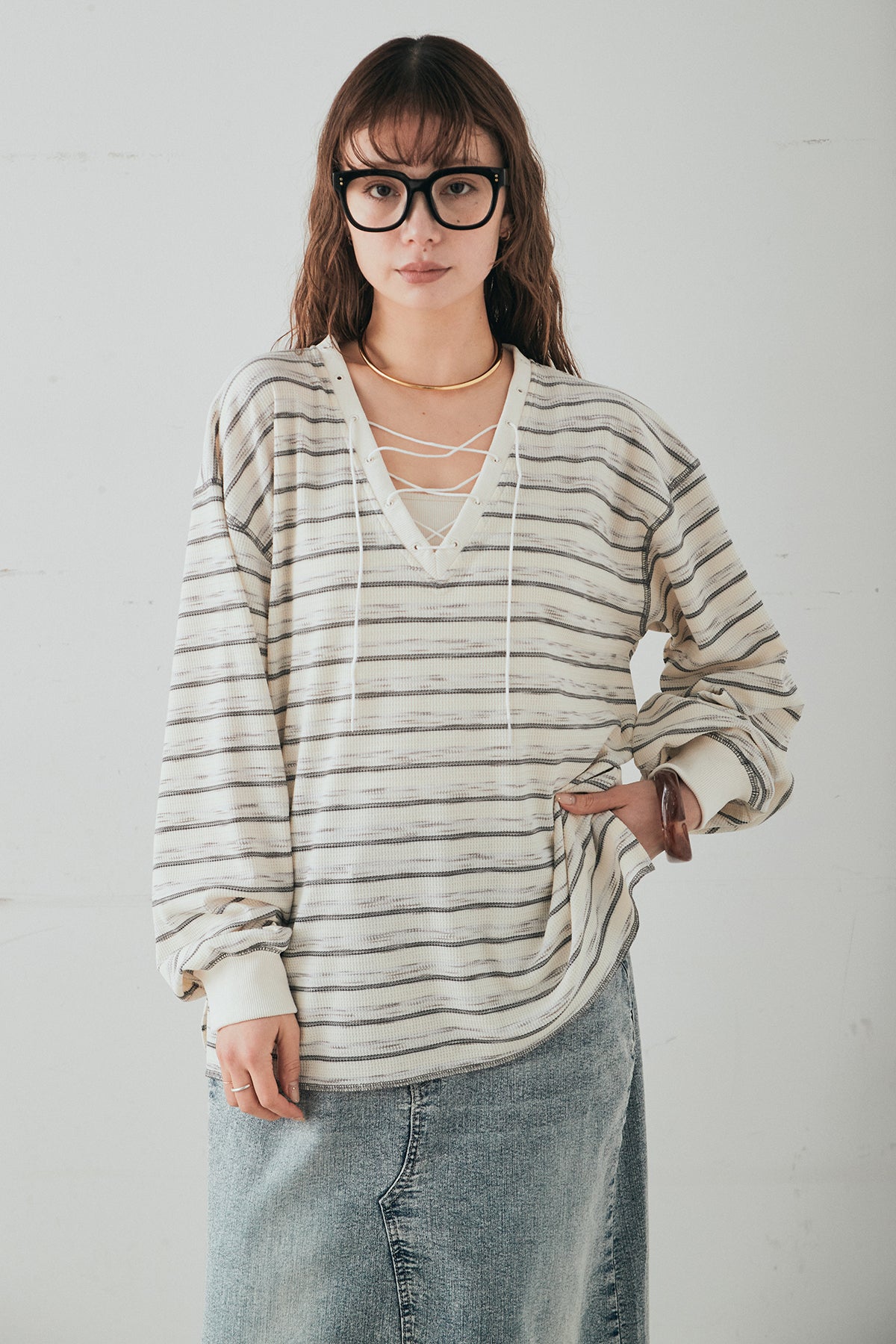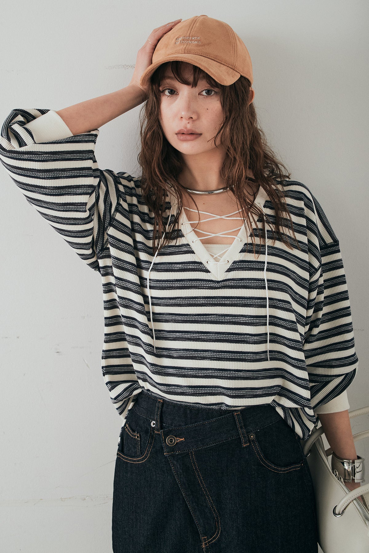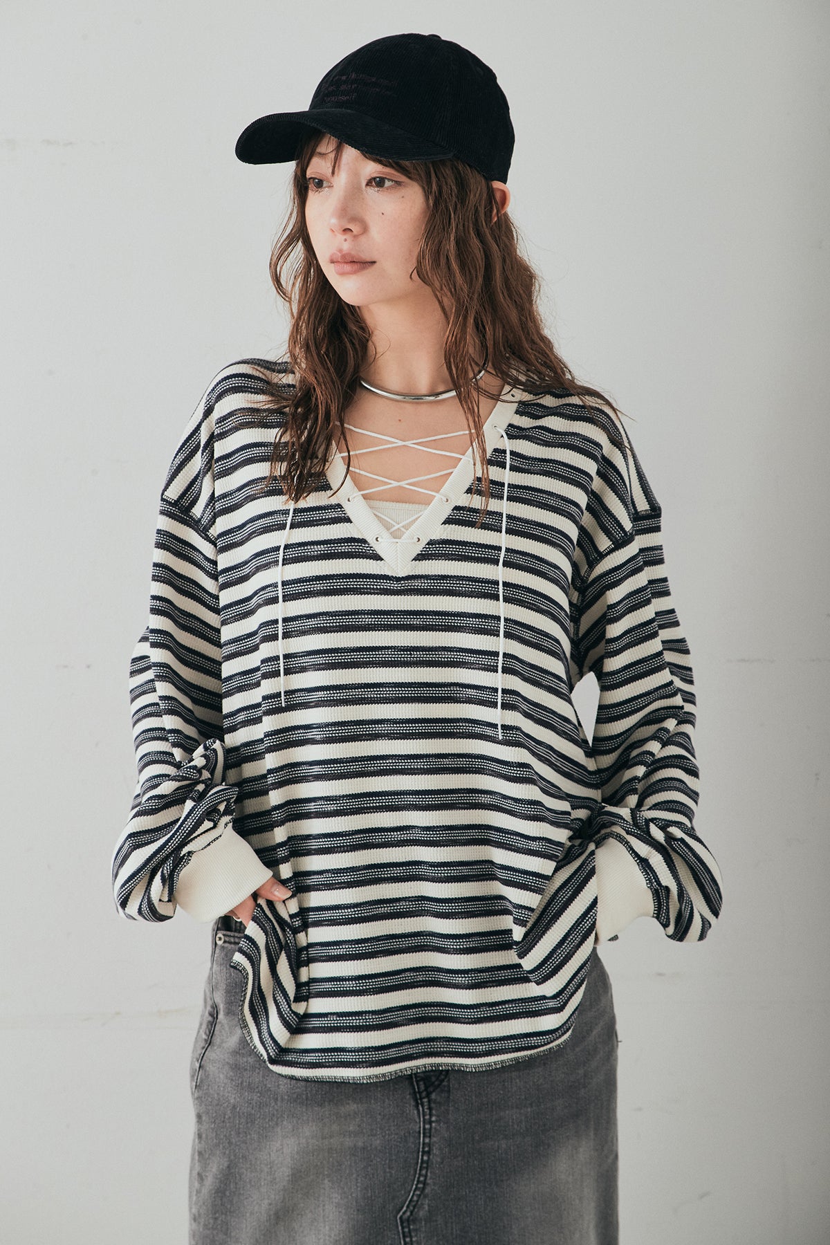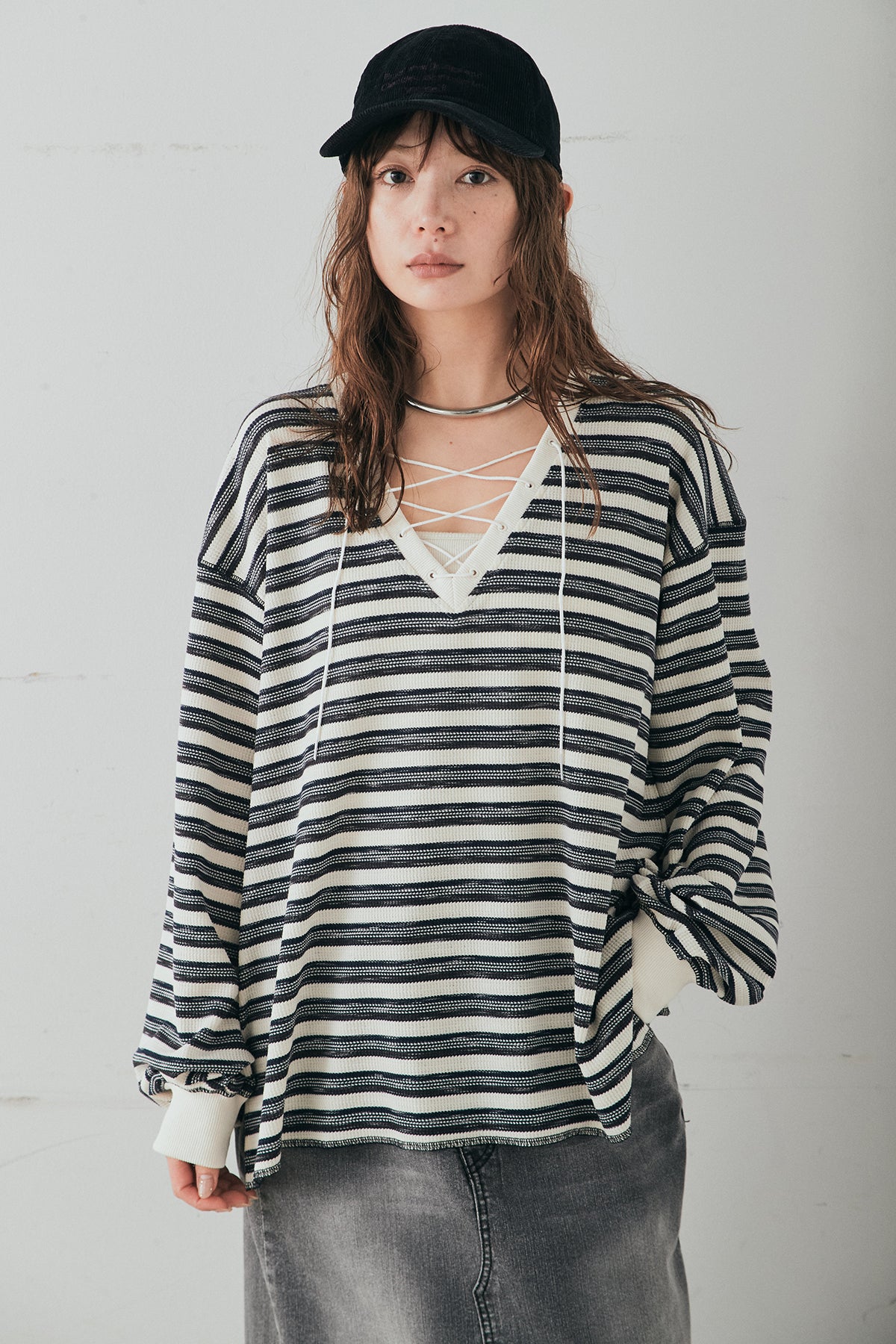 レースアップデザインが目を引く、ワッフルボーダートップス。 フロントのレースアップがさりげないアクセントになり、シンプルな中にもこなれ感をプラスします。 凹凸のあるワッフル素材はやわらかな肌触りで、程よい厚みがありながらも軽やかな着心地。ボーダー柄がカジュアルな雰囲気を演出しつつ、デコルテのレースアップデザインが女性らしさを引き立てます。 ほどよくゆとりのあるシルエットで、ボトムを選ばずバランスよく着こなせるのもポイント。デニムやワイドパンツと合わせたデイリースタイルはもちろん、スカートと合わせたミックスコーデもおすすめの一枚です。