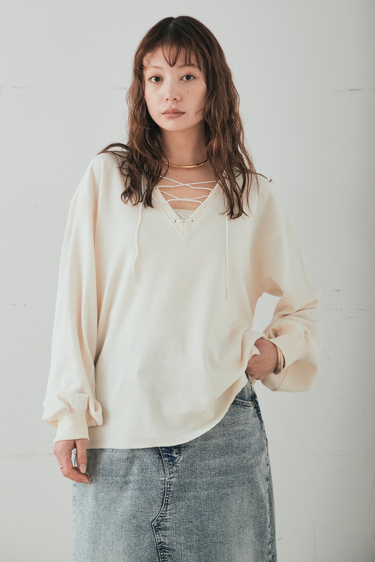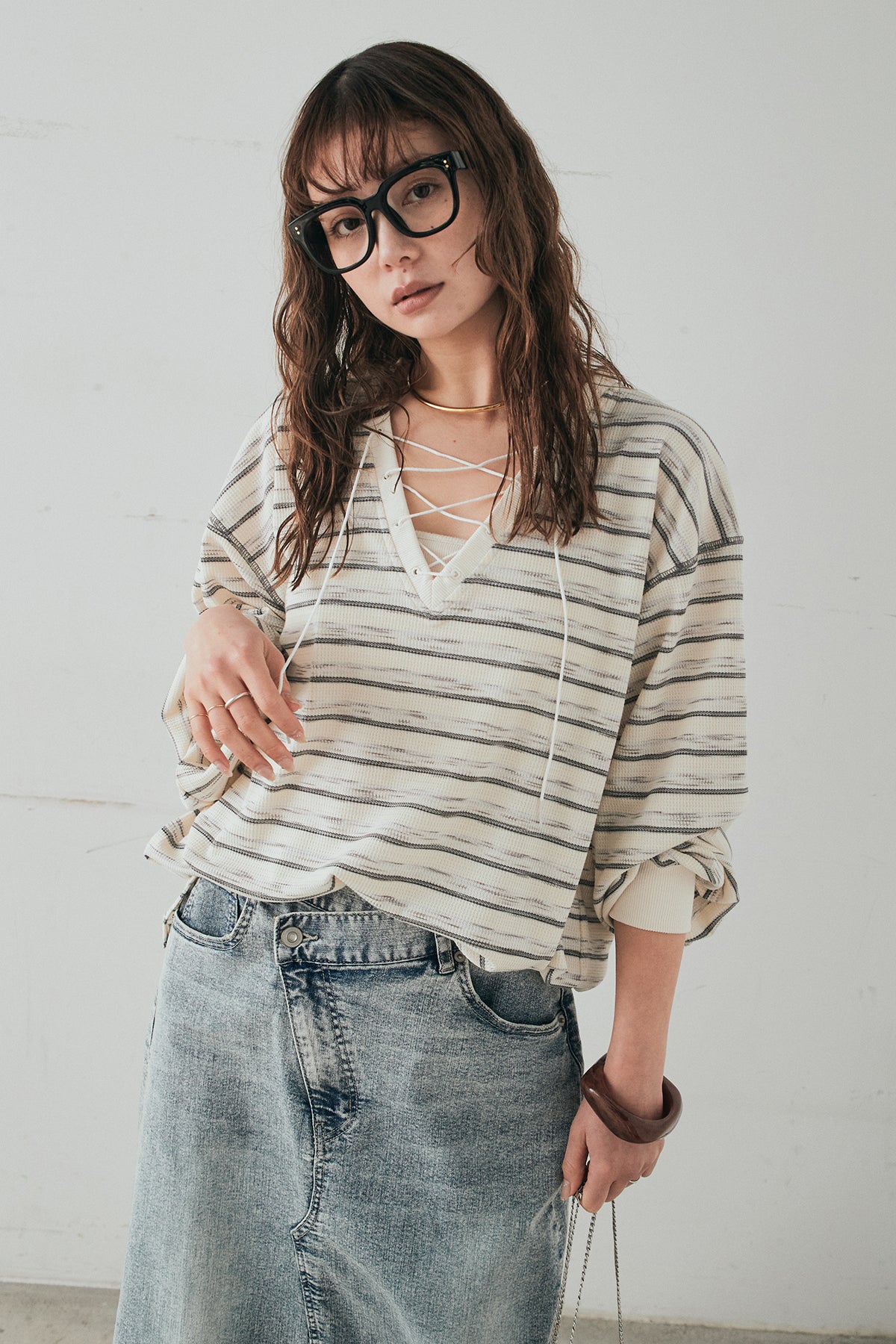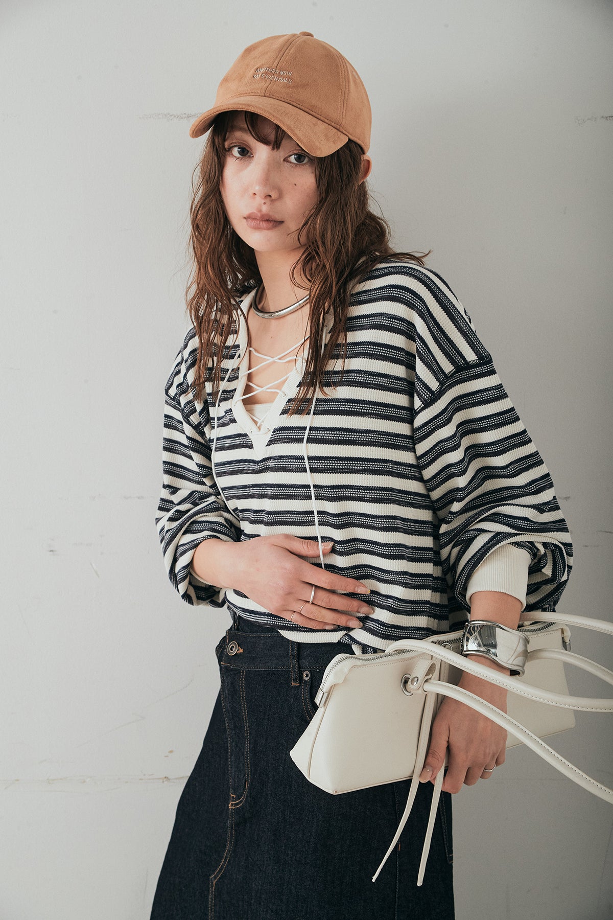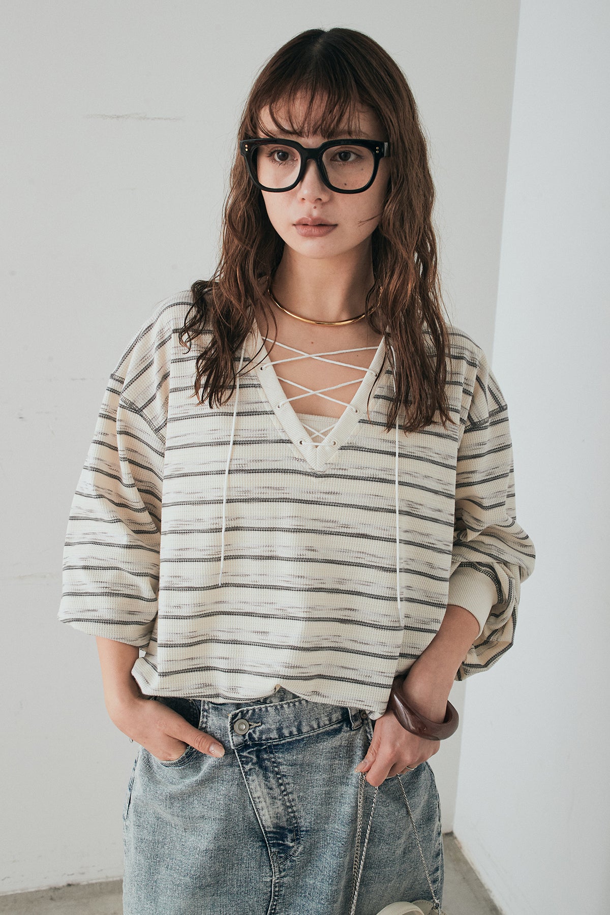 レースアップデザインが目を引く、ワッフルボーダートップス。 フロントのレースアップがさりげないアクセントになり、シンプルな中にもこなれ感をプラスします。 凹凸のあるワッフル素材はやわらかな肌触りで、程よい厚みがありながらも軽やかな着心地。ボーダー柄がカジュアルな雰囲気を演出しつつ、デコルテのレースアップデザインが女性らしさを引き立てます。 ほどよくゆとりのあるシルエットで、ボトムを選ばずバランスよく着こなせるのもポイント。デニムやワイドパンツと合わせたデイリースタイルはもちろん、スカートと合わせたミックスコーデもおすすめの一枚です。