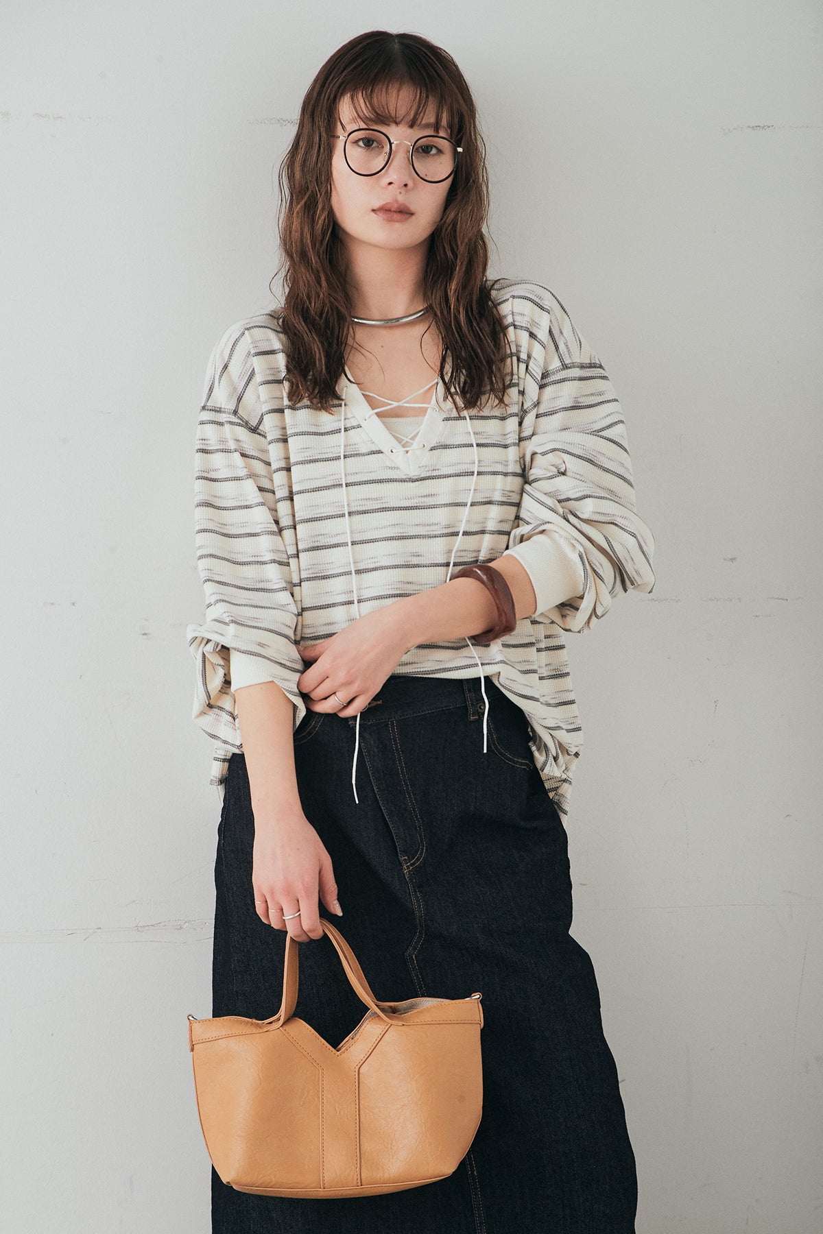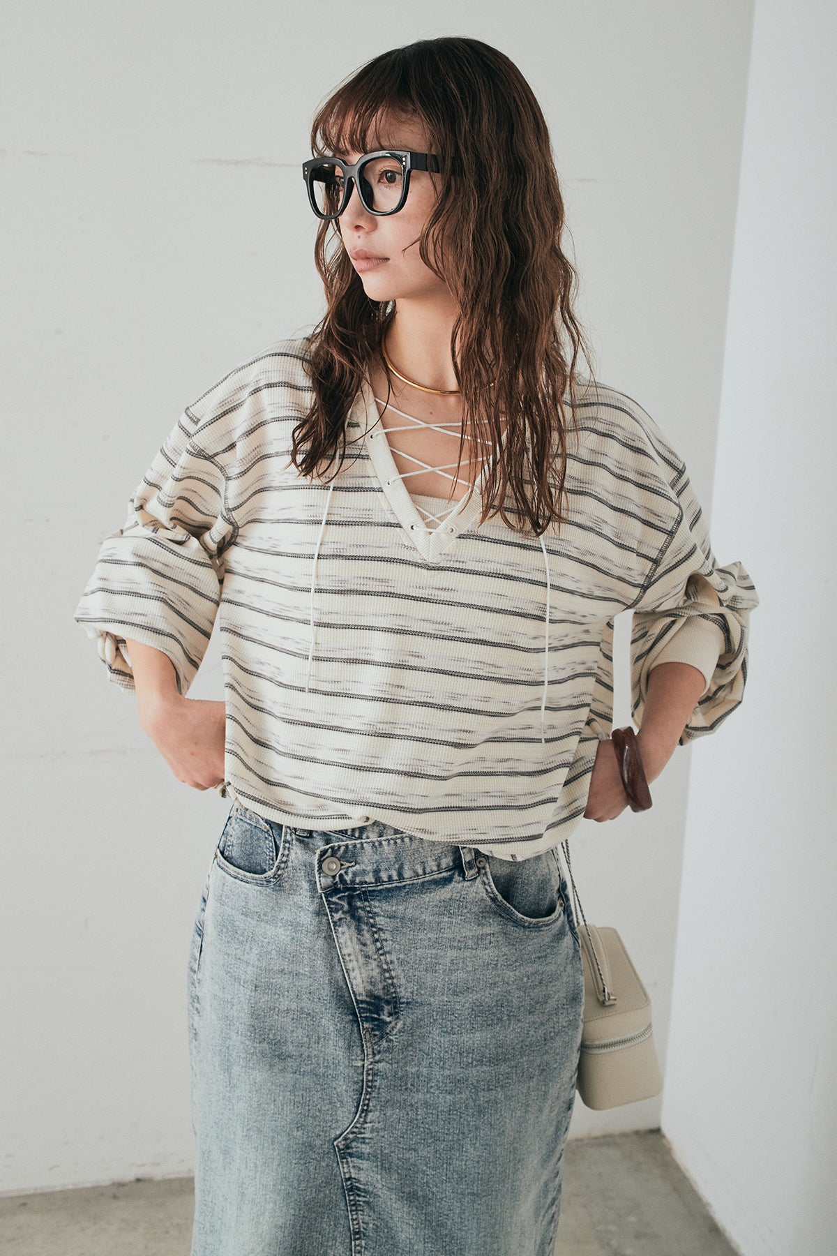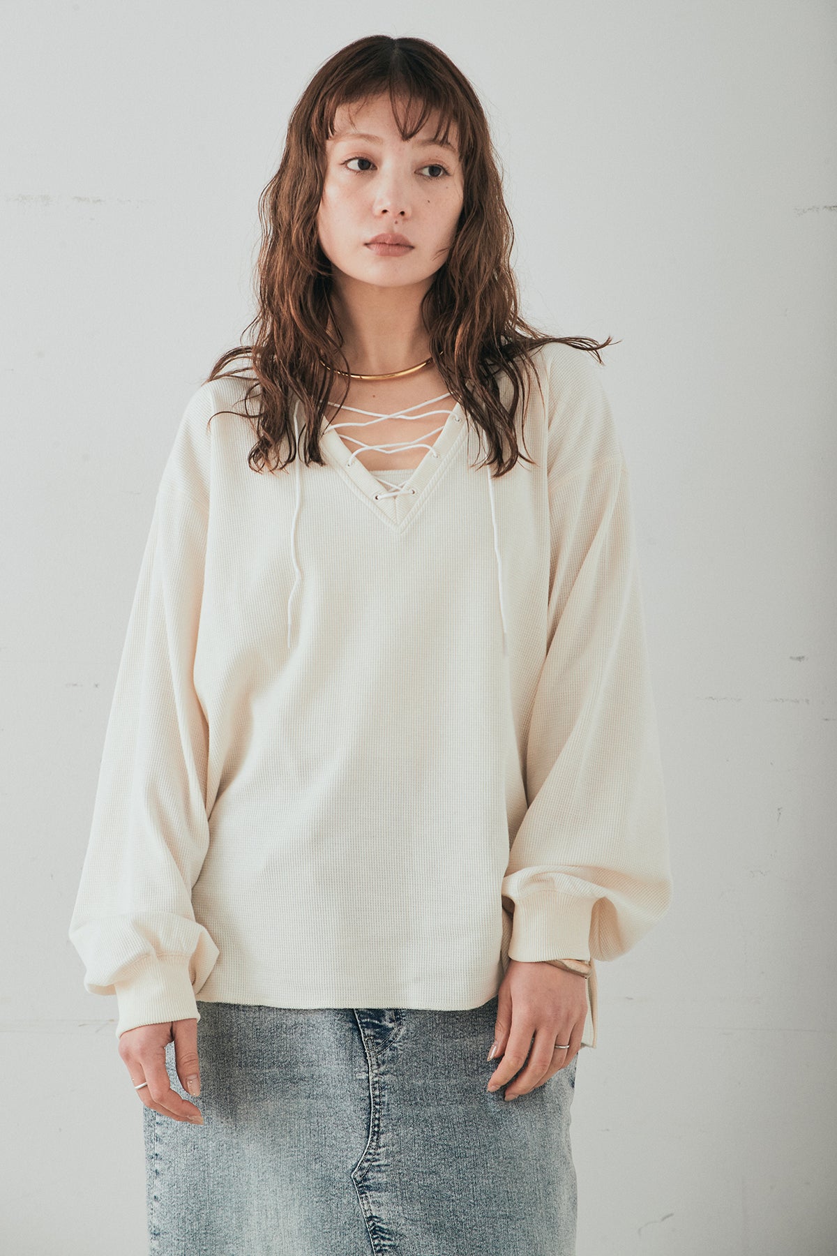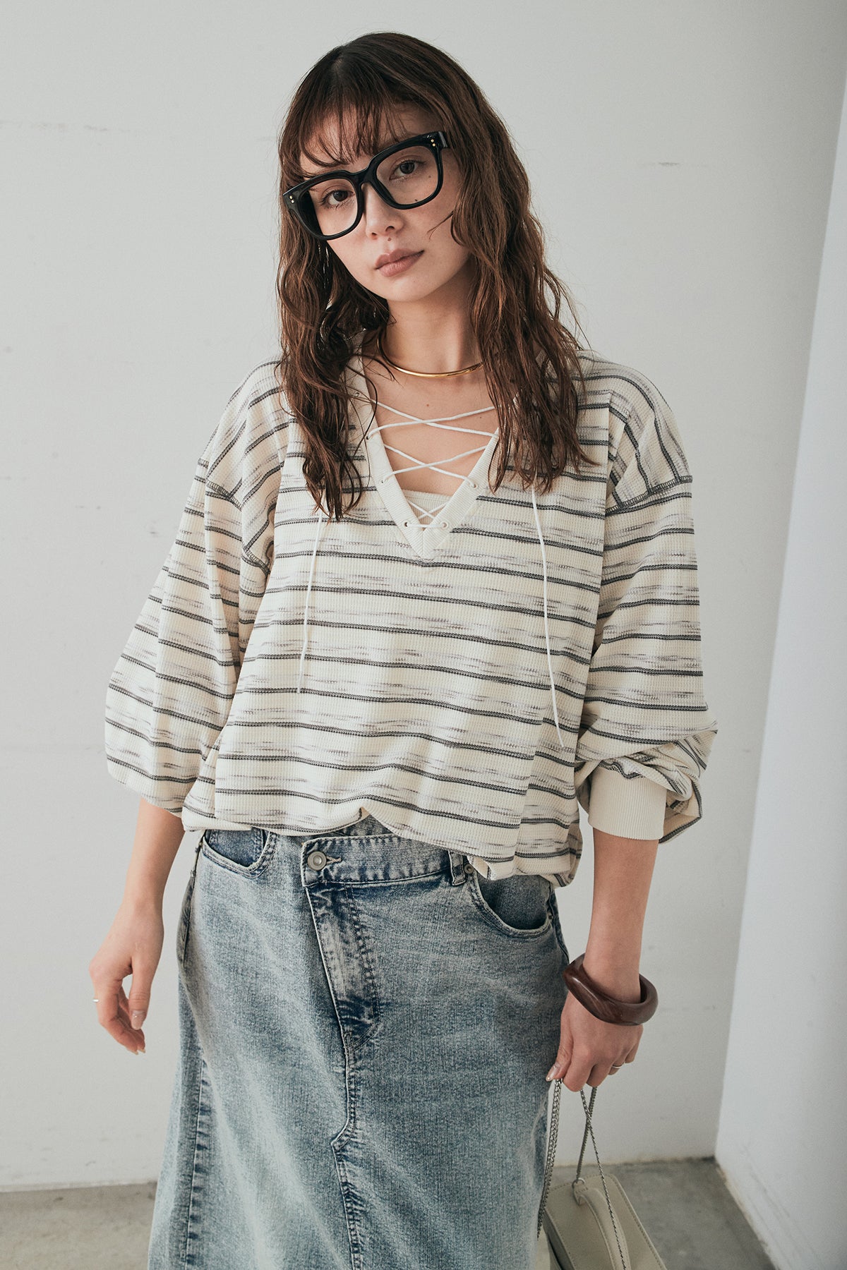 レースアップデザインが目を引く、ワッフルボーダートップス。 フロントのレースアップがさりげないアクセントになり、シンプルな中にもこなれ感をプラスします。 凹凸のあるワッフル素材はやわらかな肌触りで、程よい厚みがありながらも軽やかな着心地。ボーダー柄がカジュアルな雰囲気を演出しつつ、デコルテのレースアップデザインが女性らしさを引き立てます。 ほどよくゆとりのあるシルエットで、ボトムを選ばずバランスよく着こなせるのもポイント。デニムやワイドパンツと合わせたデイリースタイルはもちろん、スカートと合わせたミックスコーデもおすすめの一枚です。