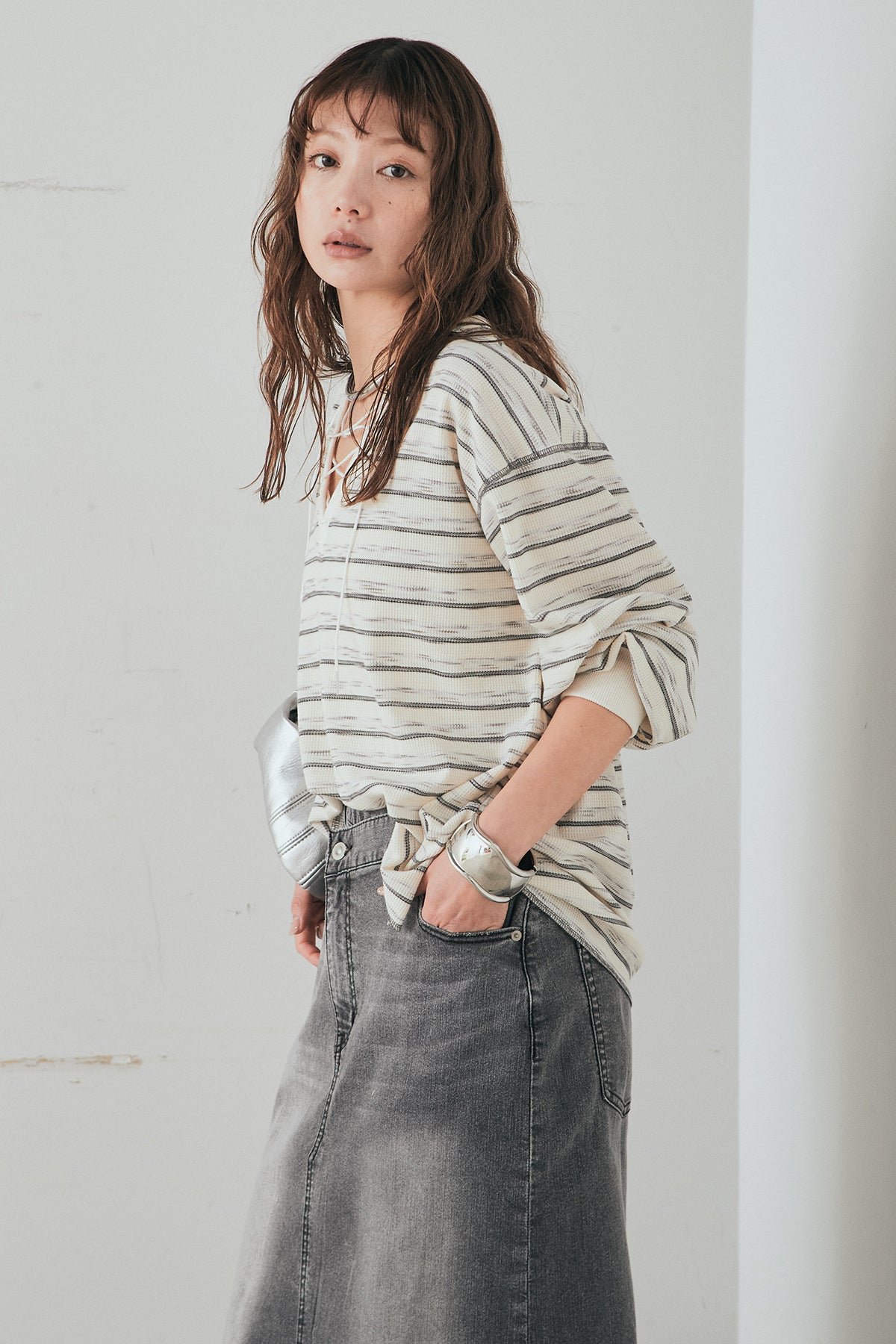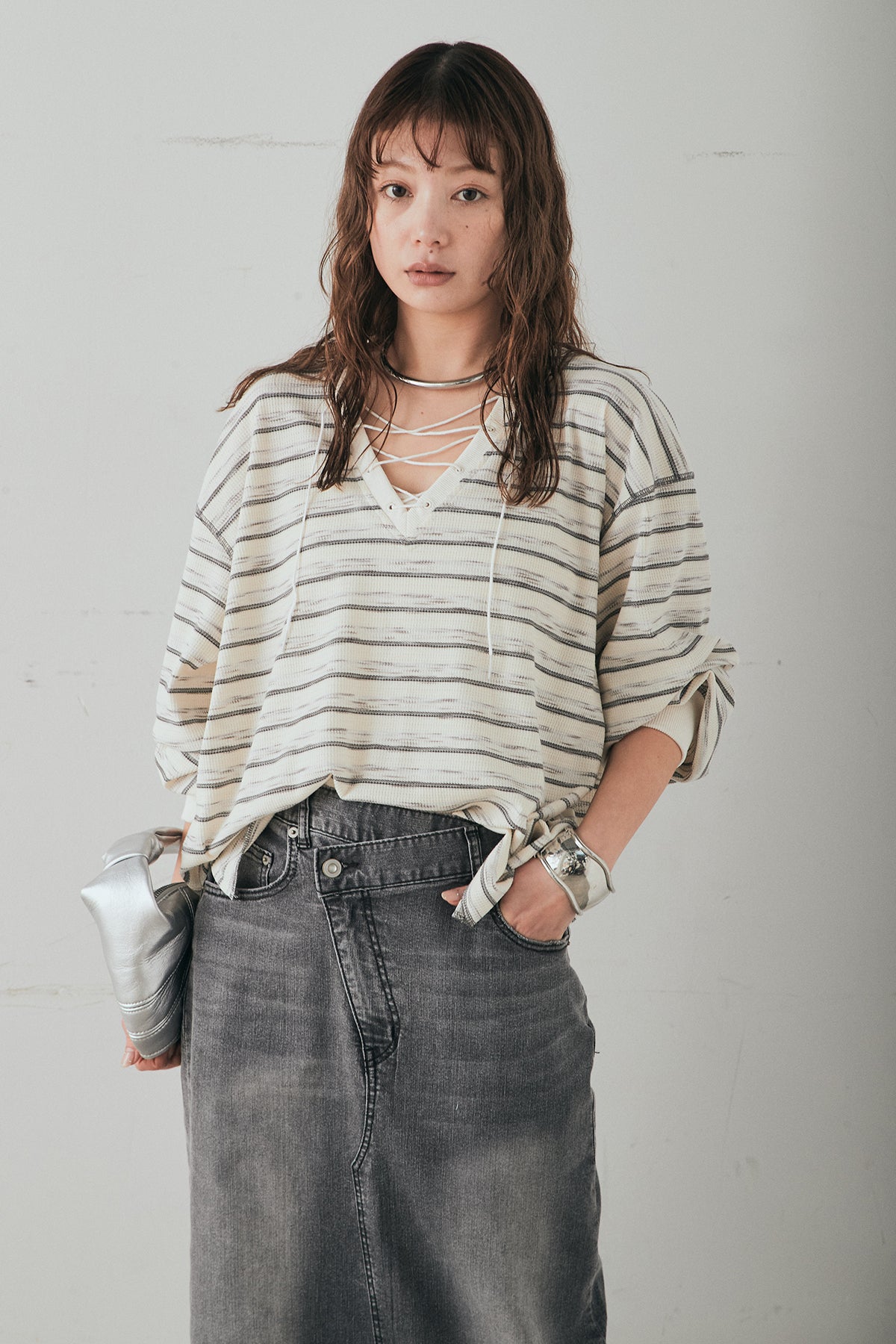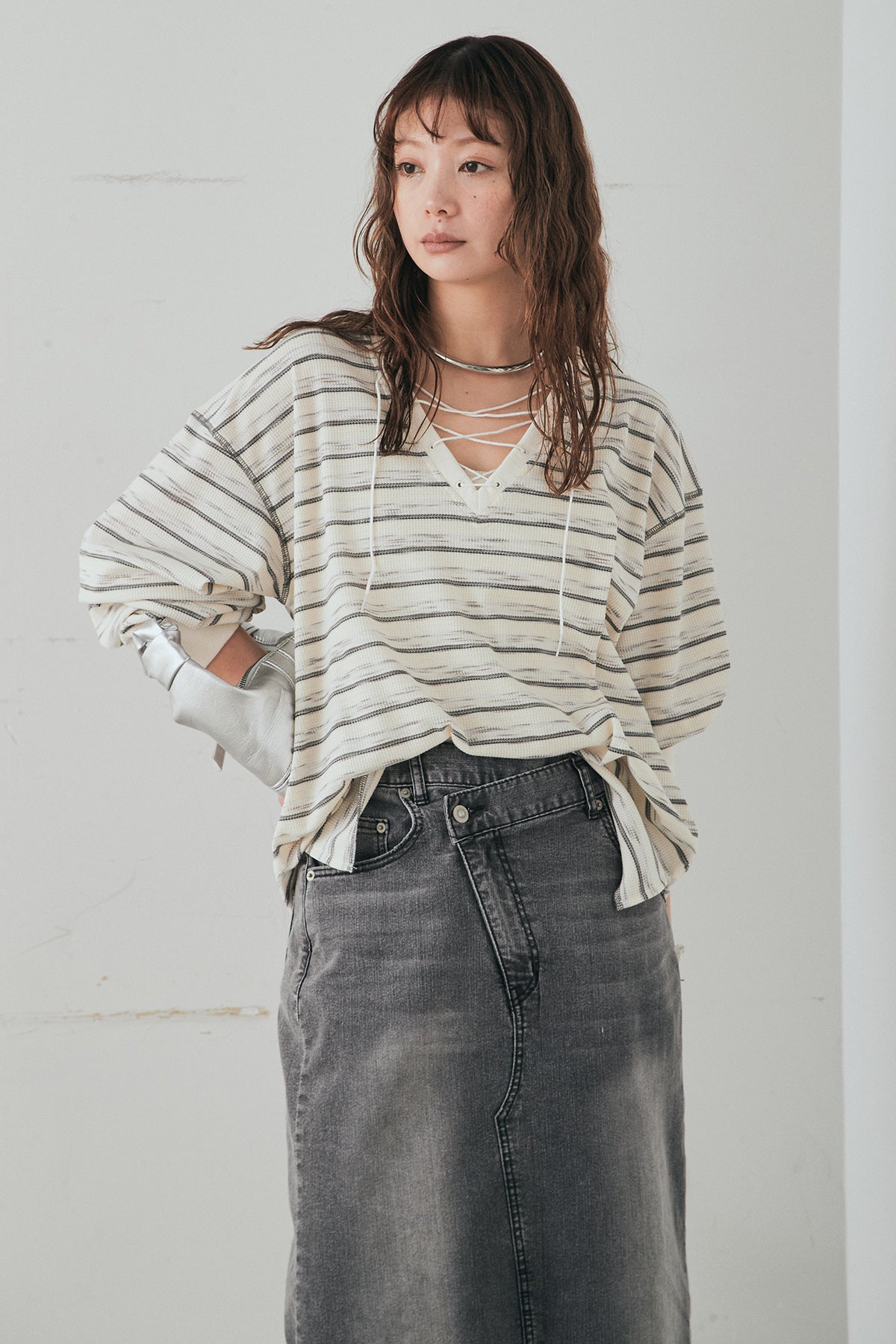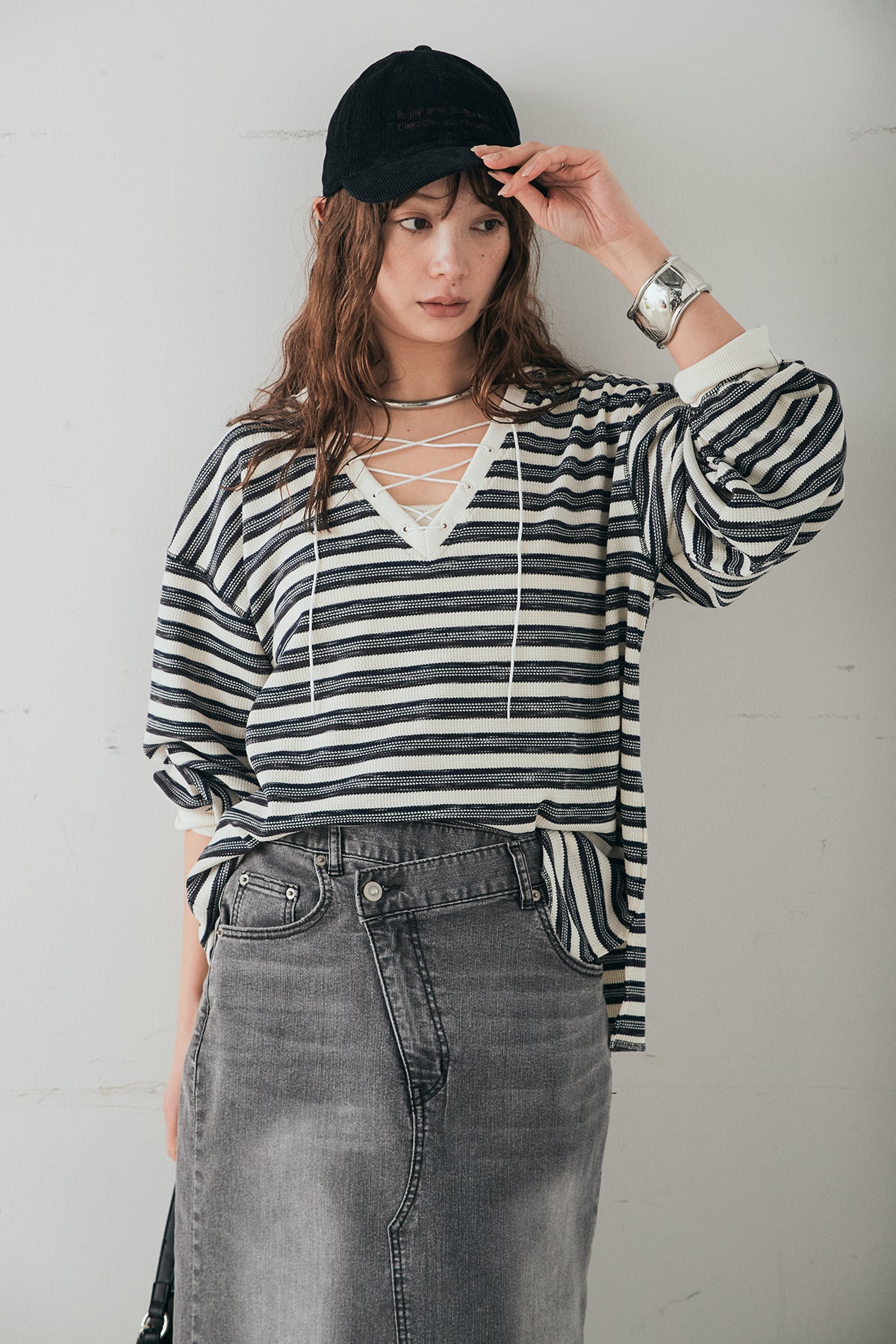 [SET]レースアップワッフルボーダートップス+ウエストクロスデニムタイトスカート(2set)