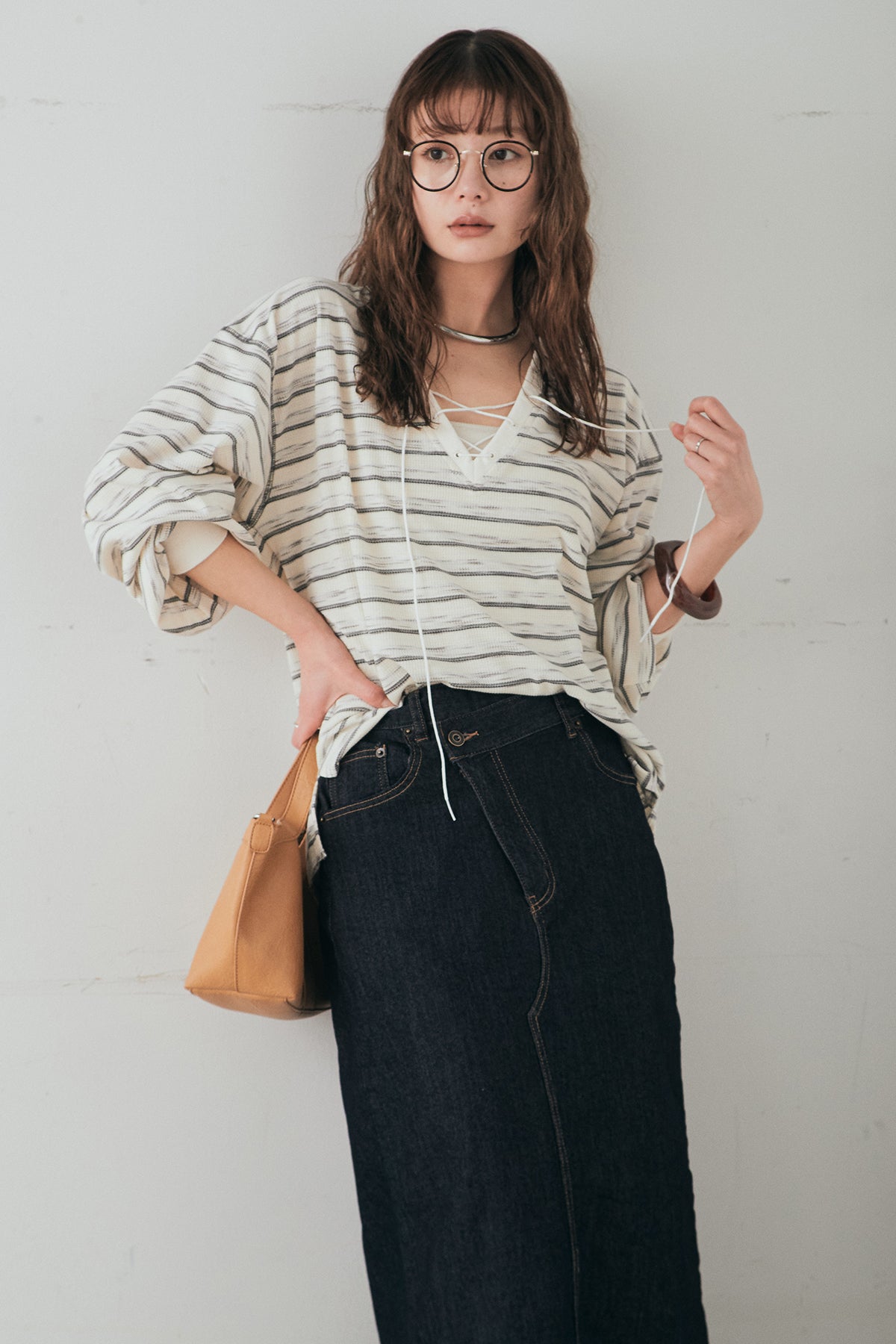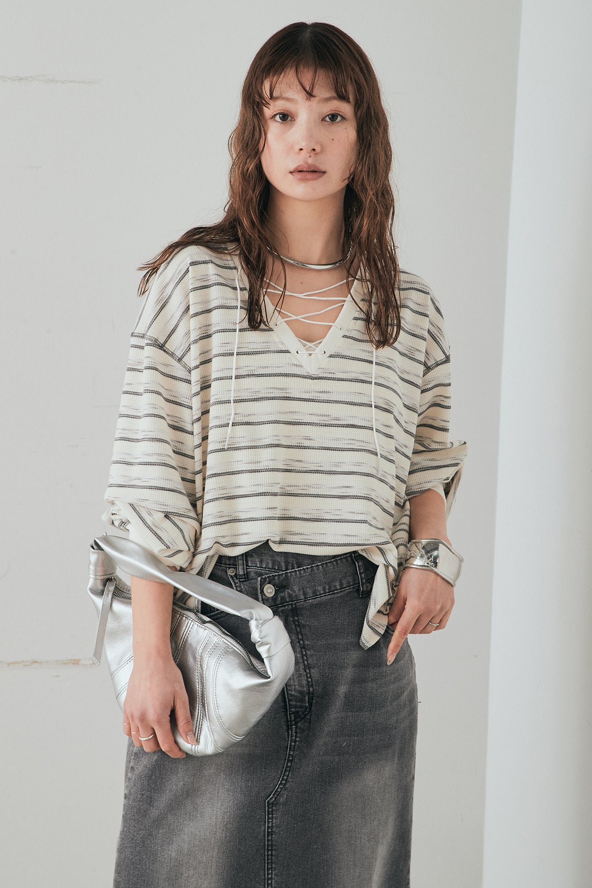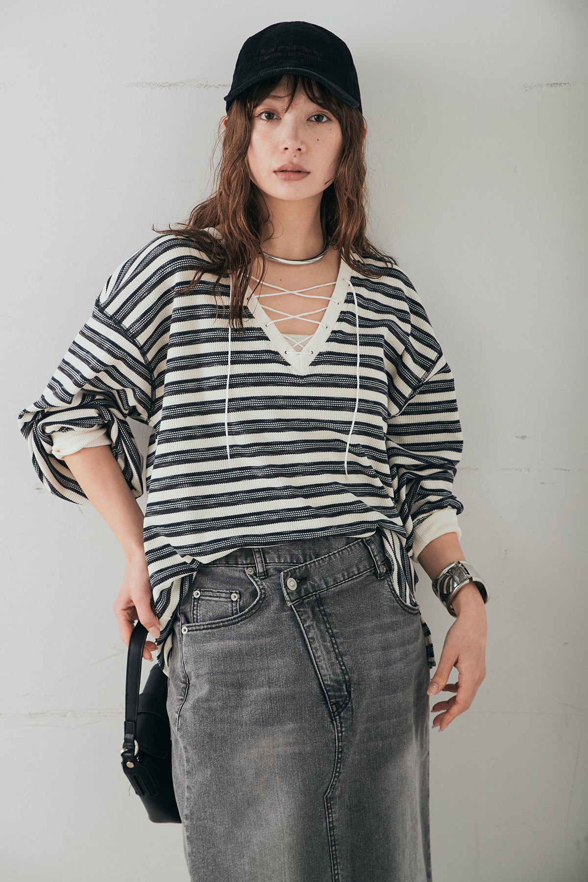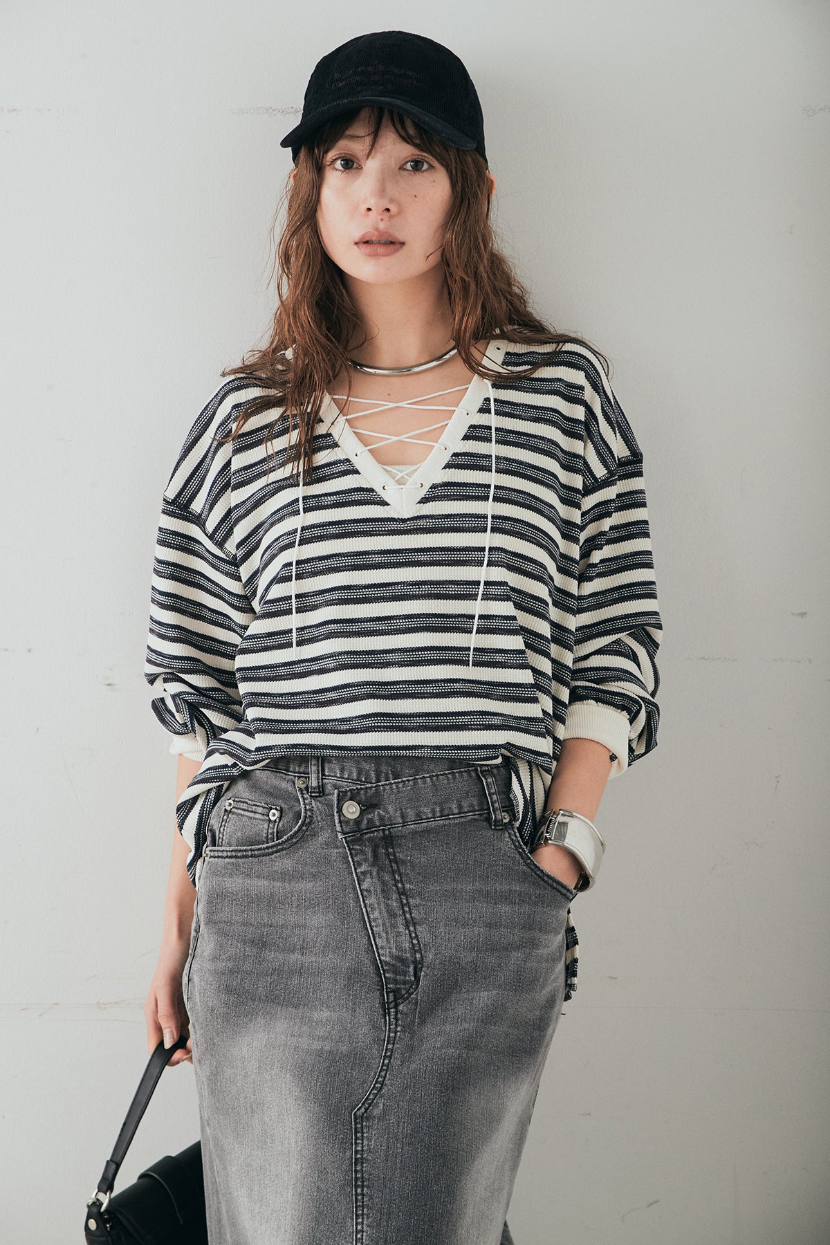 [SET]レースアップワッフルボーダートップス+ウエストクロスデニムタイトスカート(2set)