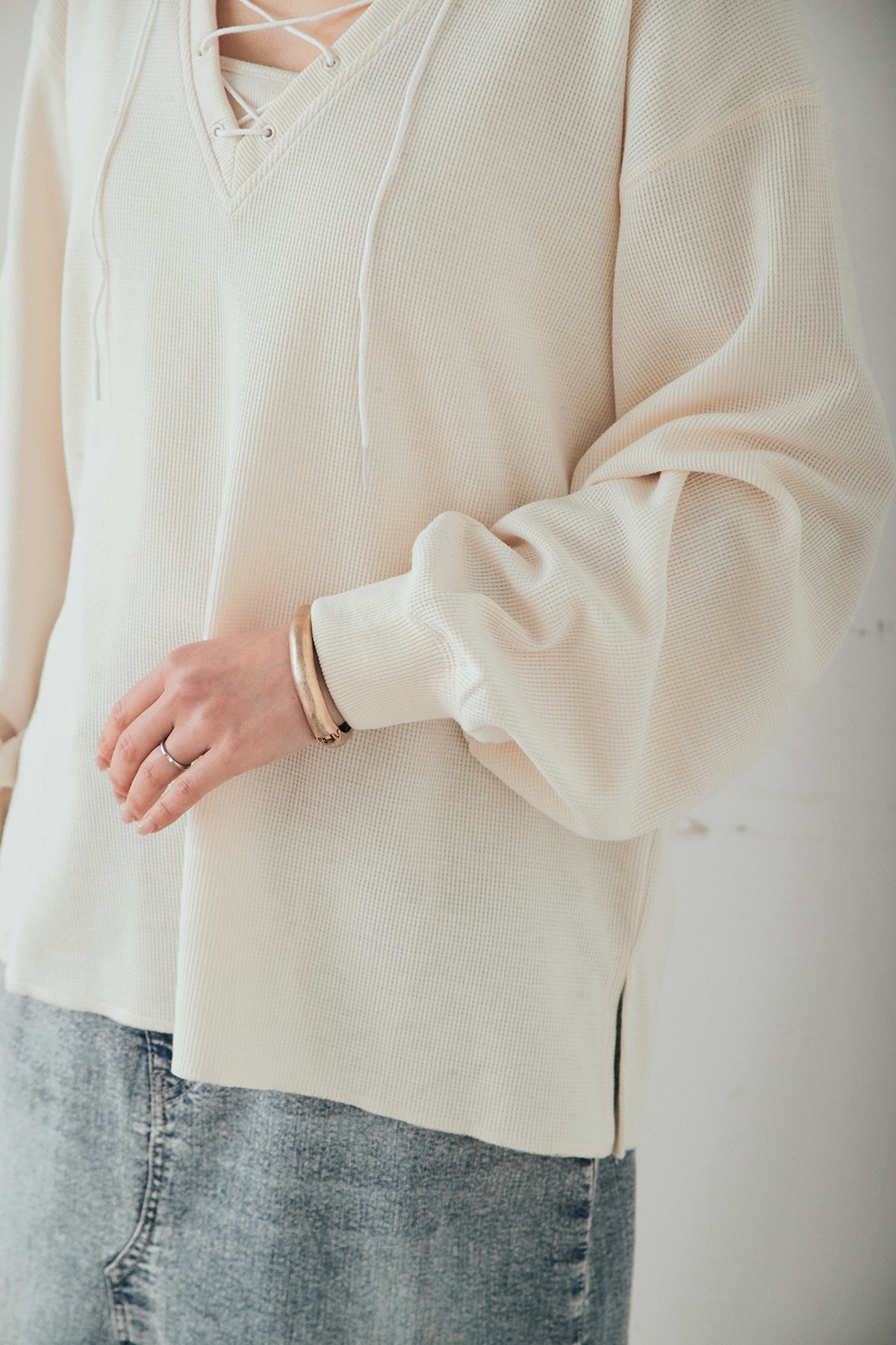 レースアップワッフルボーダートップス