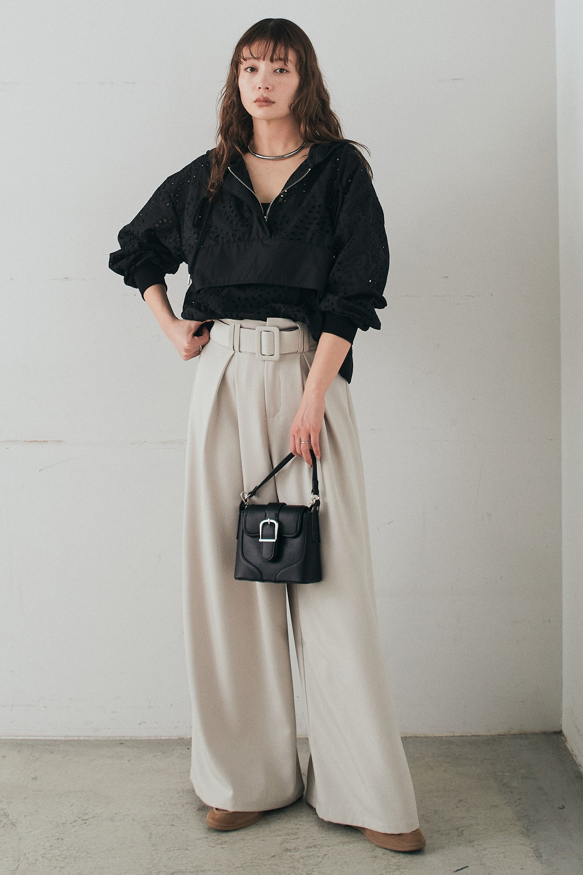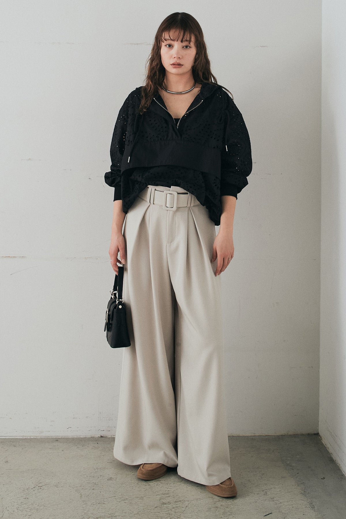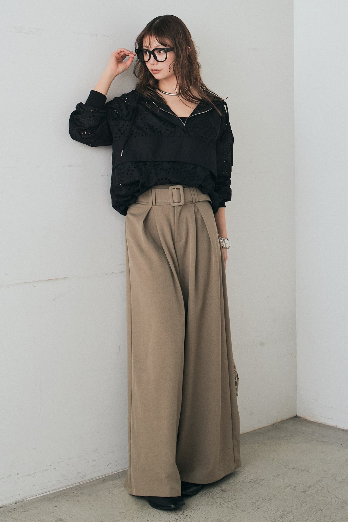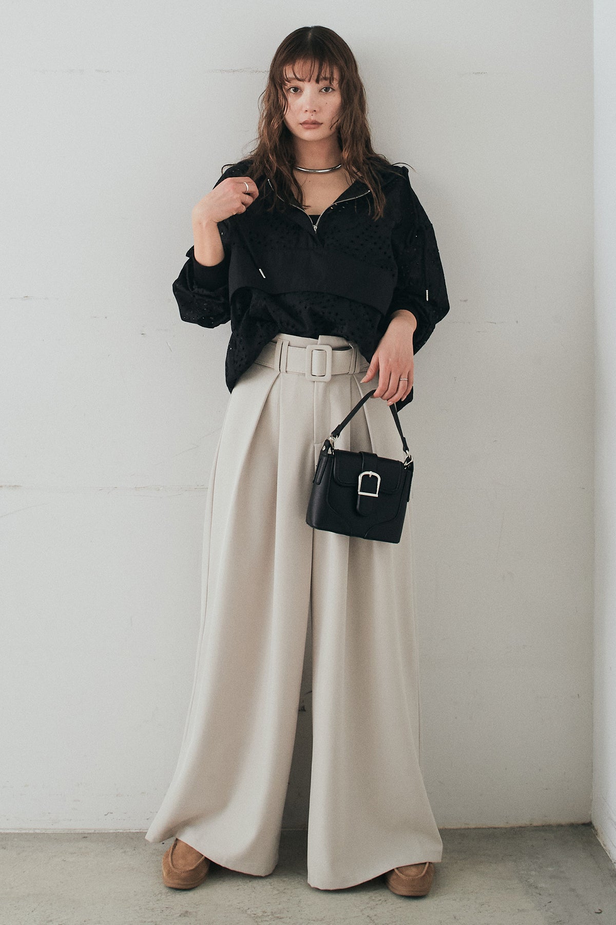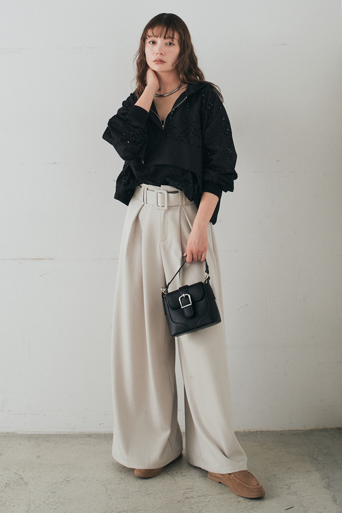 [SET]レースハーフジップアップフーディー+ベルト付きツータックワイドパンツ(2set)