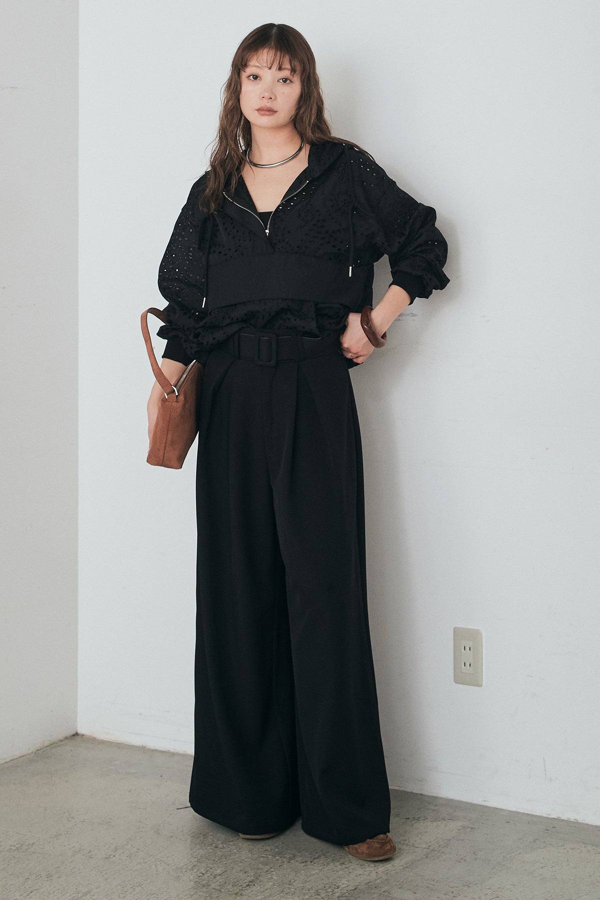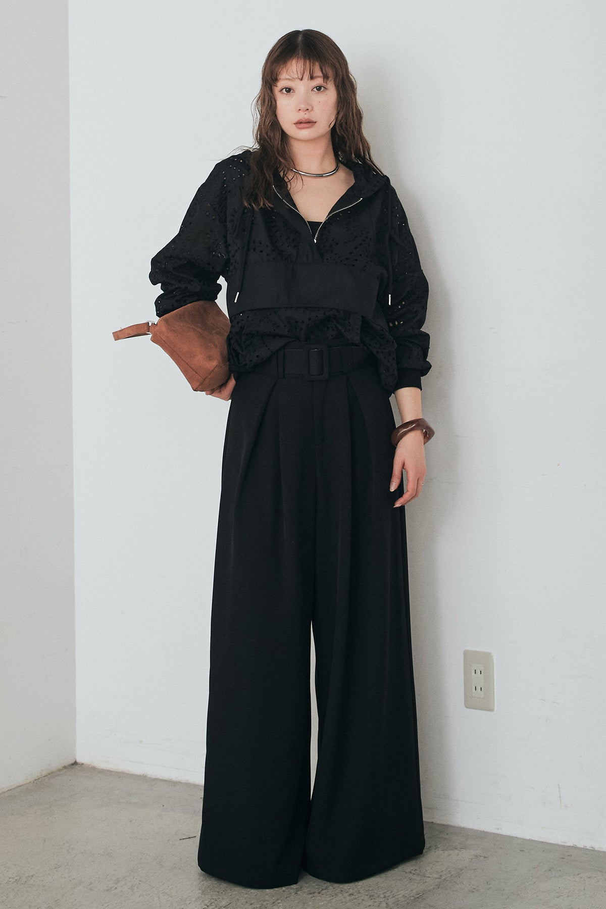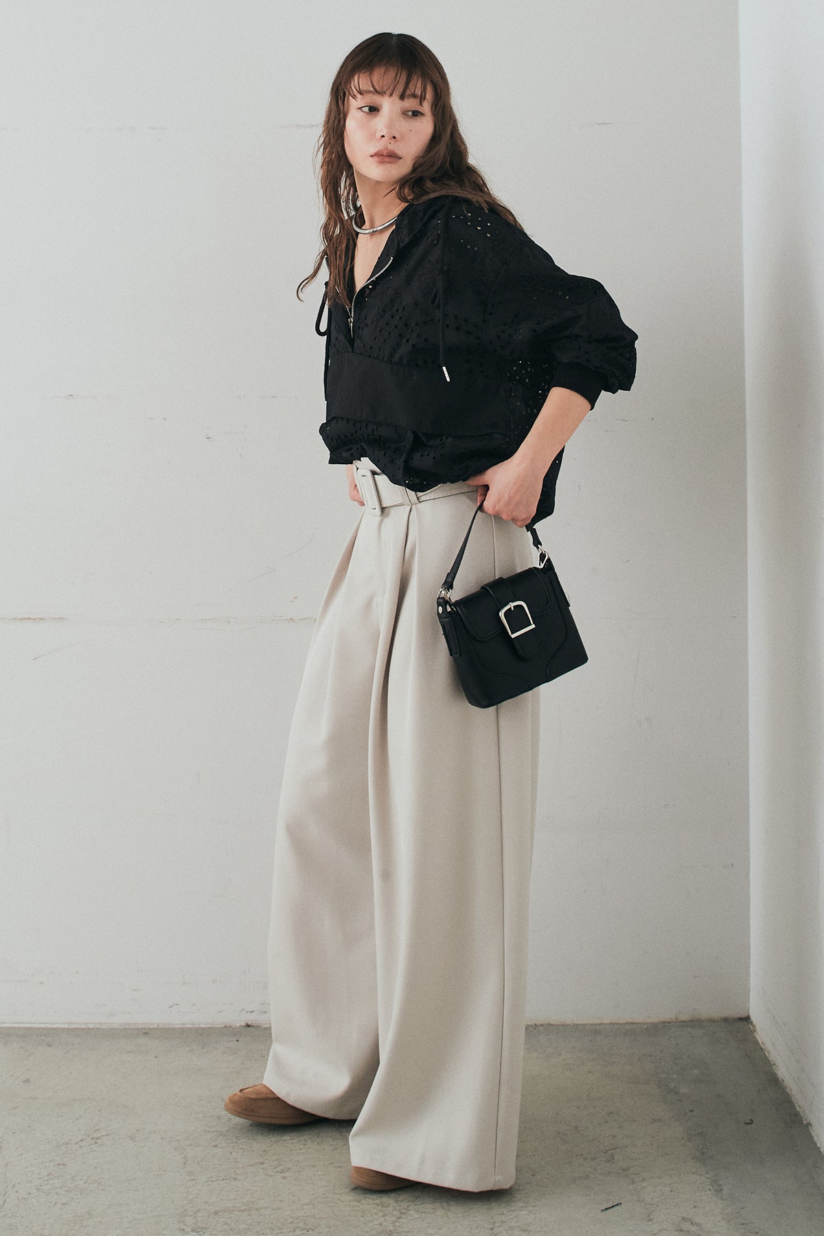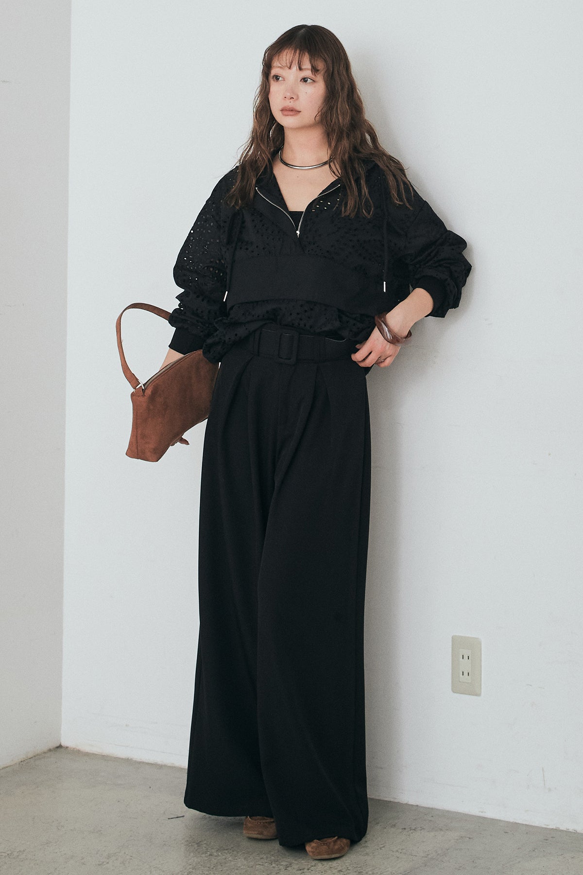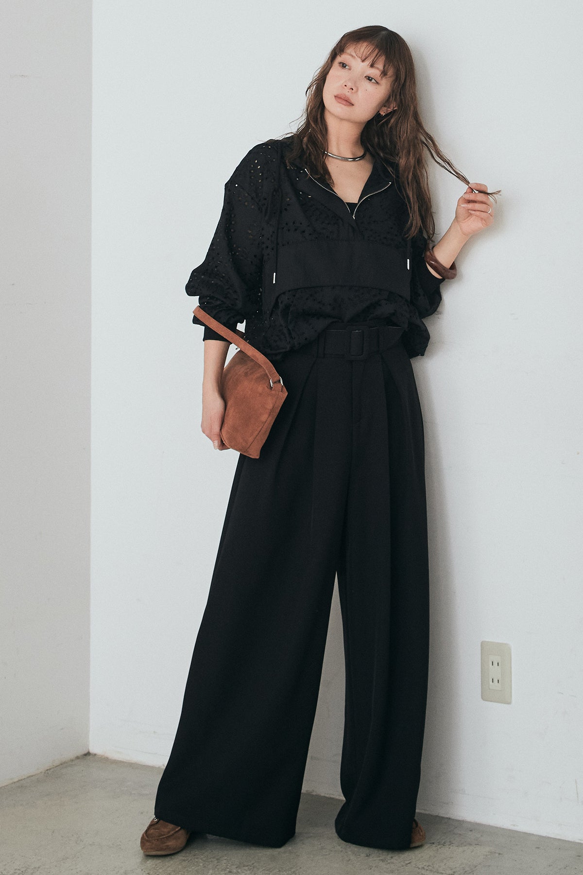 [SET]レースハーフジップアップフーディー+ベルト付きツータックワイドパンツ(2set)