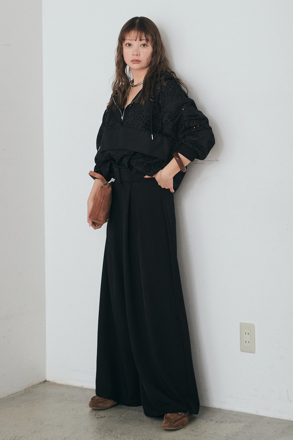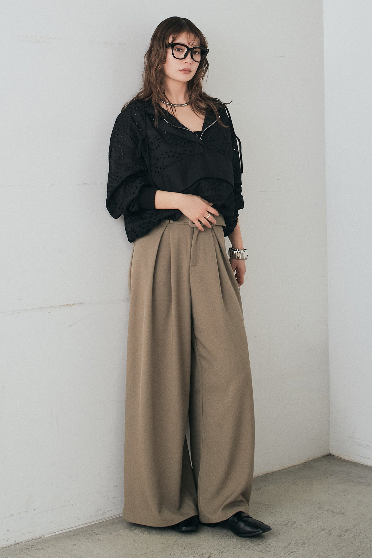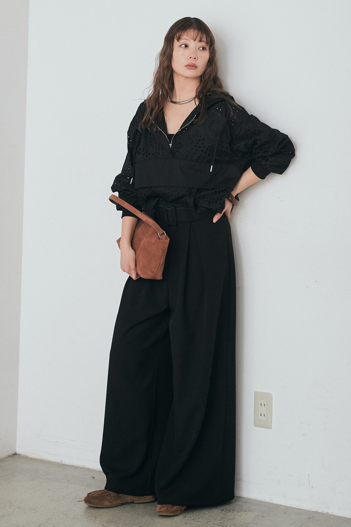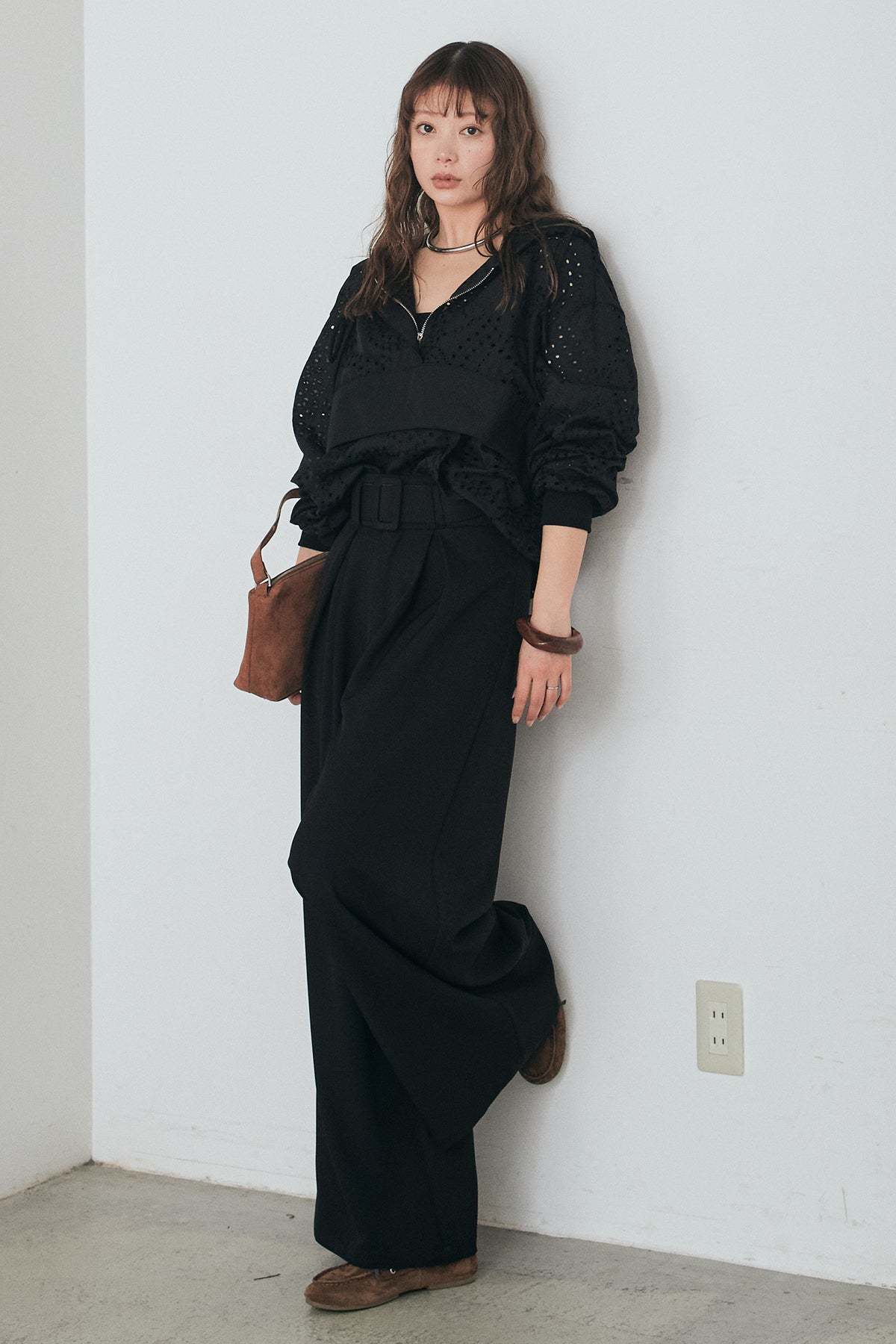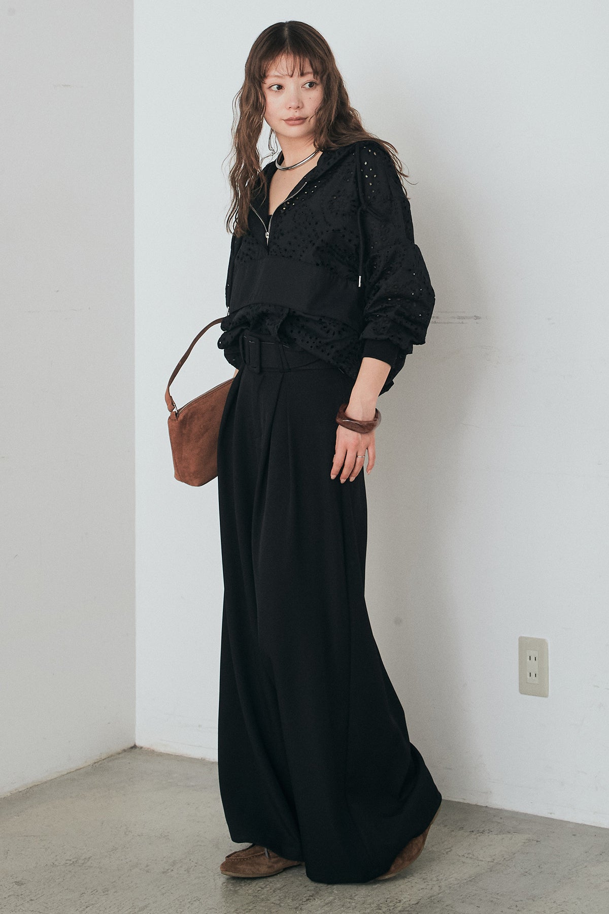 [SET]レースハーフジップアップフーディー+ベルト付きツータックワイドパンツ(2set)