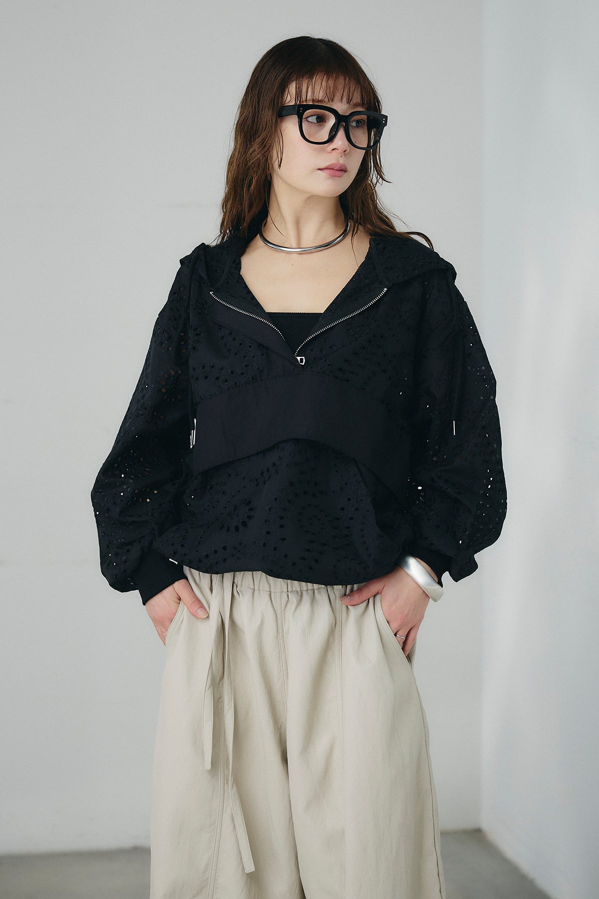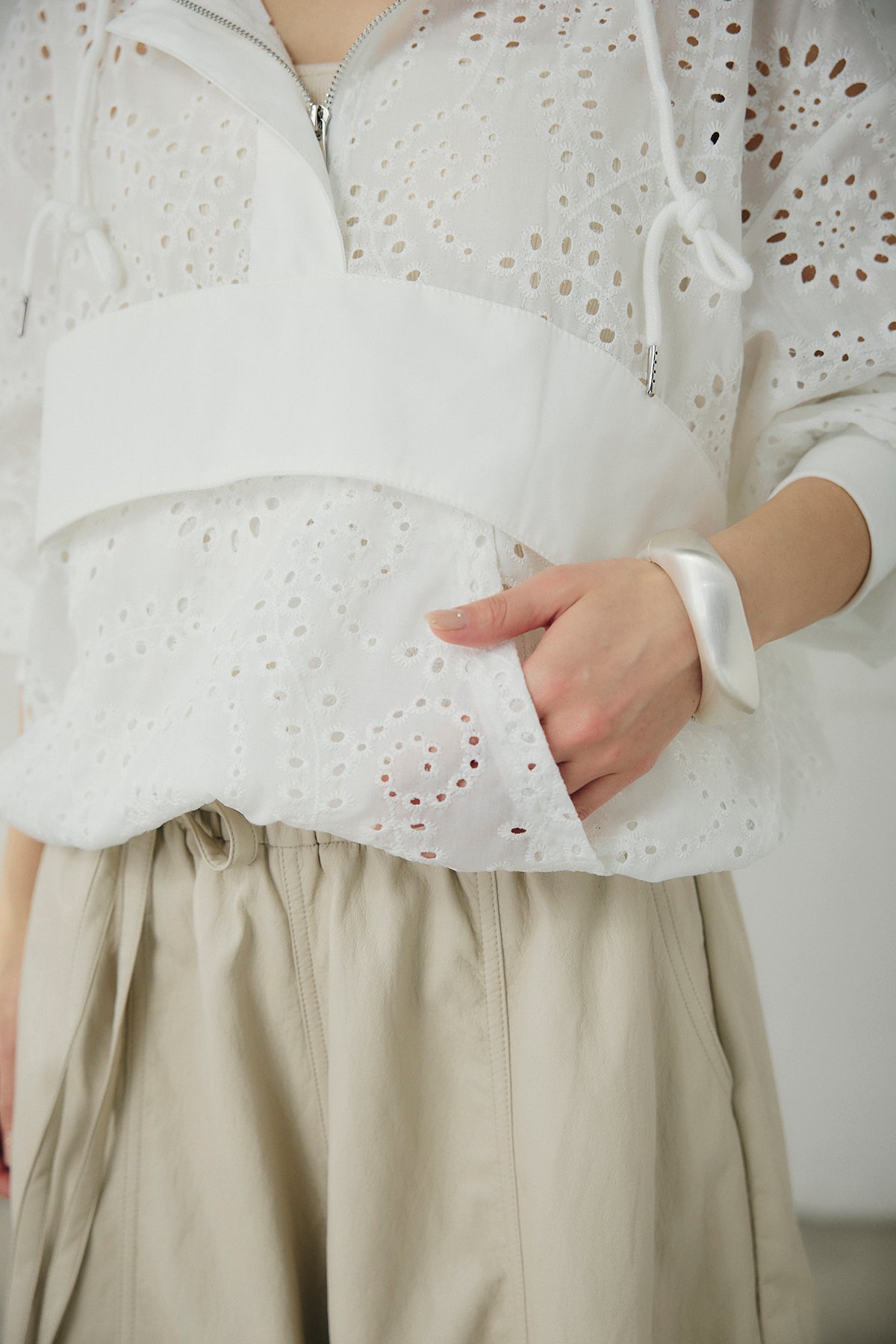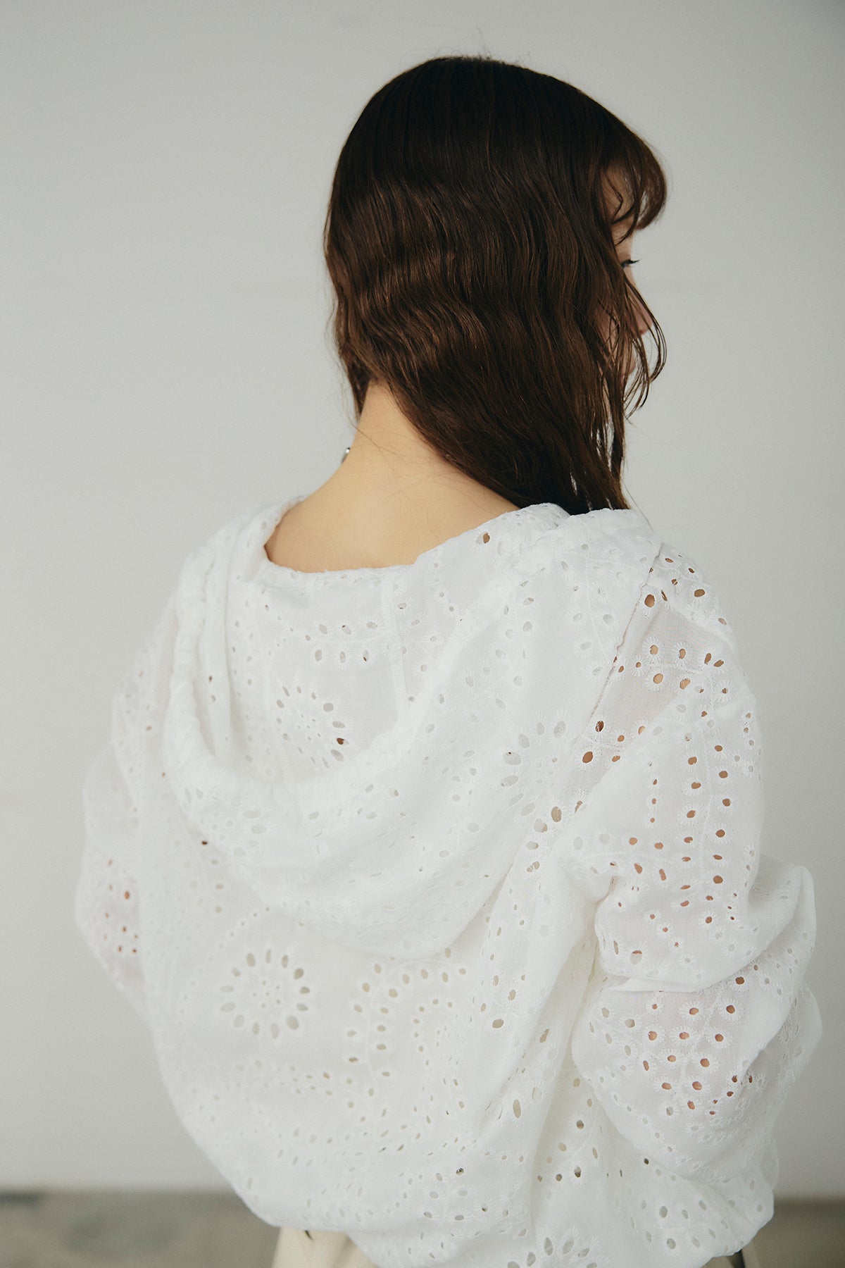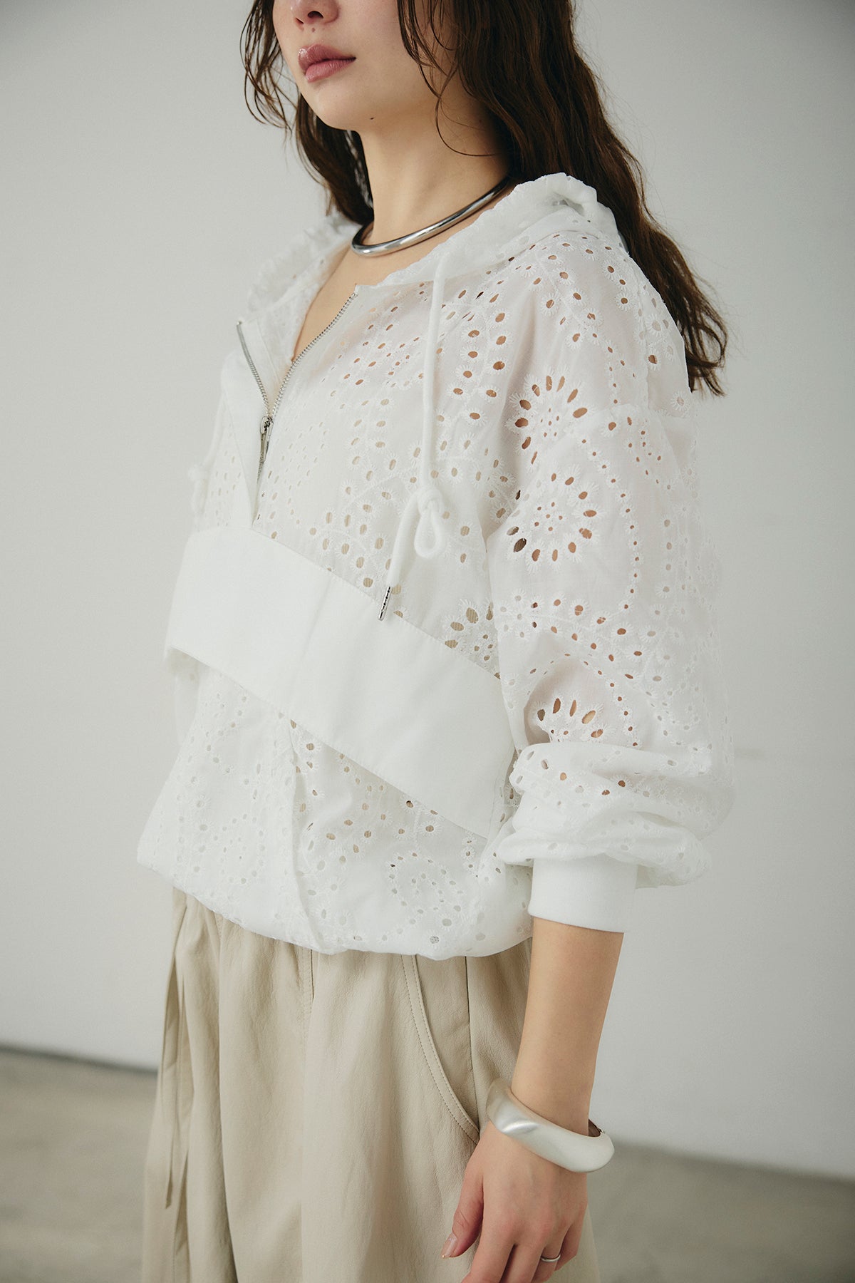 繊細なレース素材が軽やかな印象を添えるハーフジップアップフーディー。カジュアルなフードデザインに透け感のある素材を掛け合わせることで、抜け感のあるバランスに仕上げました。フロントのハーフジップがアクセントになり、開き具合で雰囲気を変えながら着こなしを楽しめます。ゆとりのあるシルエットと程よいボリュームスリーブが自然な動きを生み、レイヤードスタイルにも取り入れやすい一着。デニムやスラックス、スカートまで幅広く馴染み、日常のスタイリングに新鮮さをプラスしてくれます。