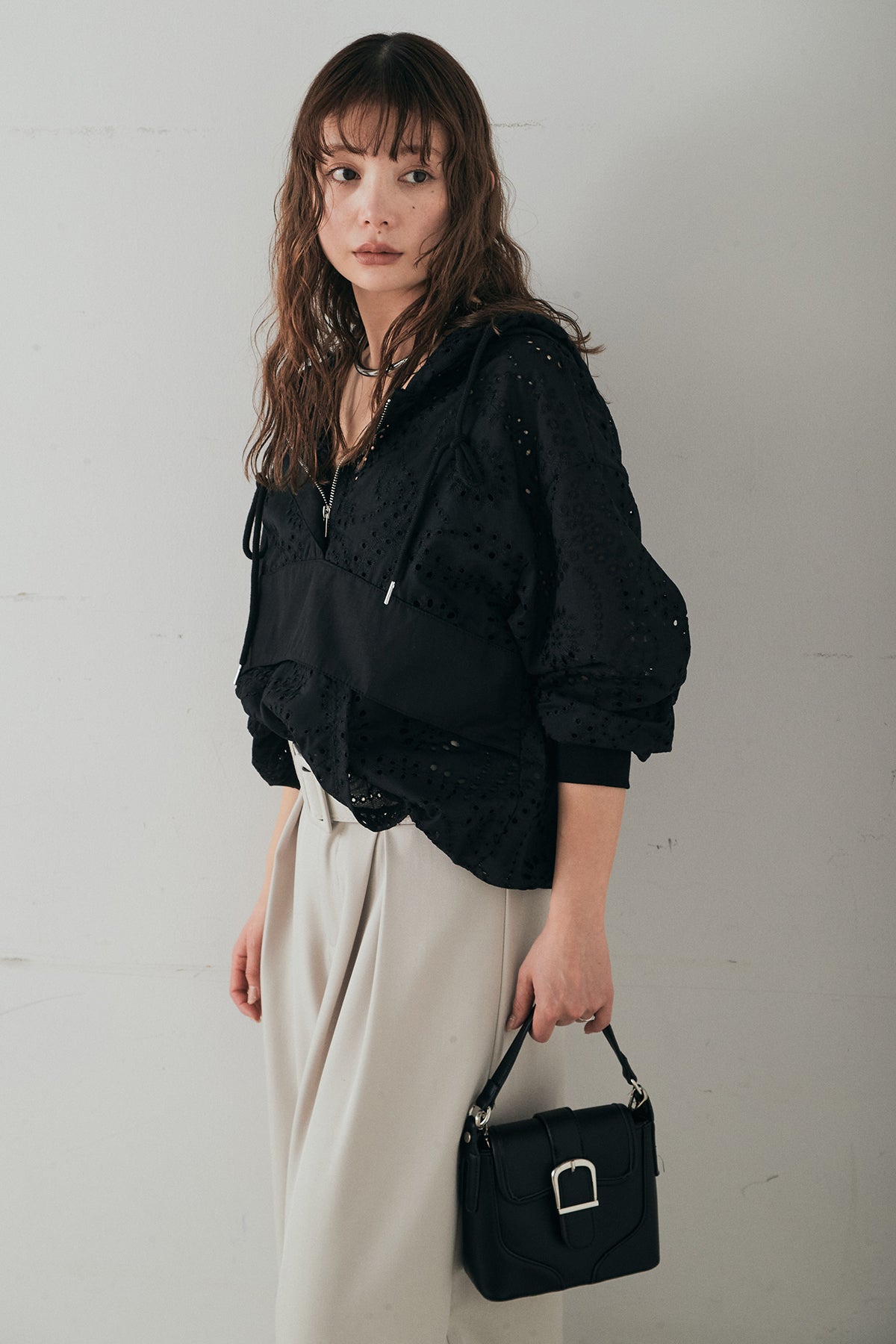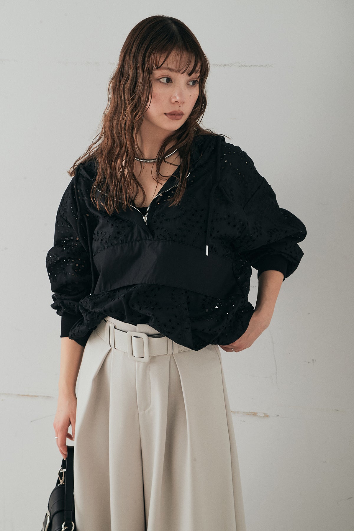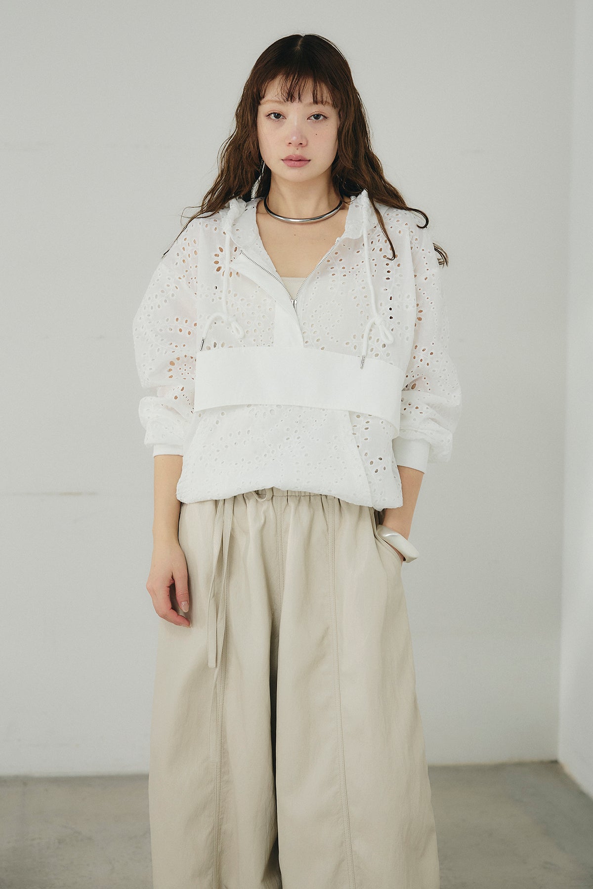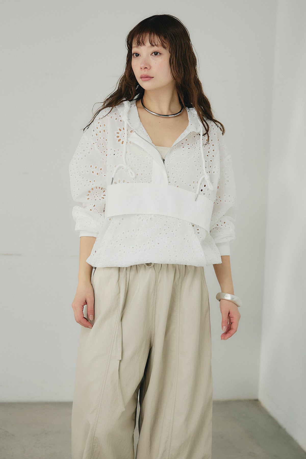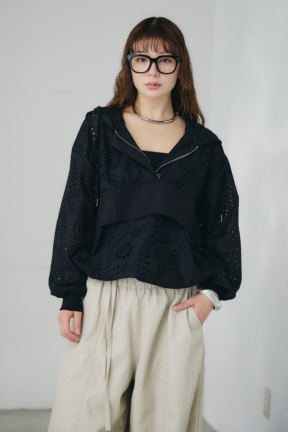 繊細なレース素材が軽やかな印象を添えるハーフジップアップフーディー。カジュアルなフードデザインに透け感のある素材を掛け合わせることで、抜け感のあるバランスに仕上げました。フロントのハーフジップがアクセントになり、開き具合で雰囲気を変えながら着こなしを楽しめます。ゆとりのあるシルエットと程よいボリュームスリーブが自然な動きを生み、レイヤードスタイルにも取り入れやすい一着。デニムやスラックス、スカートまで幅広く馴染み、日常のスタイリングに新鮮さをプラスしてくれます。