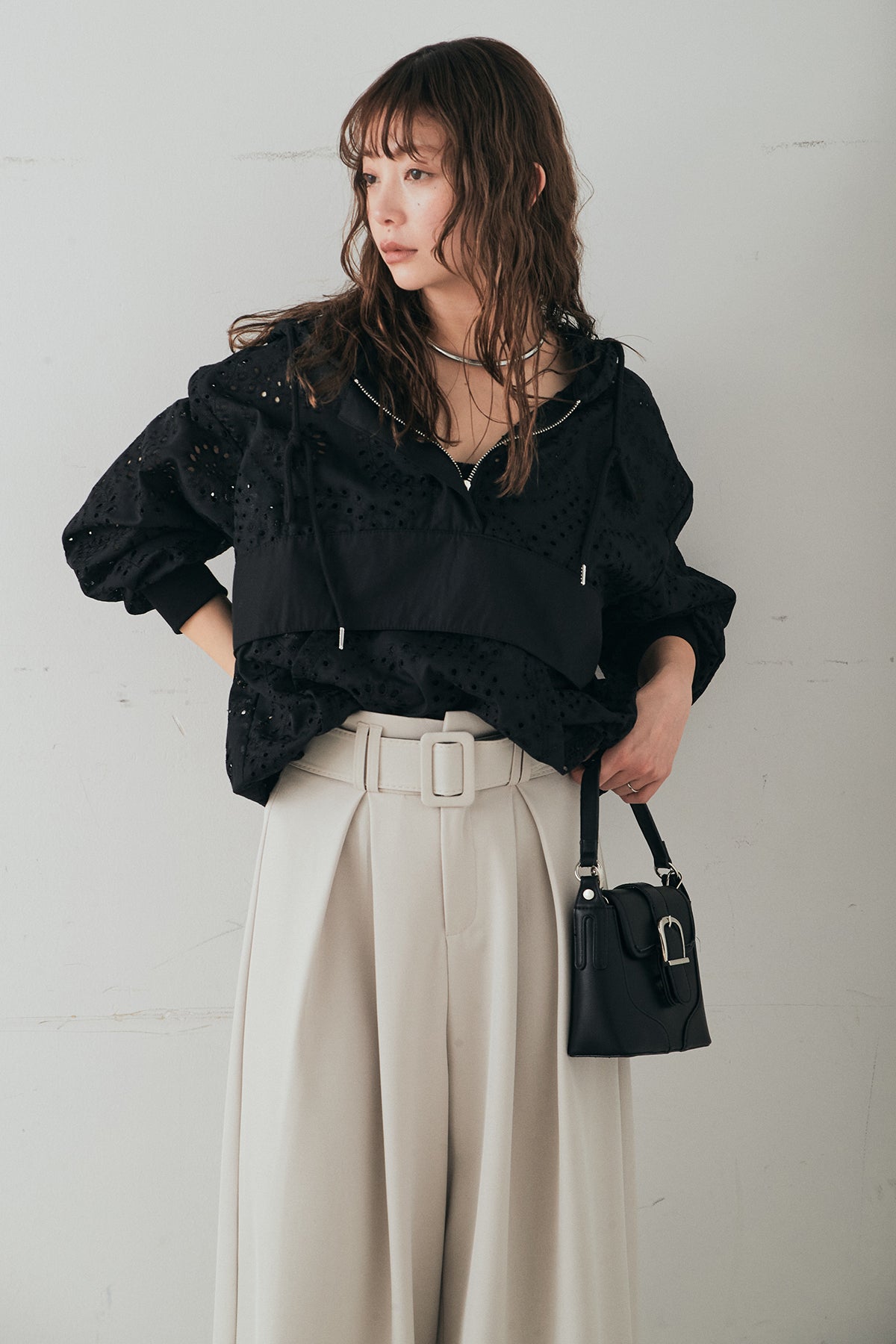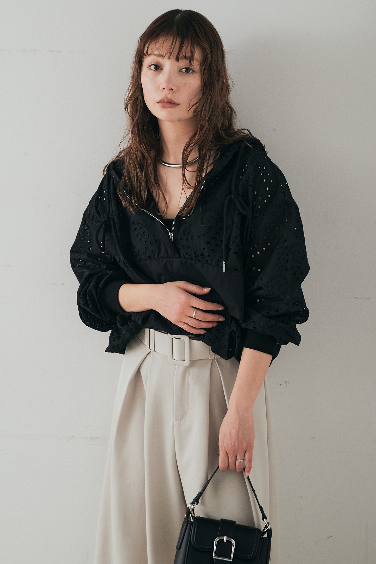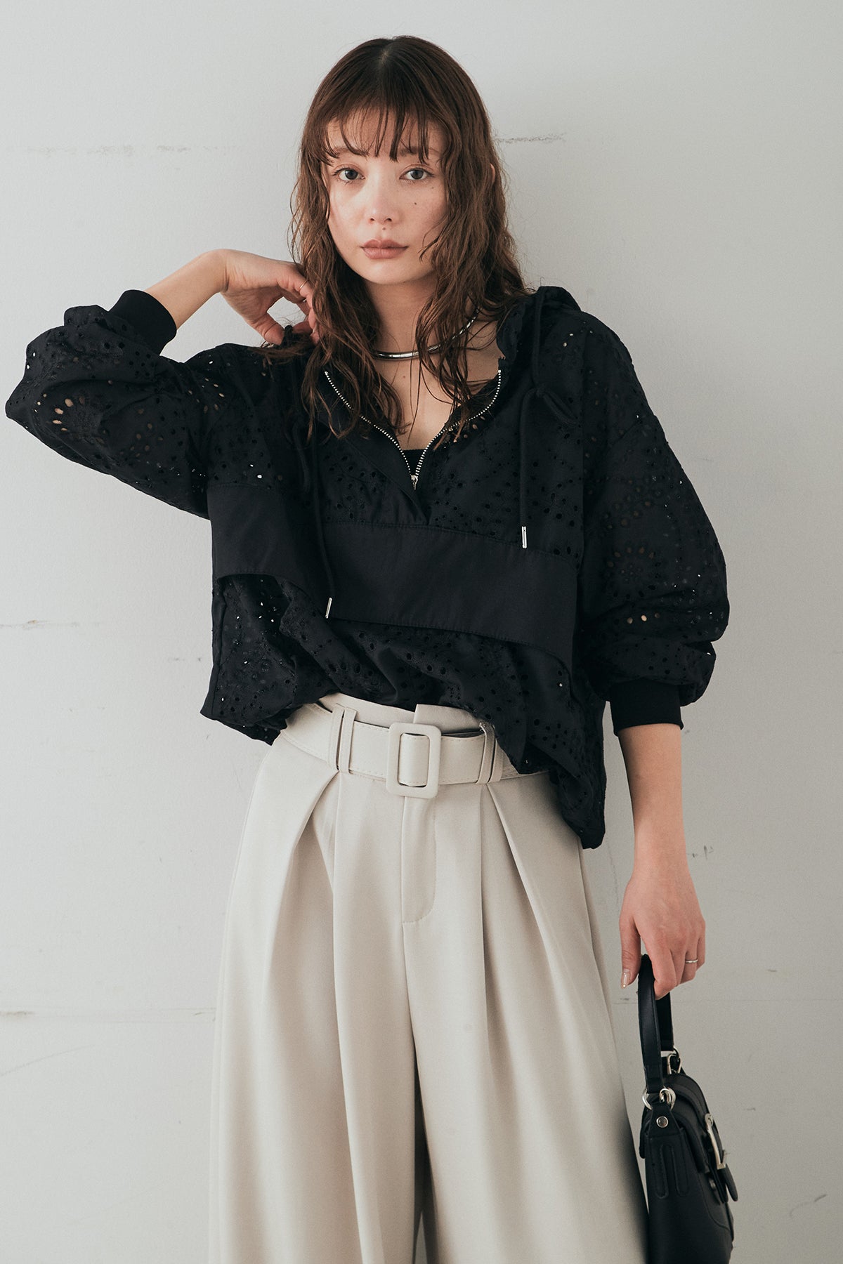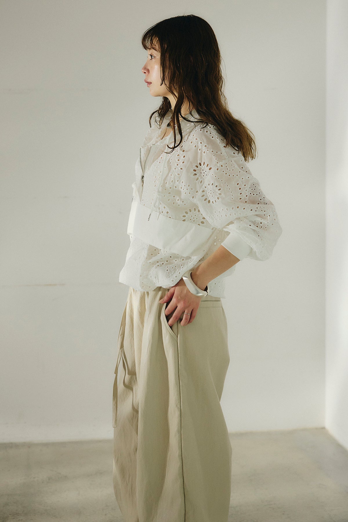 繊細なレース素材が軽やかな印象を添えるハーフジップアップフーディー。カジュアルなフードデザインに透け感のある素材を掛け合わせることで、抜け感のあるバランスに仕上げました。フロントのハーフジップがアクセントになり、開き具合で雰囲気を変えながら着こなしを楽しめます。ゆとりのあるシルエットと程よいボリュームスリーブが自然な動きを生み、レイヤードスタイルにも取り入れやすい一着。デニムやスラックス、スカートまで幅広く馴染み、日常のスタイリングに新鮮さをプラスしてくれます。