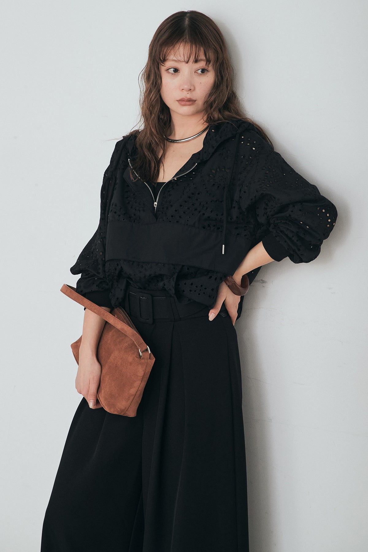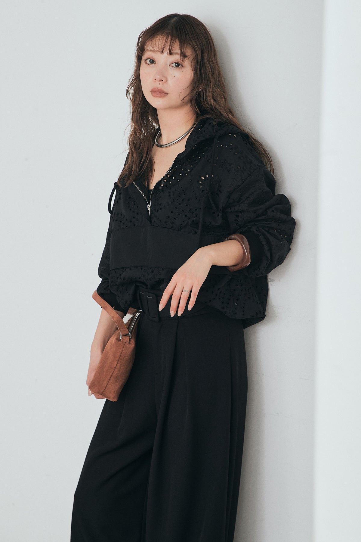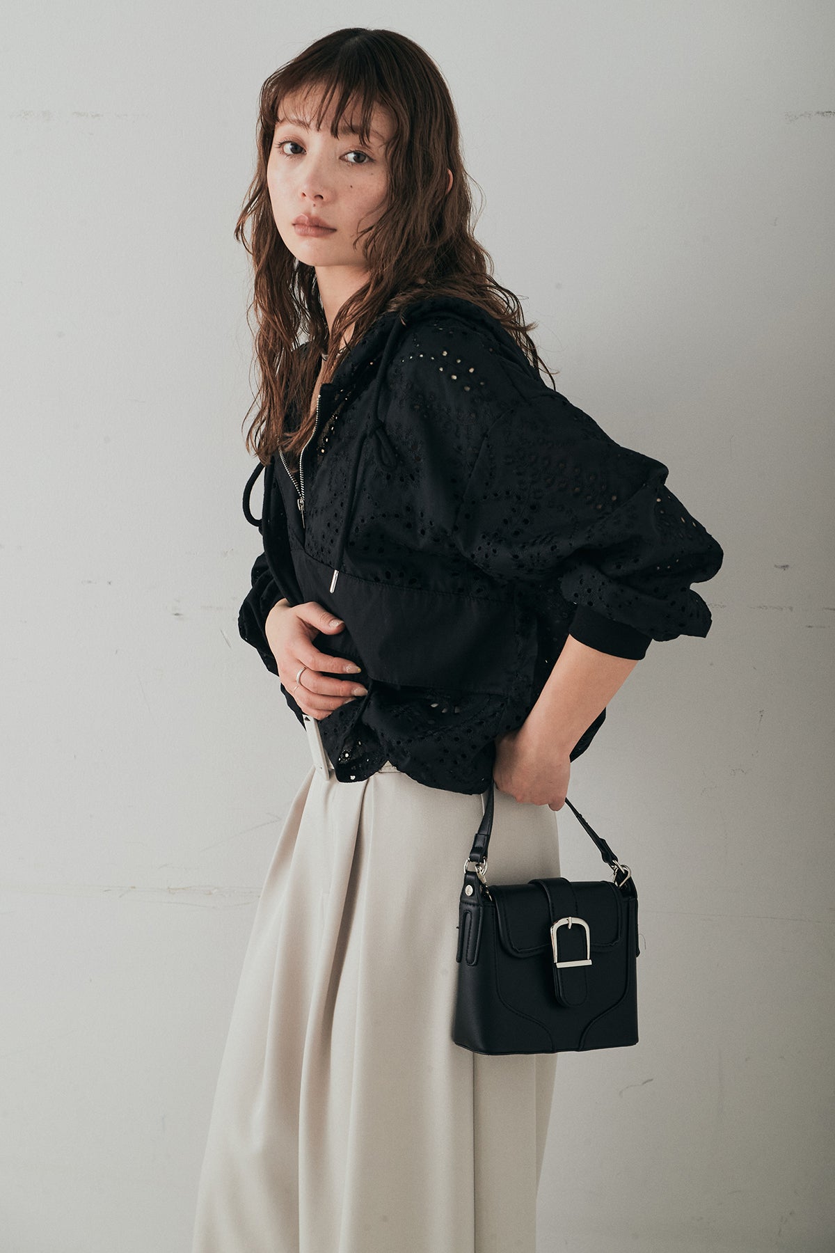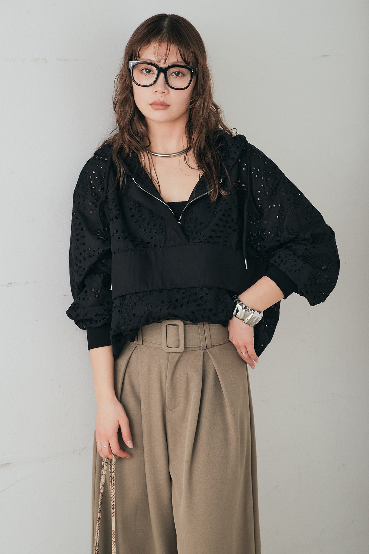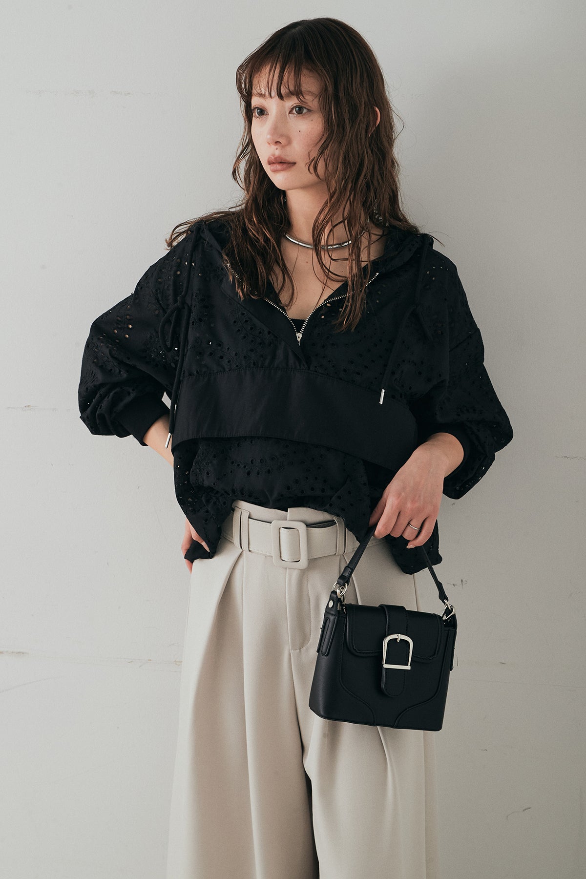 繊細なレース素材が軽やかな印象を添えるハーフジップアップフーディー。カジュアルなフードデザインに透け感のある素材を掛け合わせることで、抜け感のあるバランスに仕上げました。フロントのハーフジップがアクセントになり、開き具合で雰囲気を変えながら着こなしを楽しめます。ゆとりのあるシルエットと程よいボリュームスリーブが自然な動きを生み、レイヤードスタイルにも取り入れやすい一着。デニムやスラックス、スカートまで幅広く馴染み、日常のスタイリングに新鮮さをプラスしてくれます。