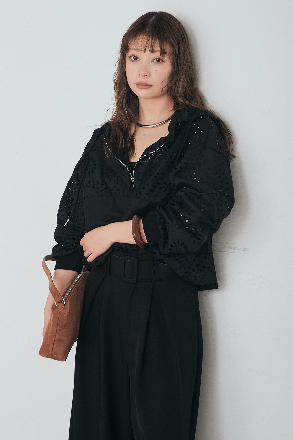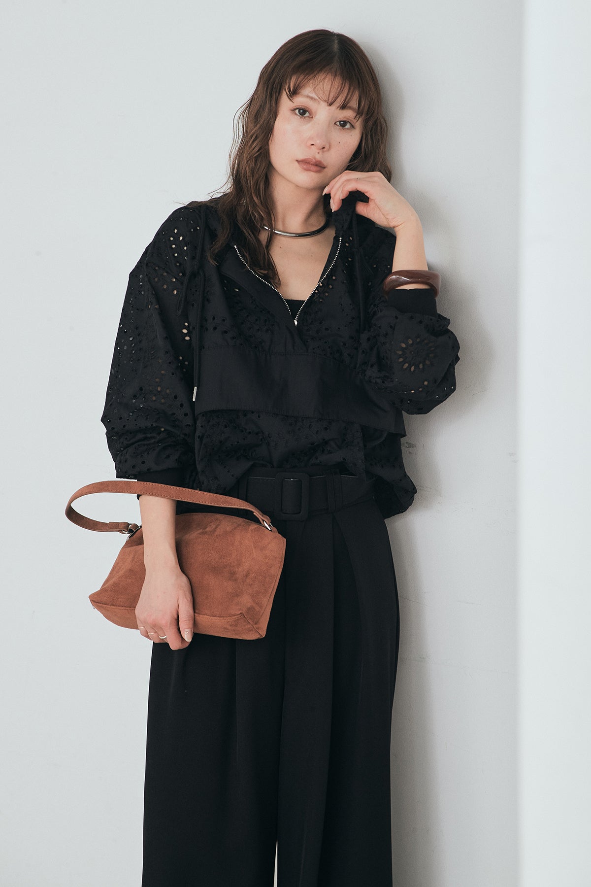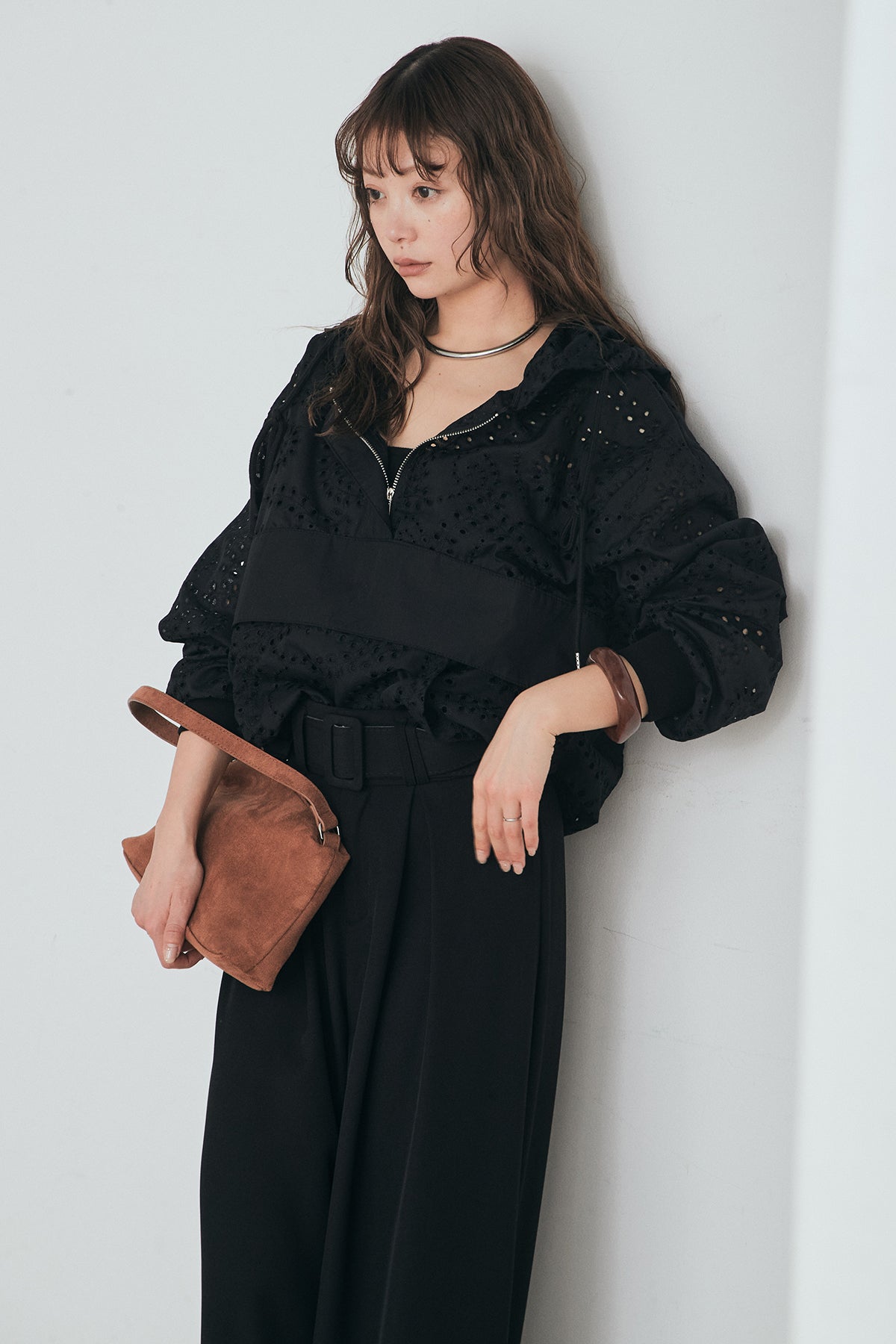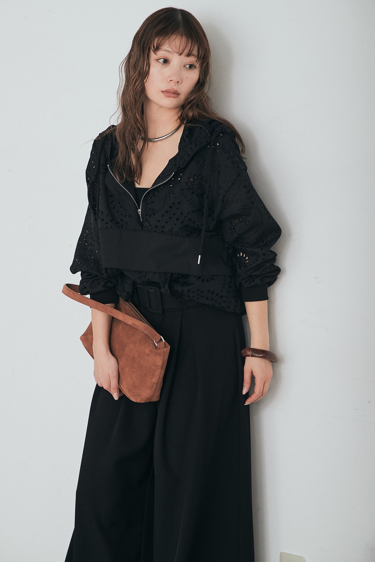 繊細なレース素材が軽やかな印象を添えるハーフジップアップフーディー。カジュアルなフードデザインに透け感のある素材を掛け合わせることで、抜け感のあるバランスに仕上げました。フロントのハーフジップがアクセントになり、開き具合で雰囲気を変えながら着こなしを楽しめます。ゆとりのあるシルエットと程よいボリュームスリーブが自然な動きを生み、レイヤードスタイルにも取り入れやすい一着。デニムやスラックス、スカートまで幅広く馴染み、日常のスタイリングに新鮮さをプラスしてくれます。