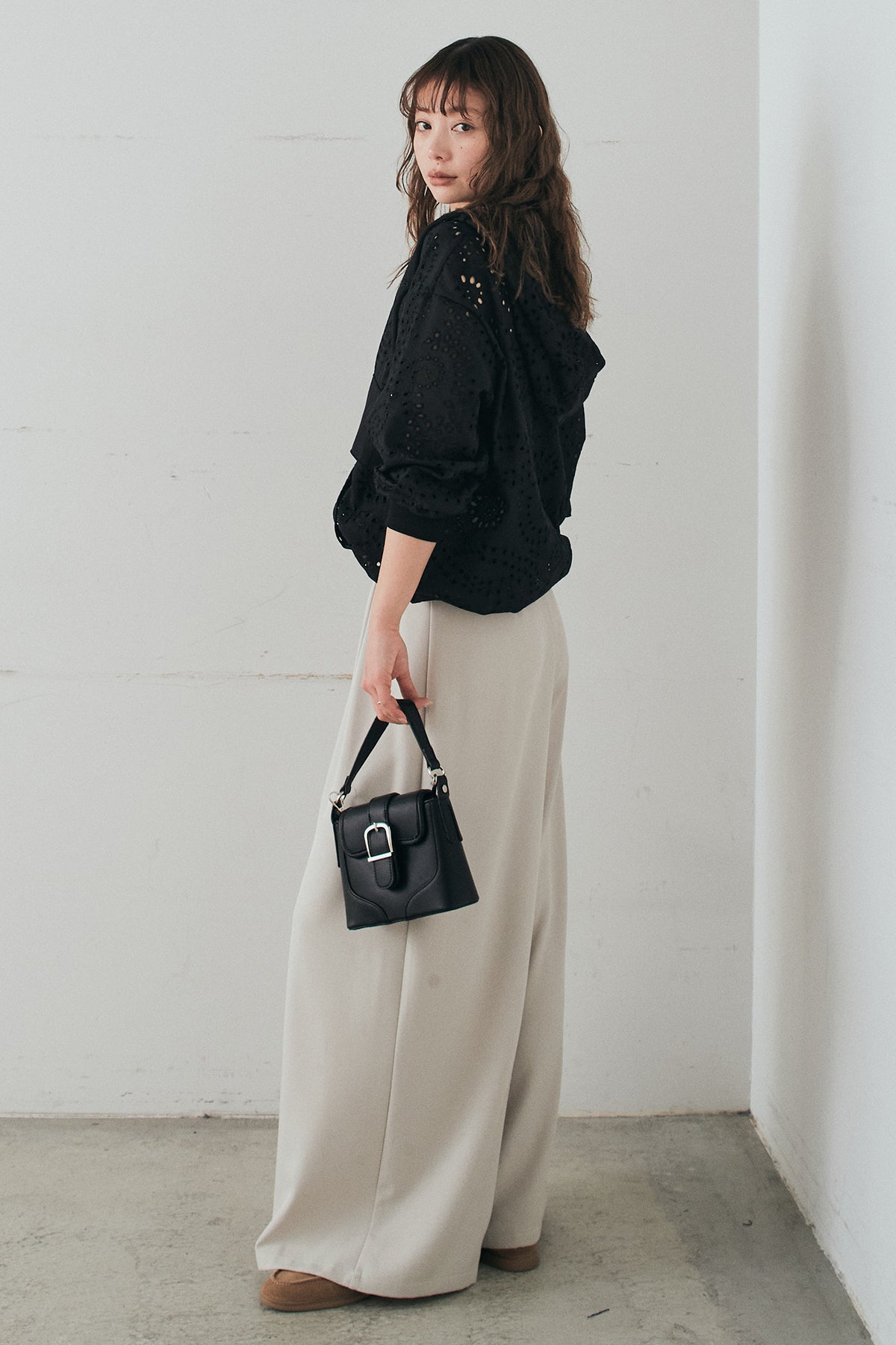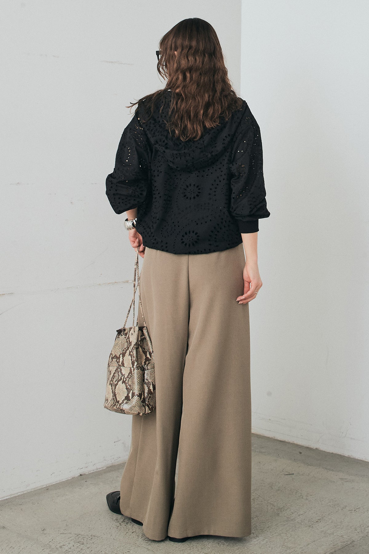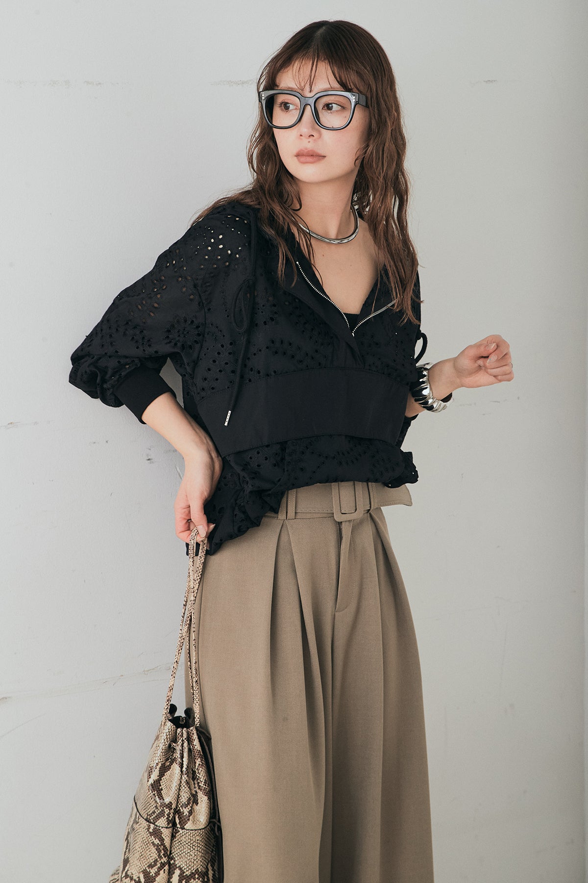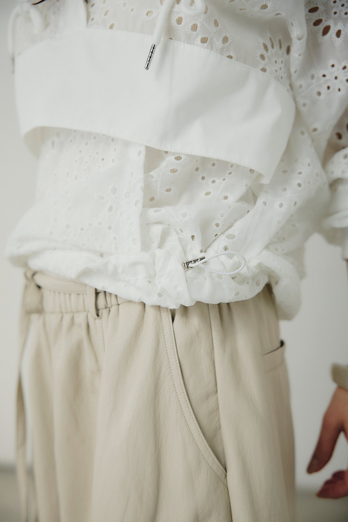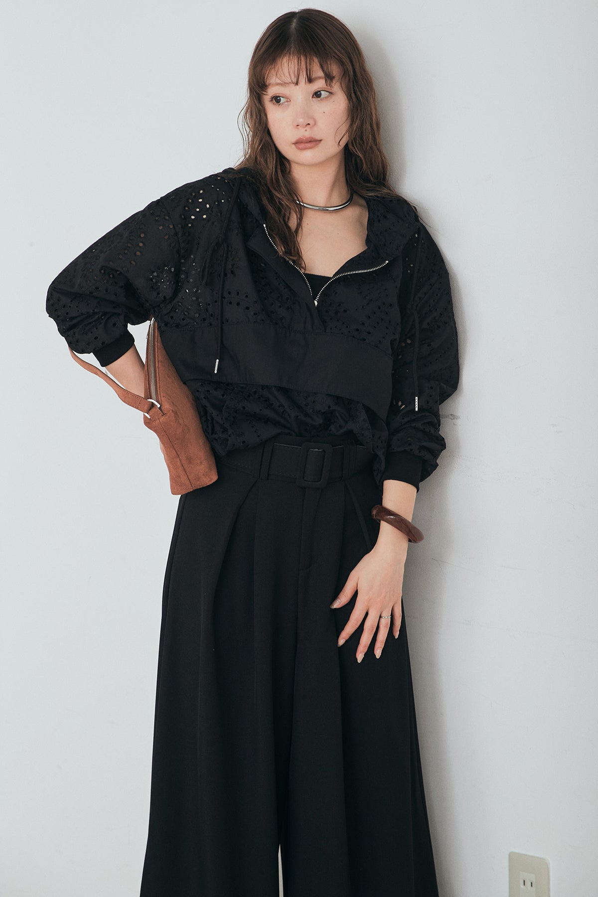 繊細なレース素材が軽やかな印象を添えるハーフジップアップフーディー。カジュアルなフードデザインに透け感のある素材を掛け合わせることで、抜け感のあるバランスに仕上げました。フロントのハーフジップがアクセントになり、開き具合で雰囲気を変えながら着こなしを楽しめます。ゆとりのあるシルエットと程よいボリュームスリーブが自然な動きを生み、レイヤードスタイルにも取り入れやすい一着。デニムやスラックス、スカートまで幅広く馴染み、日常のスタイリングに新鮮さをプラスしてくれます。