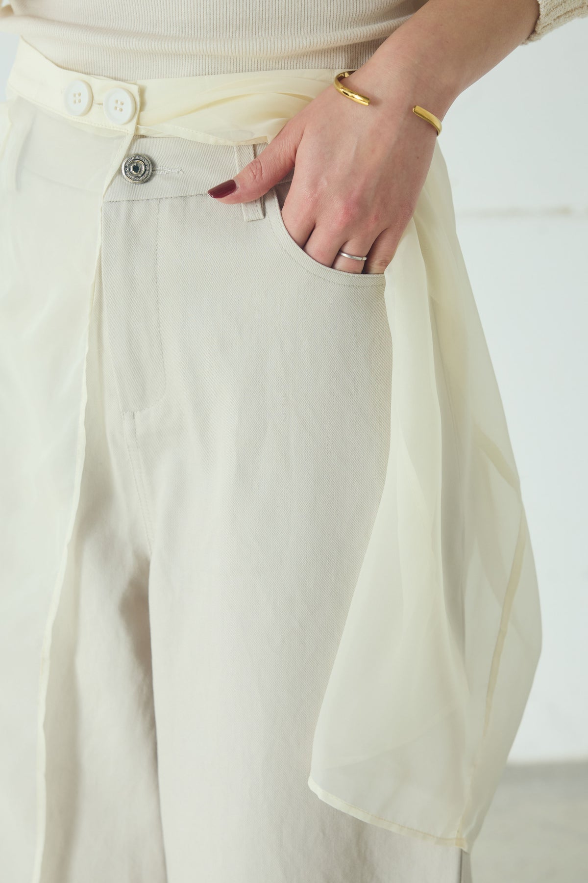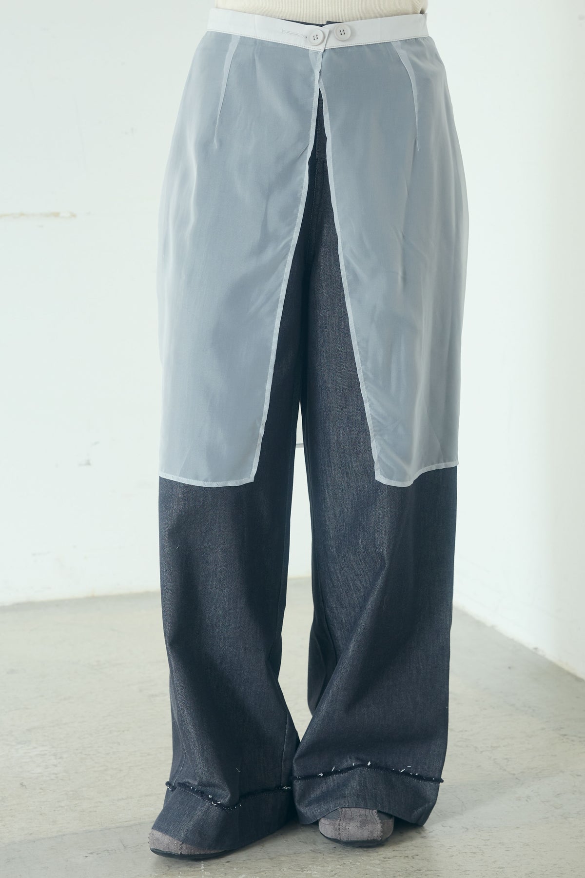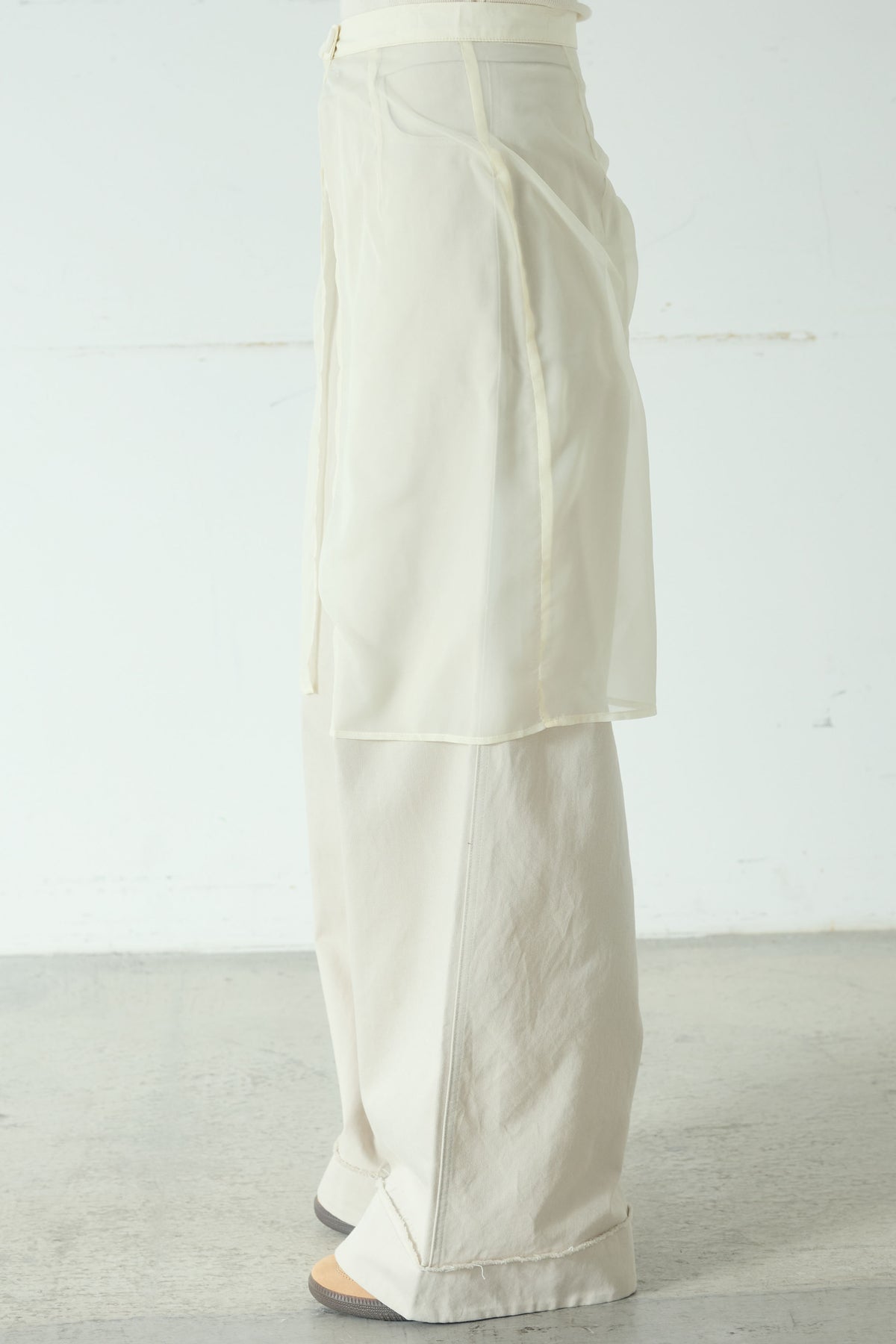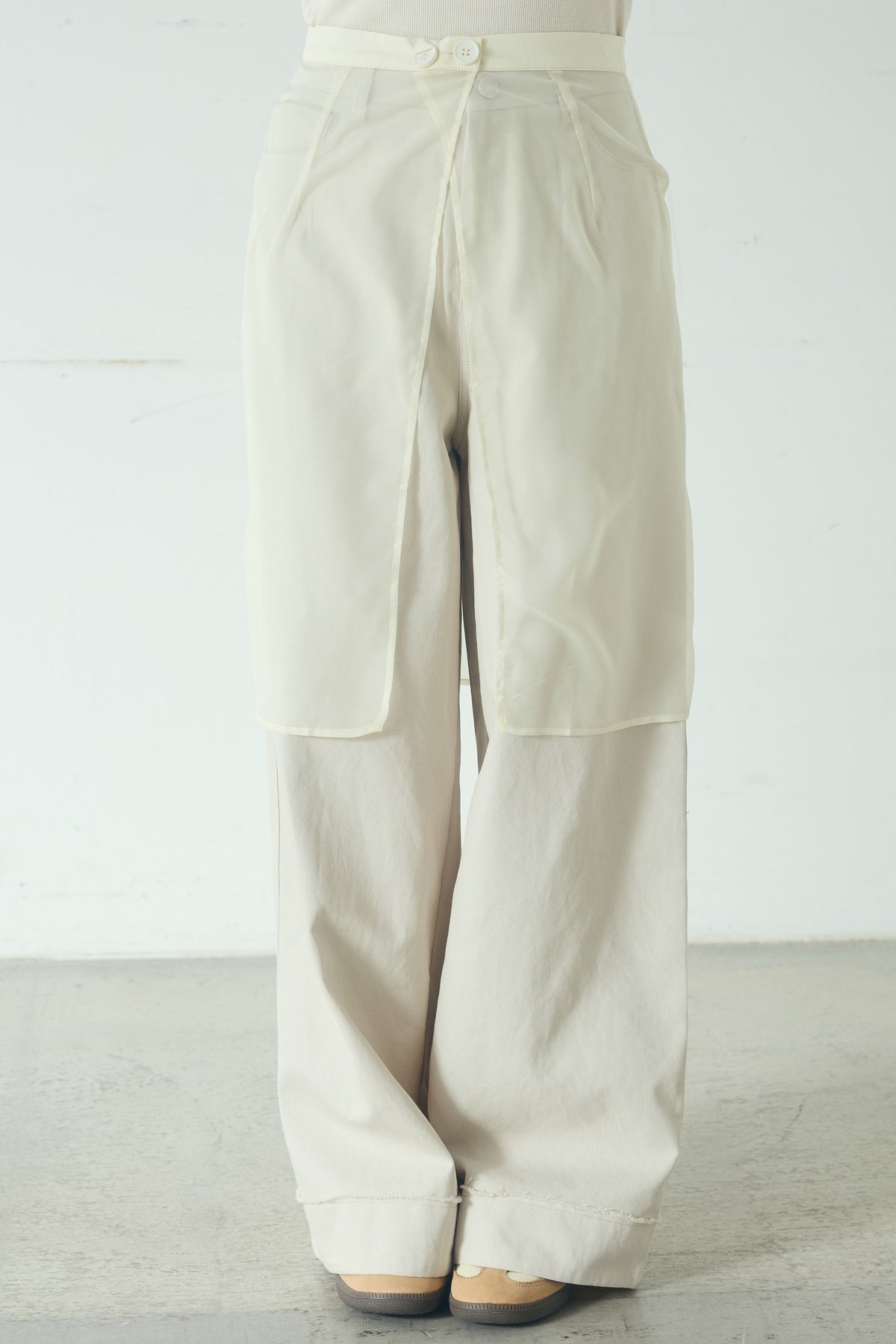 異素材を重ねたレイヤードデザインが印象的なワイドパンツ。 シアー素材の透け感が軽やかな表情を加え、シンプルなトップスと合わせるだけでスタイリングに奥行きが生まれます。 ワイドシルエットながらも縦ラインを意識した切り替えで、すっきりとしたバランスに。 動くたびにニュアンスのある揺れ感が楽しめる、主役級の一本です。