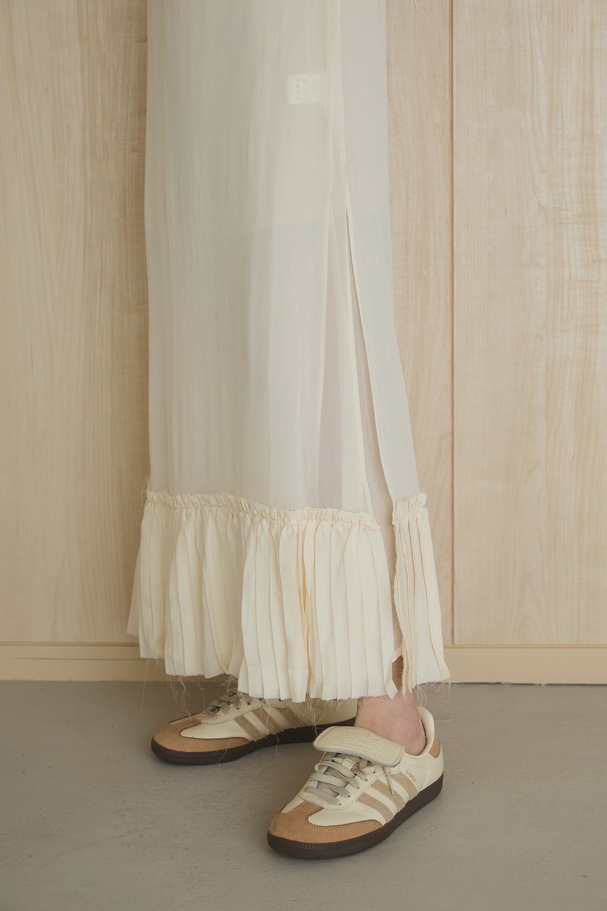 裾にあしらわれたフリルデザインが印象的なキャミワンピース。 シンプルな中に動きのあるディテールを加えることで、軽やかで女性らしい雰囲気を演出します。 すとんと落ちるIラインシルエットが縦のラインを強調し、すっきりとした印象に。 華奢なストラップが抜け感をプラスし、ヘルシーで洗練されたスタイリングを叶えます。 軽やかな素材感でロングシーズン着用可能。 Tシャツやシアートップスとのレイヤードはもちろん、ジャケットを羽織ったきれいめスタイルにもおすすめです。 シンプルながらも着回し力が高く、スタイリングの幅を広げてくれる一着です。