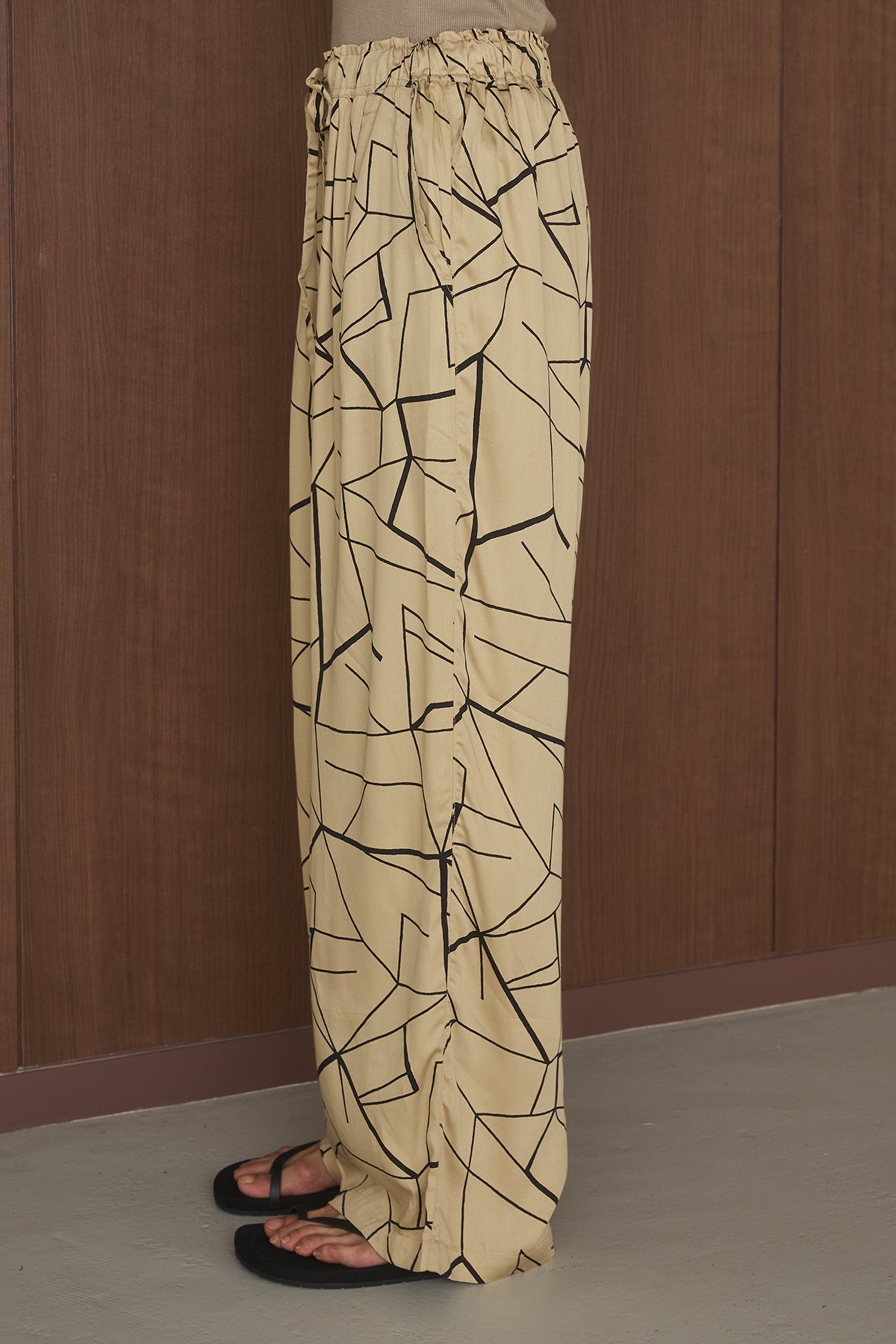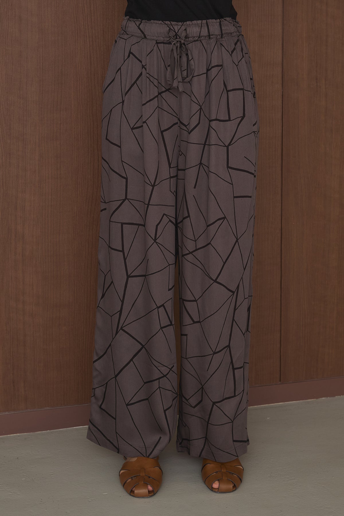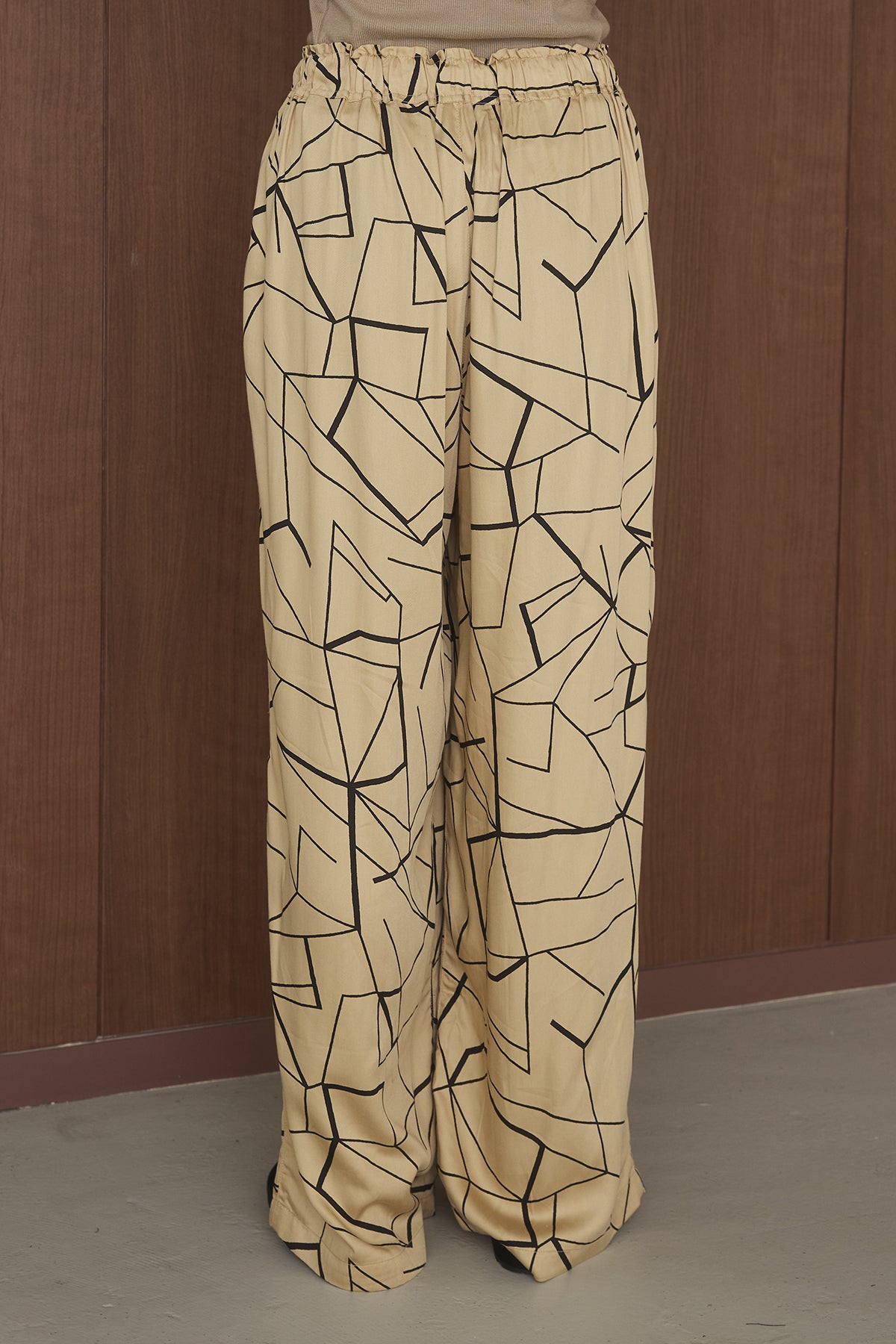 存在感のある幾何学プリントが目を惹く、リラックス感のあるイージーパンツ。 大胆な柄がスタイリングのアクセントとなり、シンプルなトップスと合わせるだけでこなれた印象に仕上がる一着です。 フロントに施されたタックが立体的なシルエットを生み出し、ゆったりとした履き心地ながらもすっきりとしたバランスに。 落ち感のある軽やかな素材で、動きのある表情と快適な着用感を実現しています。 ウエストはゴム仕様に加え、ドローストリングでサイズ調整が可能。 ストレスフリーな履き心地でデイリーに取り入れやすく、リラックスしたスタイルにも最適です。 Tシャツやタンクトップと合わせたラフな着こなしはもちろん、シャツやジャケットと合わせてモードな印象にも。 シンプルなスタイリングに遊び心をプラスし、都会的でこなれたムードを演出してくれる主役級のアイテムです。