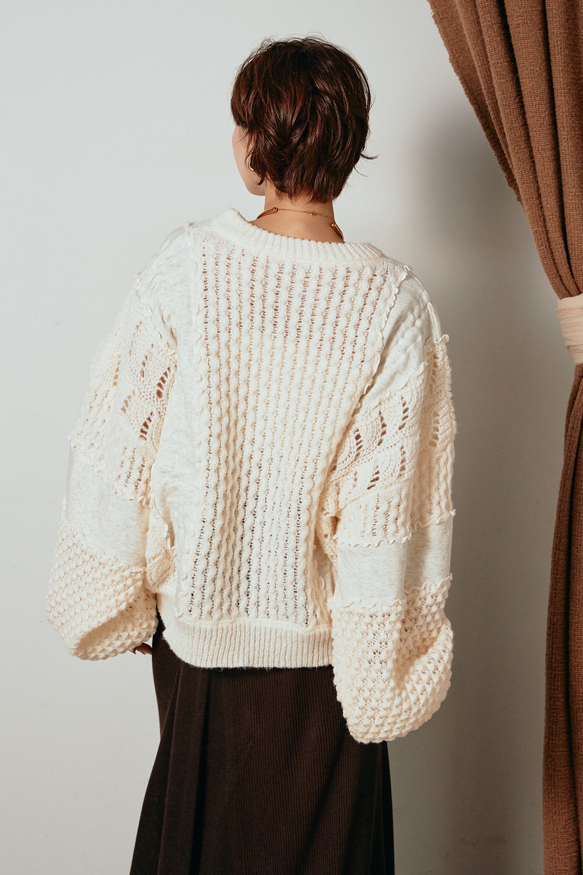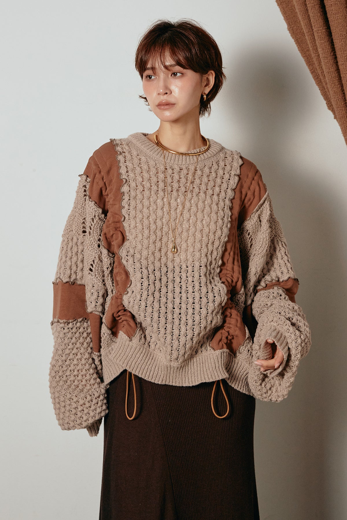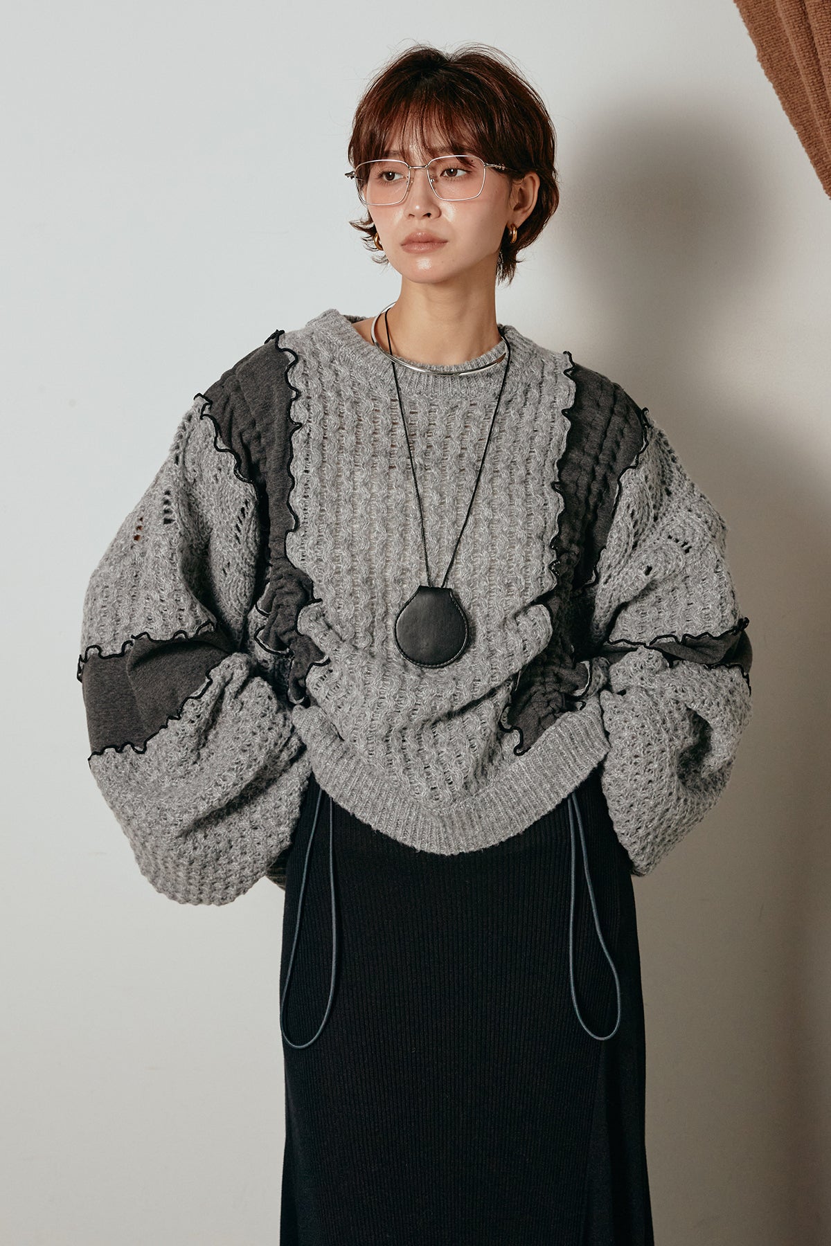 異素材の切り替えと立体的なギャザーデザインが印象的なニットプルオーバー。アラン編みのクラシックな風合いに、メロー仕上げの袖口やパネルデザインを加えることでモード感のある一枚に仕上げています。袖にかけてボリュームを持たせたシルエットが抜け感をプラスし、コーディネートの主役として活躍。パンツにもスカートにも合わせやすく、スタイリングに奥行きを与える個性派ニットです。