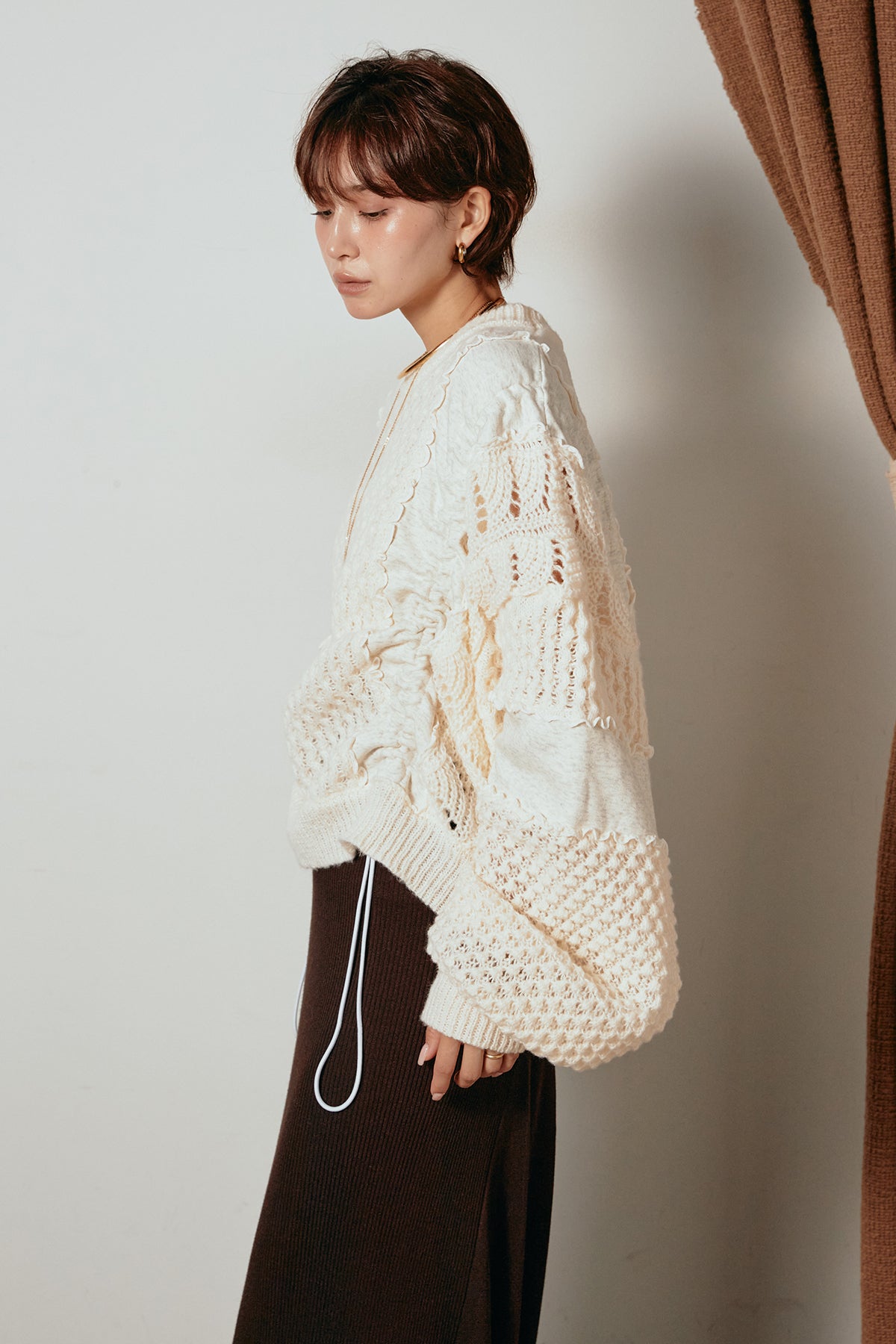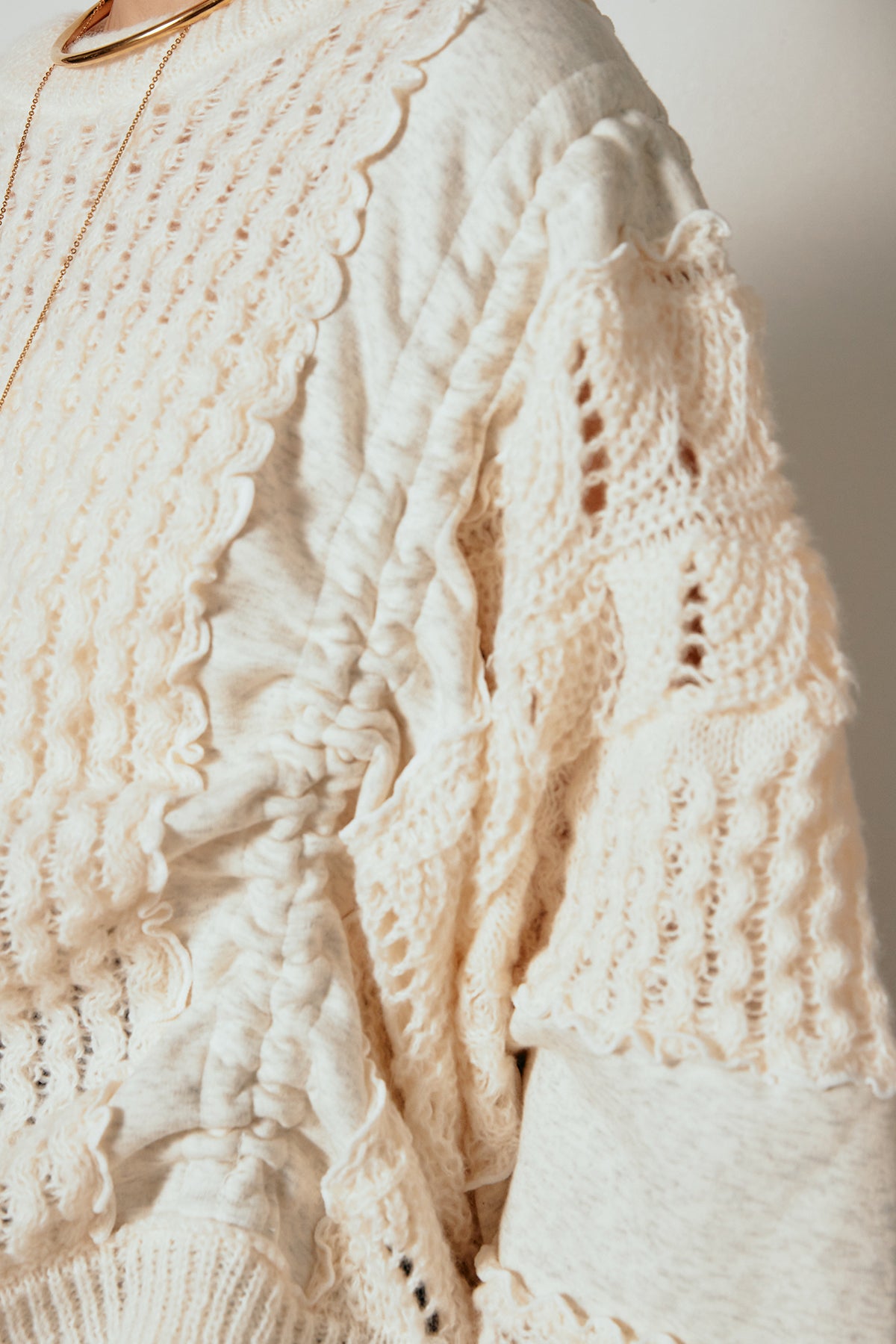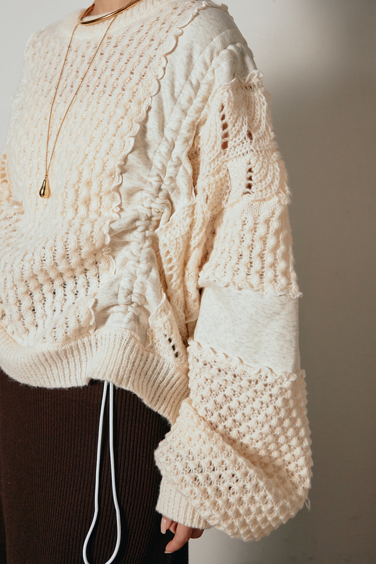 異素材の切り替えと立体的なギャザーデザインが印象的なニットプルオーバー。アラン編みのクラシックな風合いに、メロー仕上げの袖口やパネルデザインを加えることでモード感のある一枚に仕上げています。袖にかけてボリュームを持たせたシルエットが抜け感をプラスし、コーディネートの主役として活躍。パンツにもスカートにも合わせやすく、スタイリングに奥行きを与える個性派ニットです。