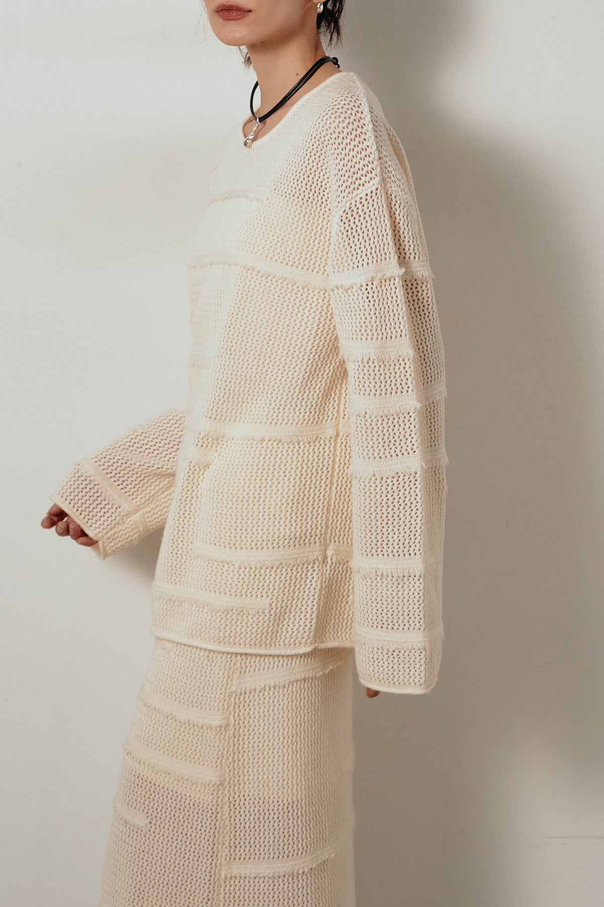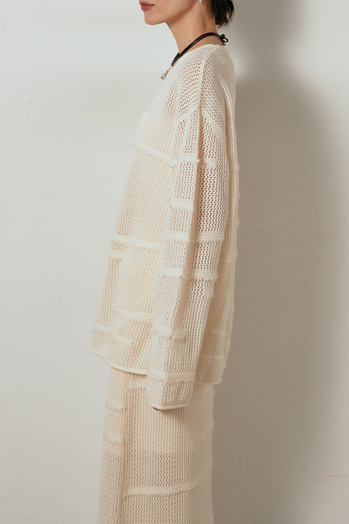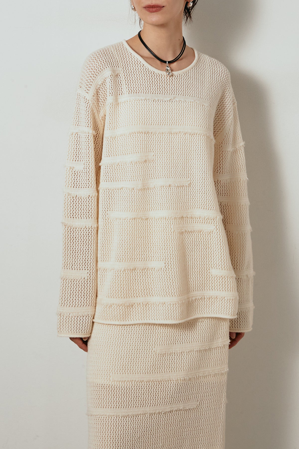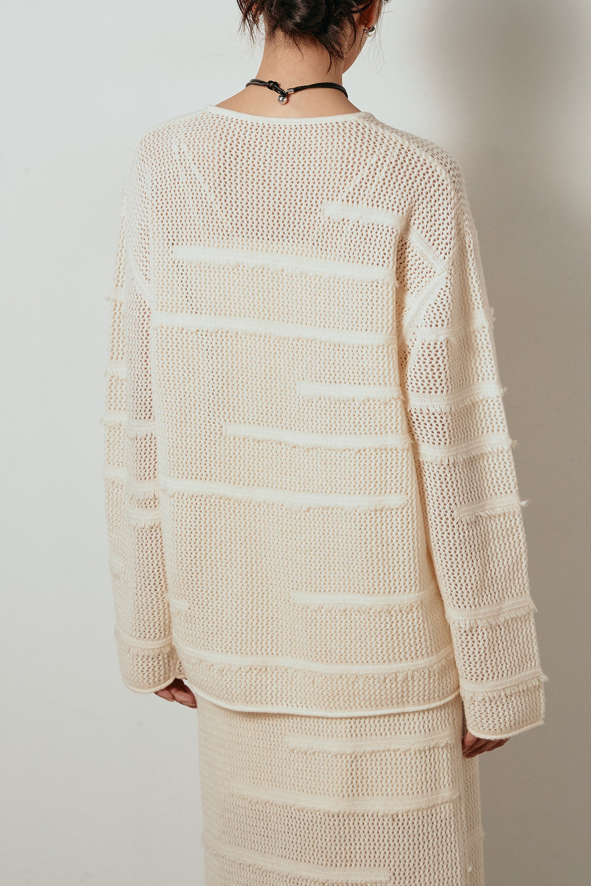 立体感のあるランダムライン柄が目を引く透かし編みニットプルオーバー。程よい透け感が軽やかさを演出し、重たくなりがちな秋冬コーデに抜け感をプラスします。ゆったりとしたシルエットでリラックス感がありながらも、編地の変化で奥行きのあるデザインに。スカートにもパンツにも合わせやすく、同素材のスカートとセットアップでの着こなしもおすすめです。