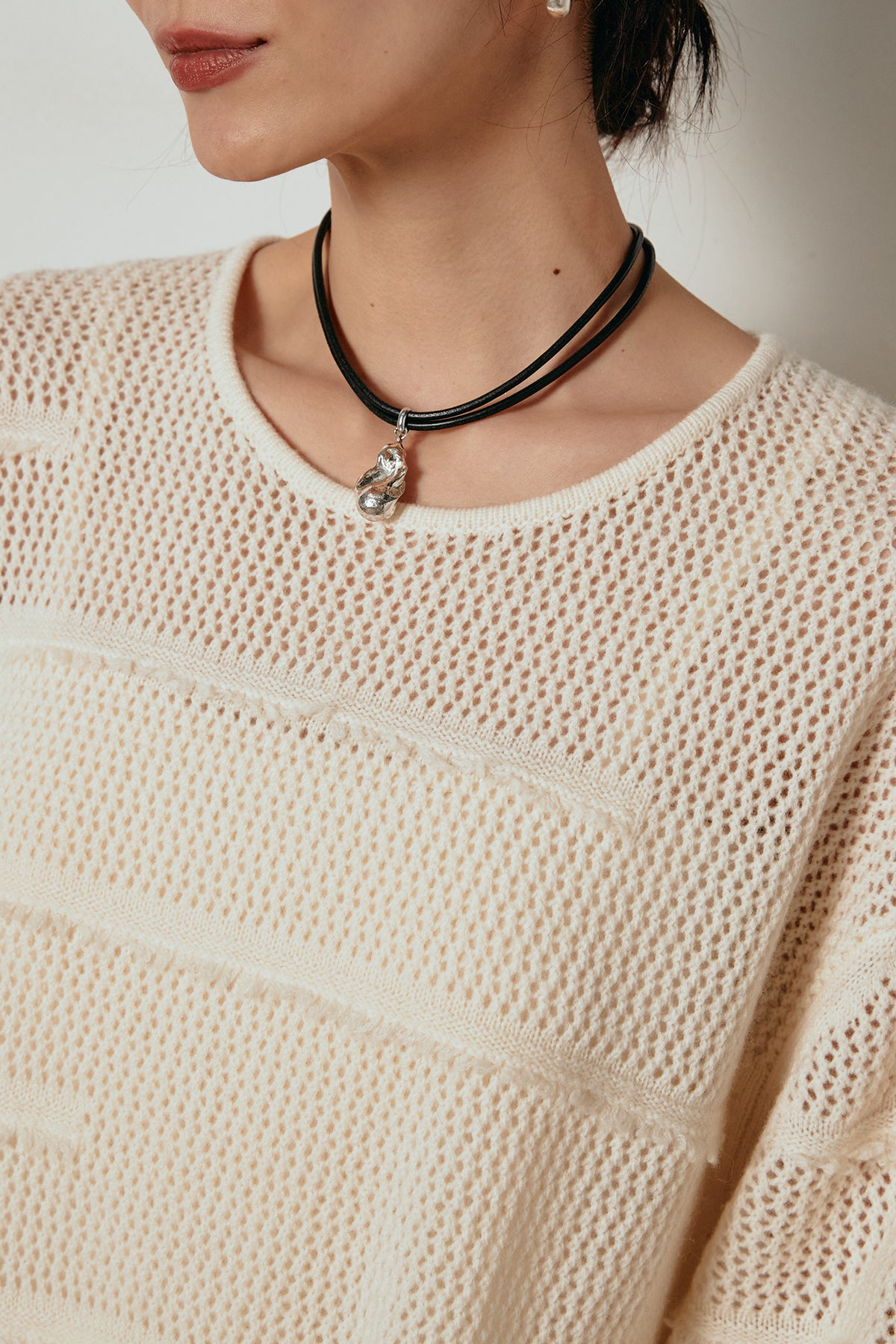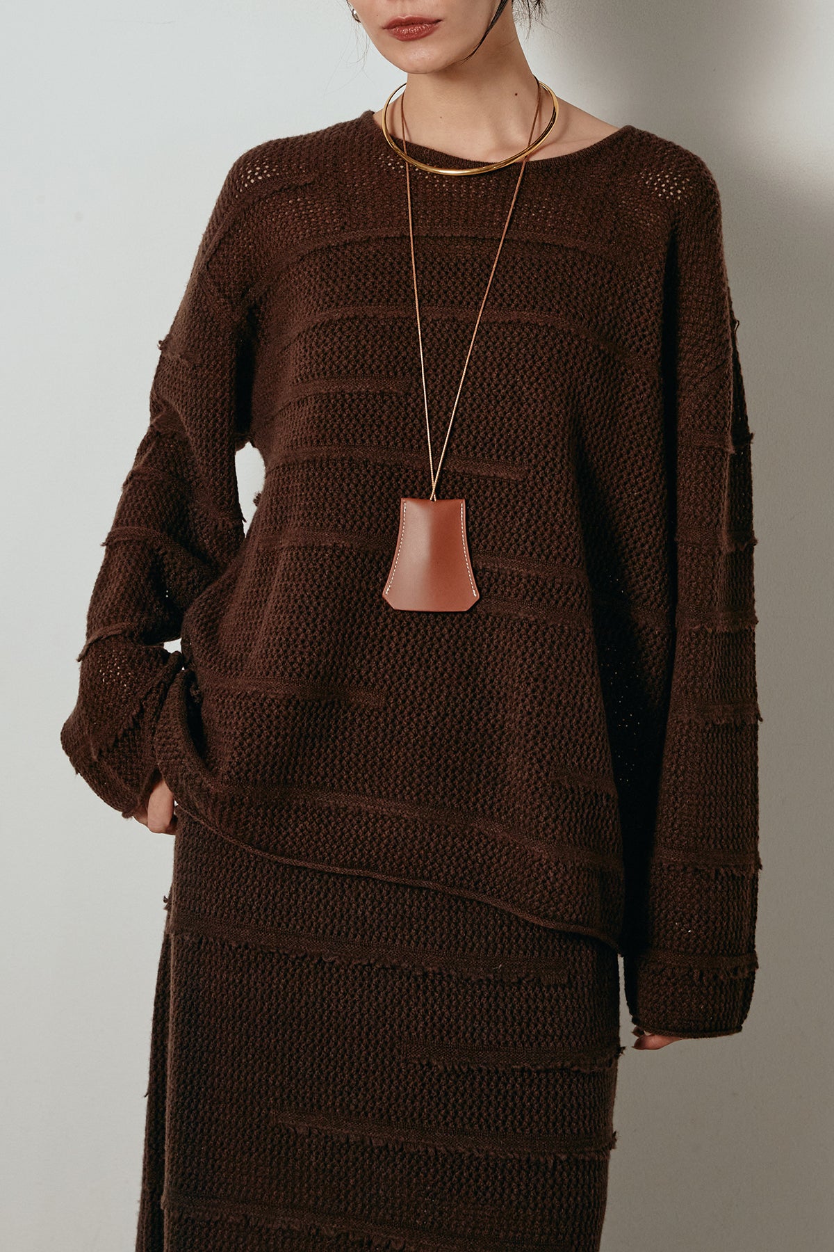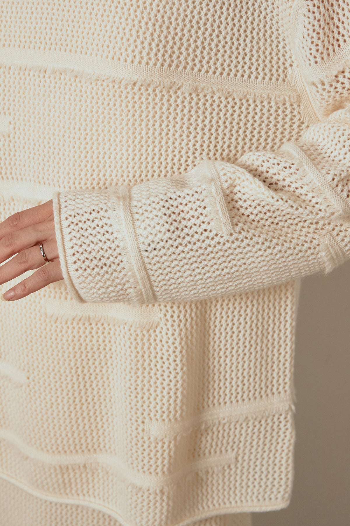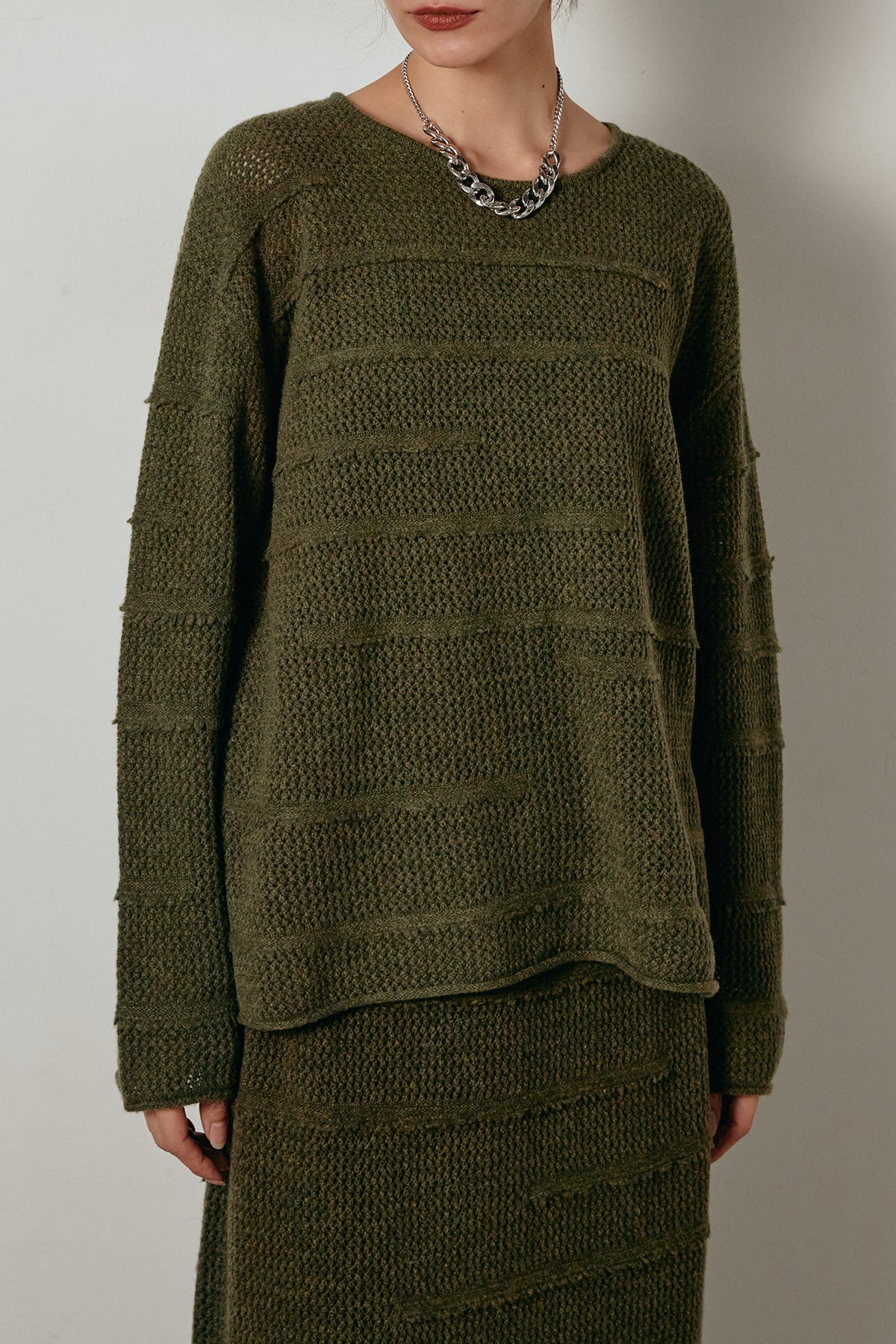 立体感のあるランダムライン柄が目を引く透かし編みニットプルオーバー。程よい透け感が軽やかさを演出し、重たくなりがちな秋冬コーデに抜け感をプラスします。ゆったりとしたシルエットでリラックス感がありながらも、編地の変化で奥行きのあるデザインに。スカートにもパンツにも合わせやすく、同素材のスカートとセットアップでの着こなしもおすすめです。