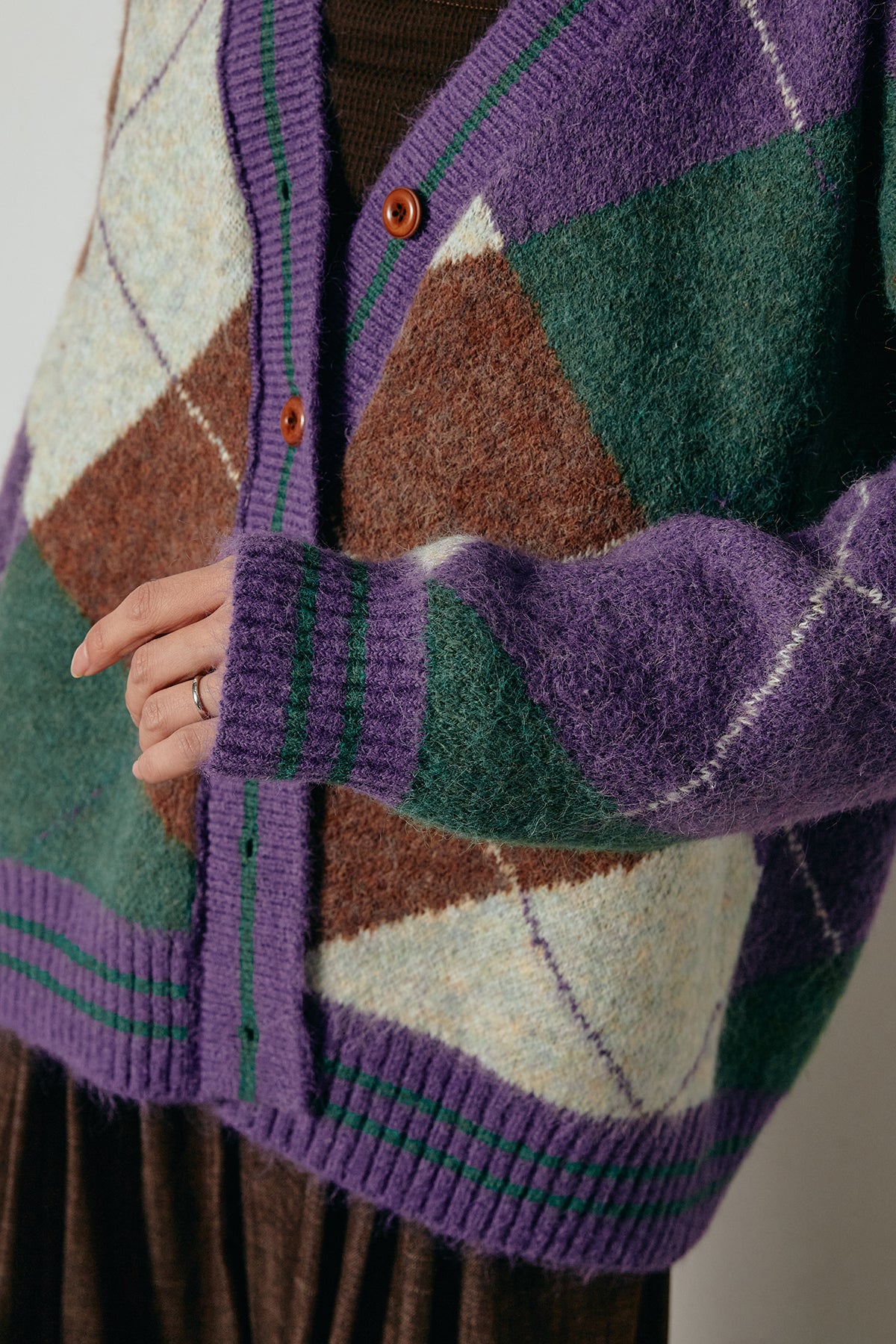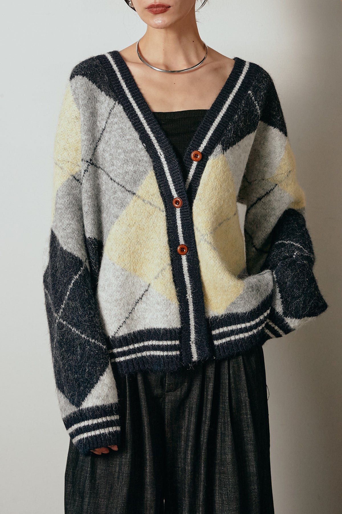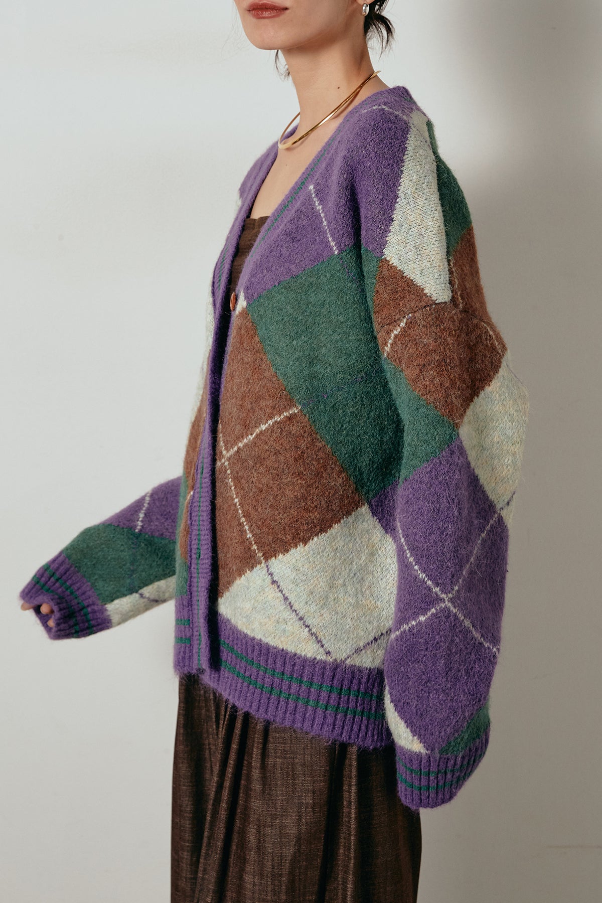 大きめのアーガイル柄が印象的なニットカーディガン。ふんわりとした起毛感のある素材で、シーズンムードを高めながら優しい着心地を叶えます。程よくゆとりのあるシルエットが抜け感を生み、ボタンを閉めてトップス風にも羽織りとしても着回し可能。配色ラインが全体を引き締め、デイリーコーデに華やかさをプラスしてくれるアイテムです。