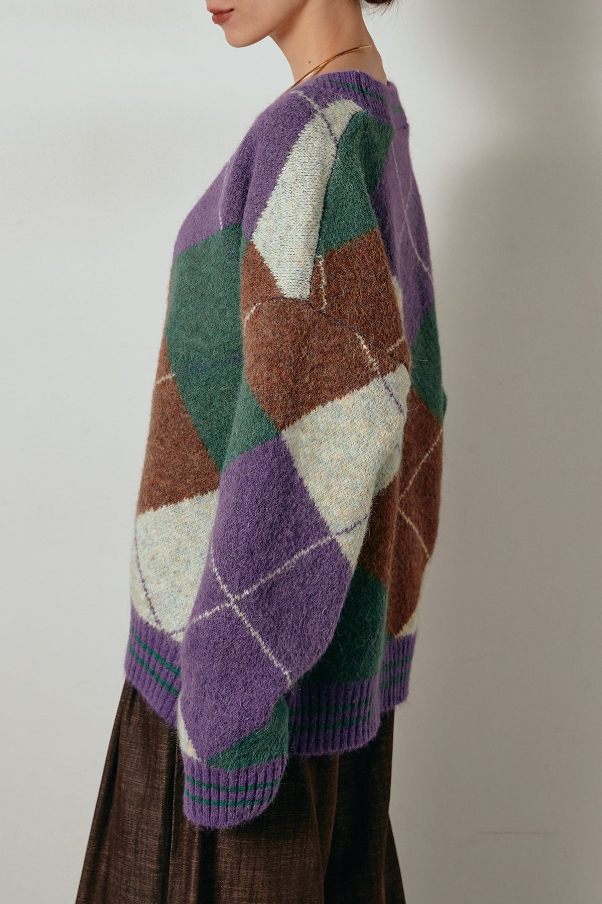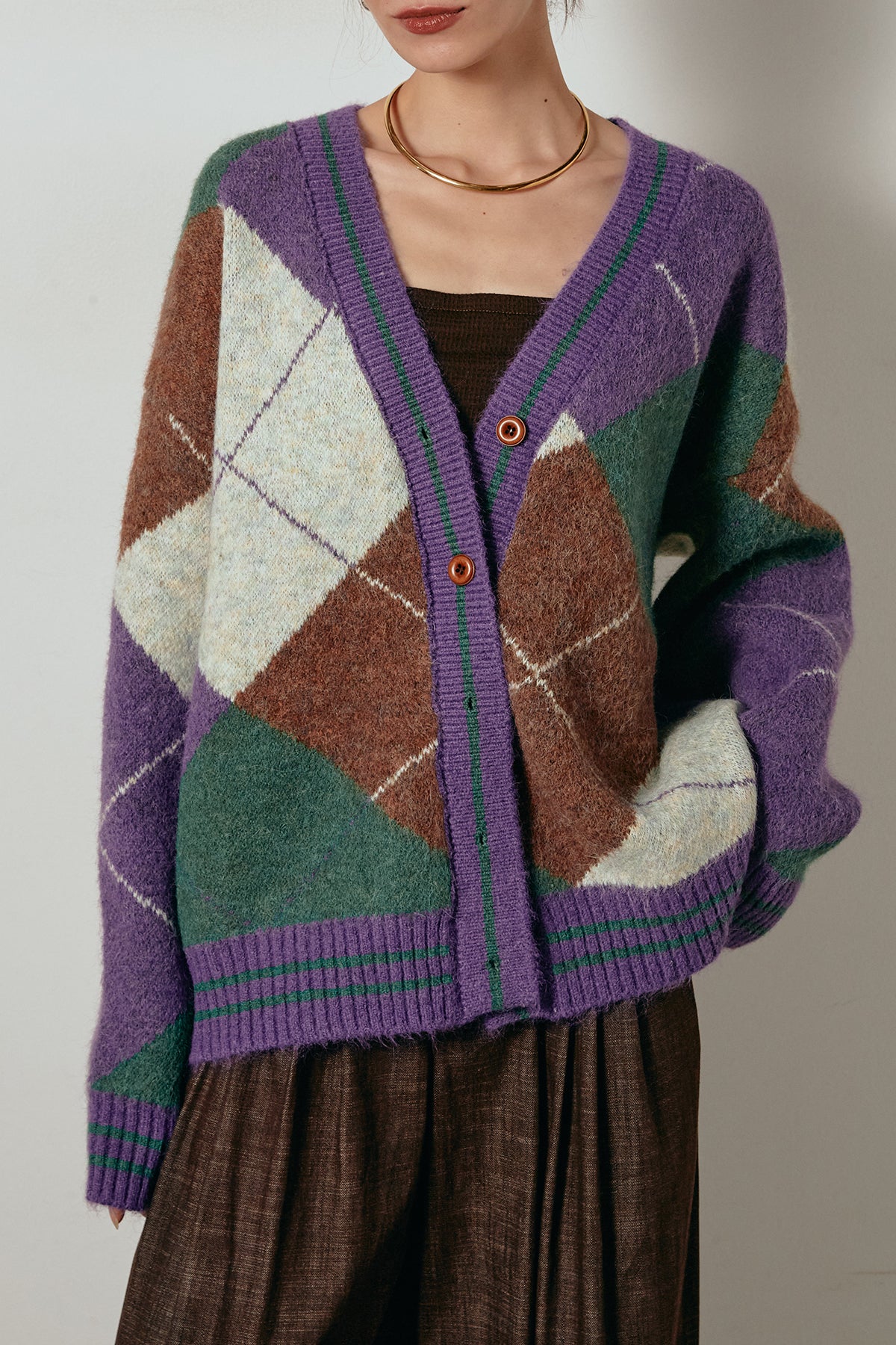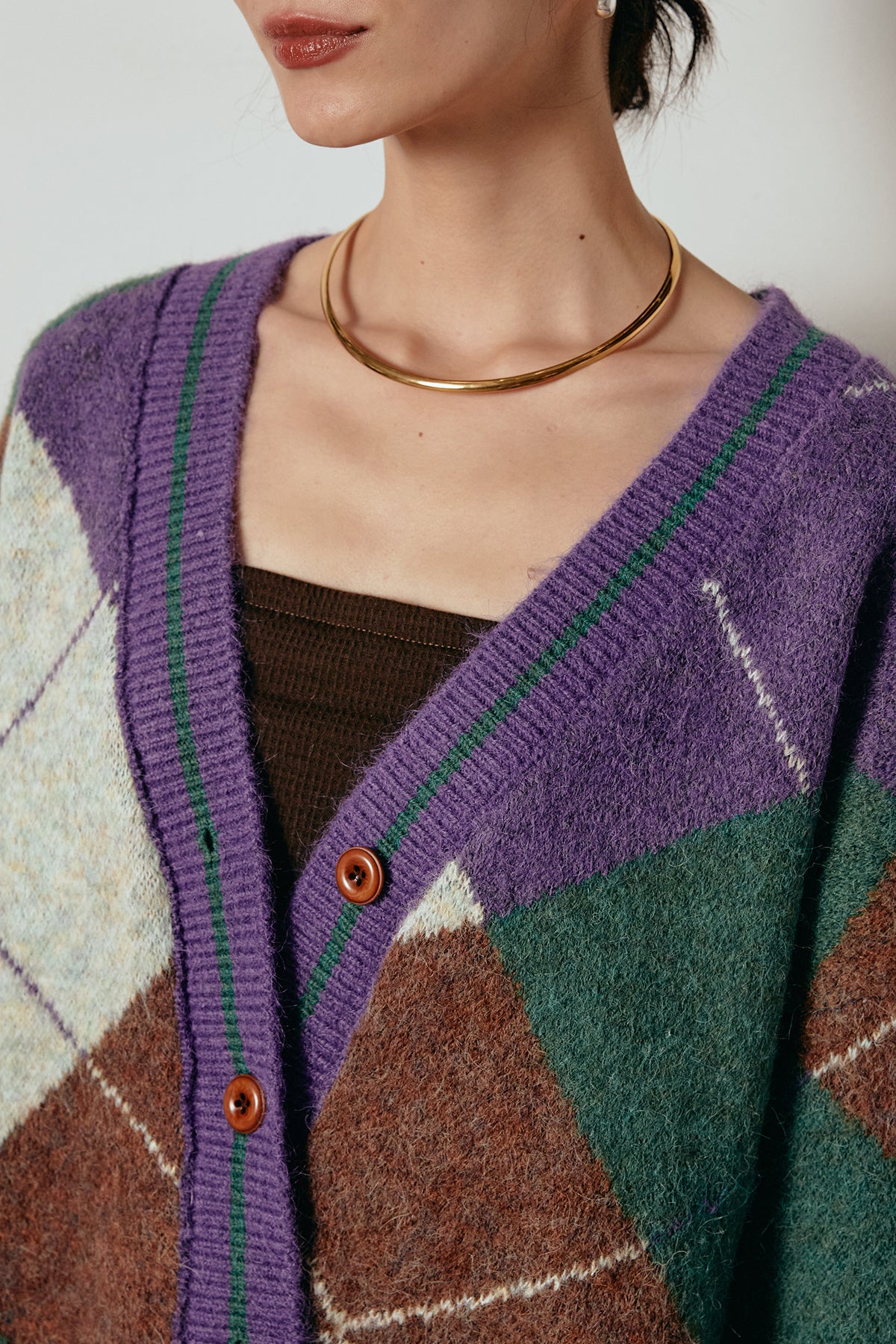 大きめのアーガイル柄が印象的なニットカーディガン。ふんわりとした起毛感のある素材で、シーズンムードを高めながら優しい着心地を叶えます。程よくゆとりのあるシルエットが抜け感を生み、ボタンを閉めてトップス風にも羽織りとしても着回し可能。配色ラインが全体を引き締め、デイリーコーデに華やかさをプラスしてくれるアイテムです。