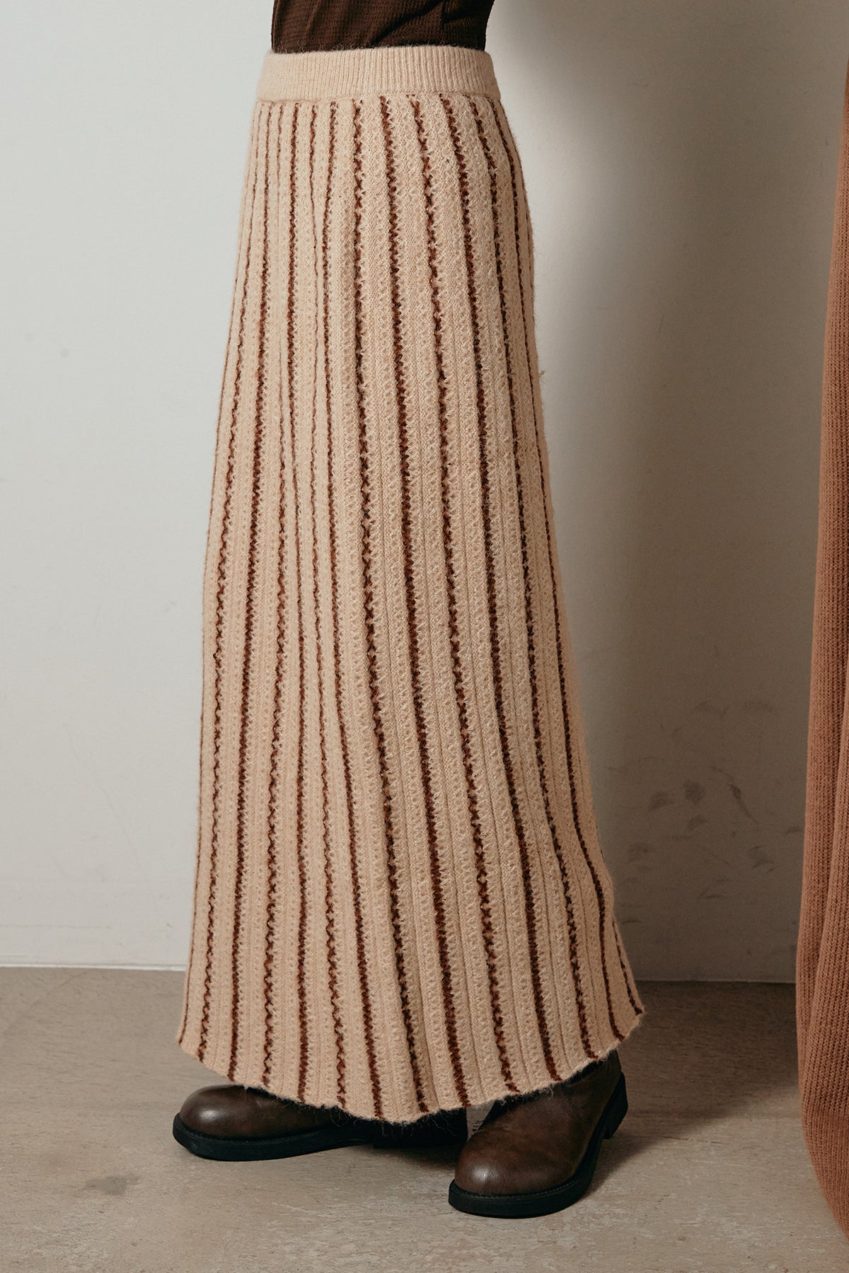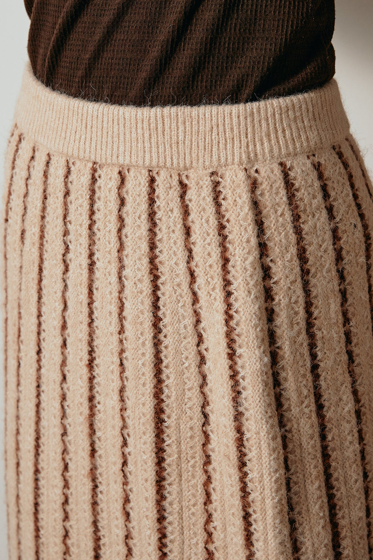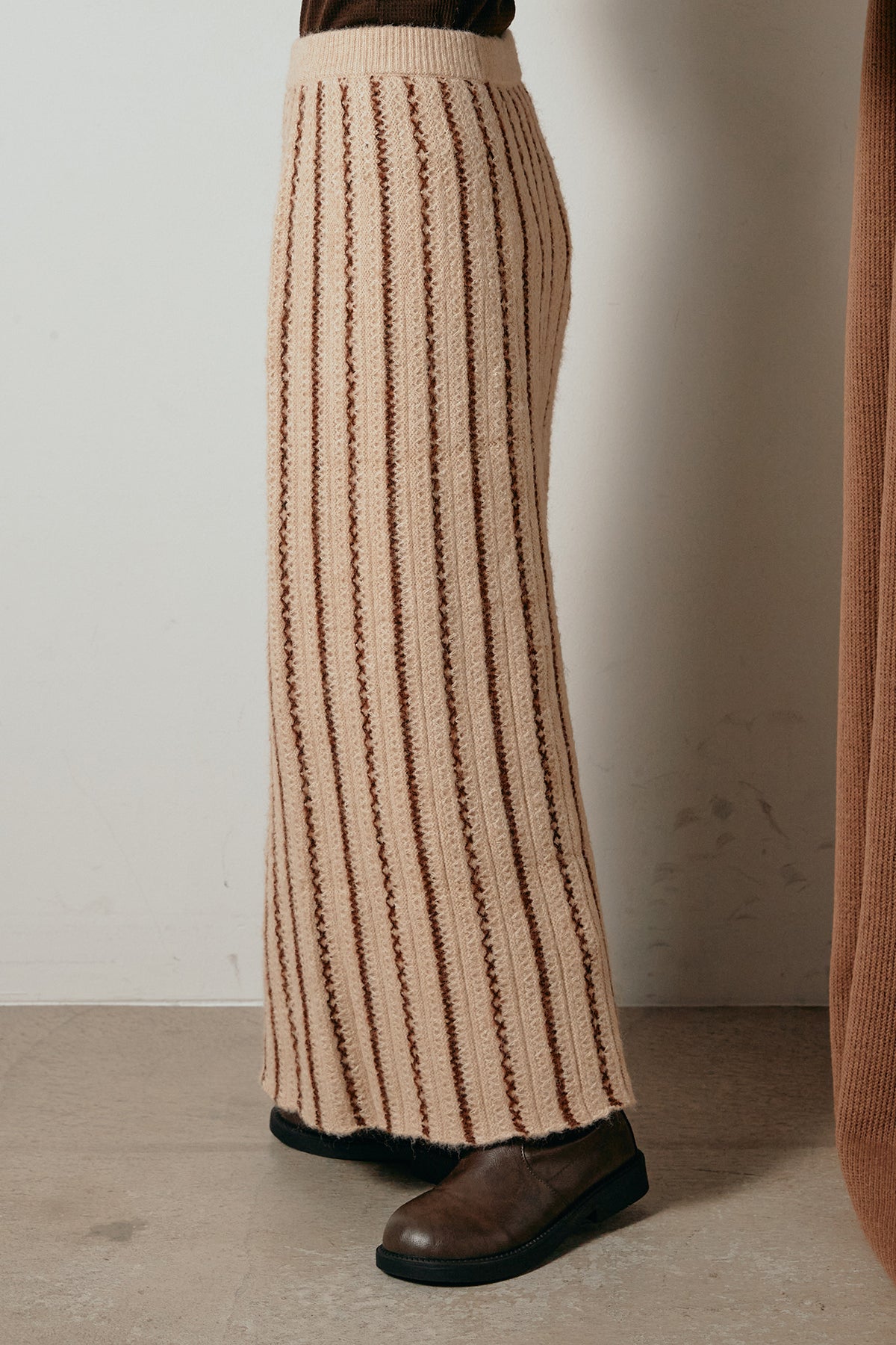 表面感のあるリブ編みが印象的なニットワイドスカート。縦ラインを強調する細ストライプ柄がスタイルアップ効果を高め、シンプルながらも奥行きのあるデザインに。柔らかく伸縮性のある素材で動きやすく、ウエストゴム仕様でストレスフリーな穿き心地です。スウェットやニットなど、さまざまなトップスと好相性の一枚。