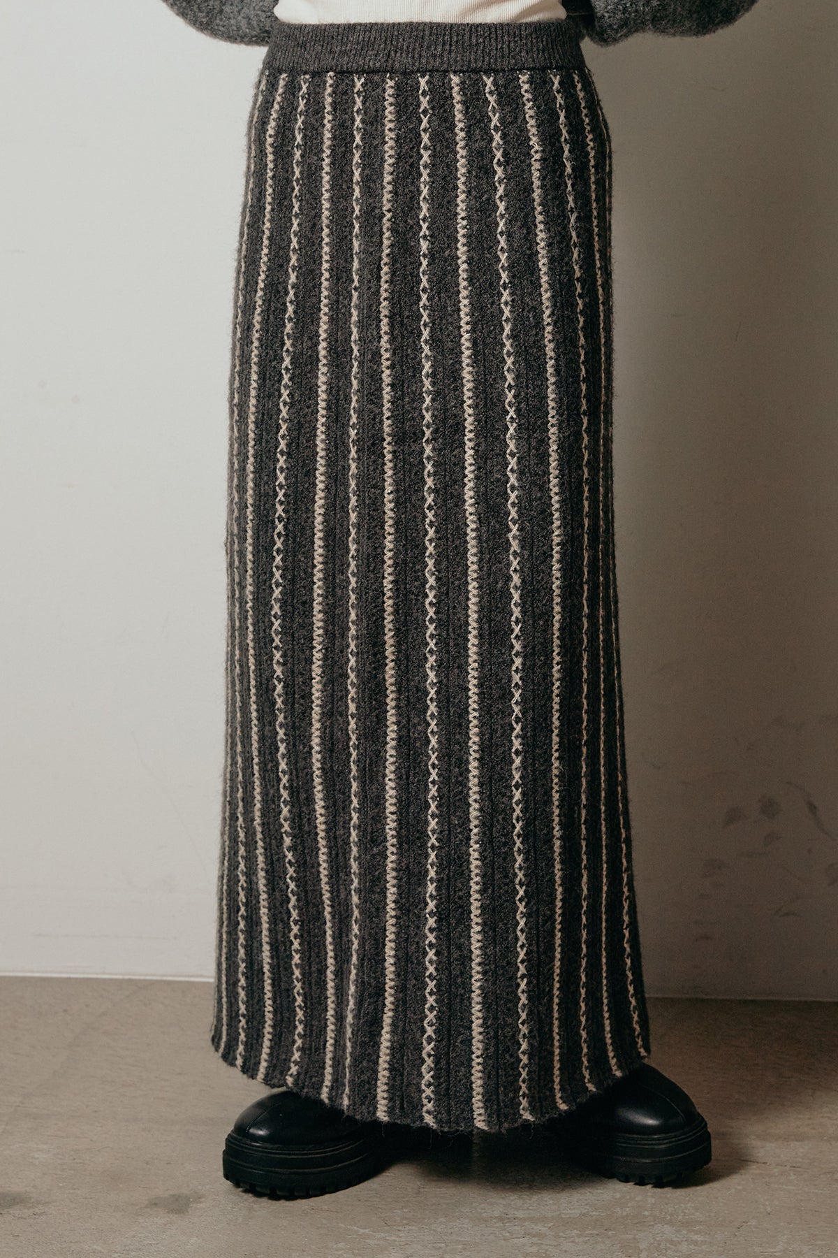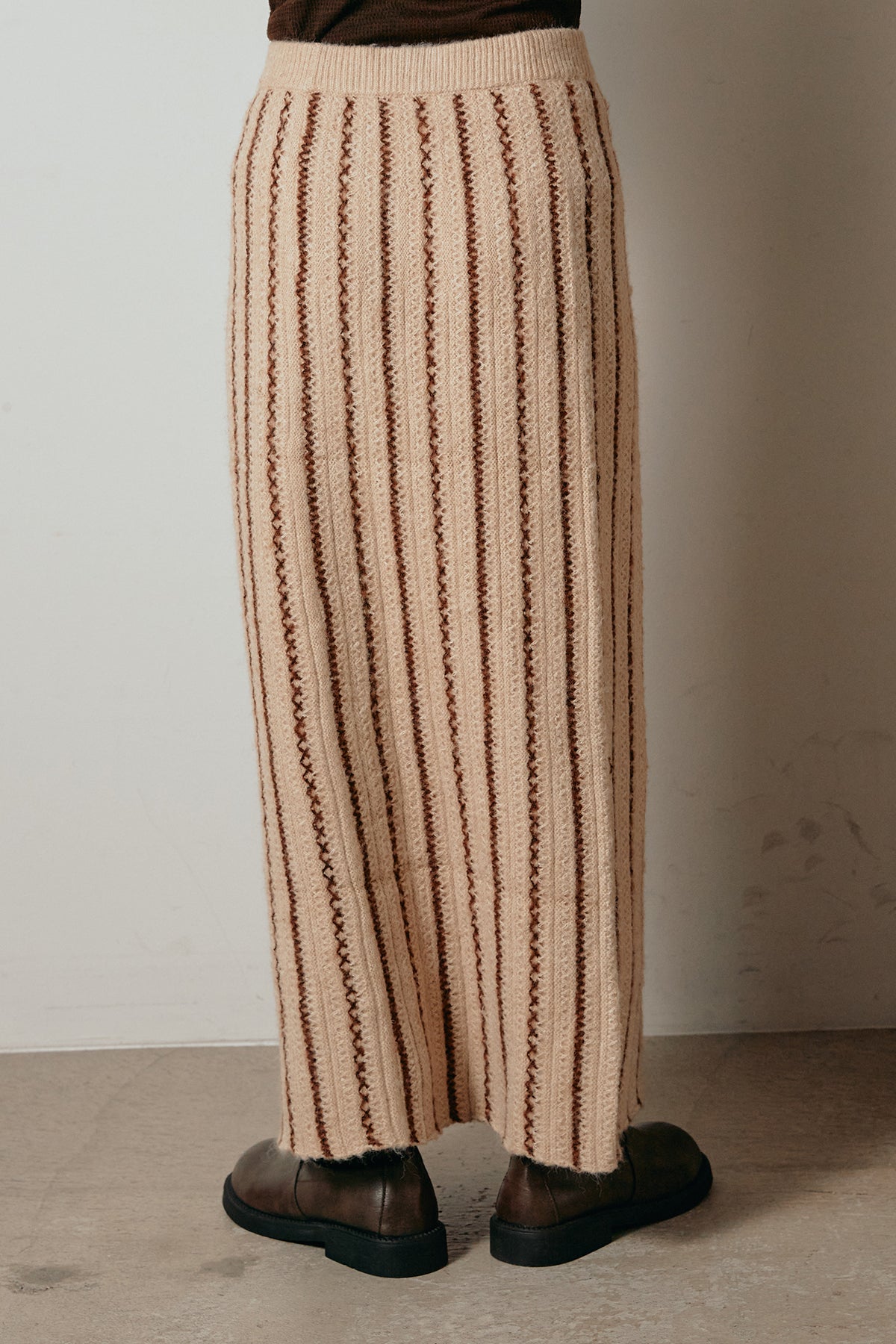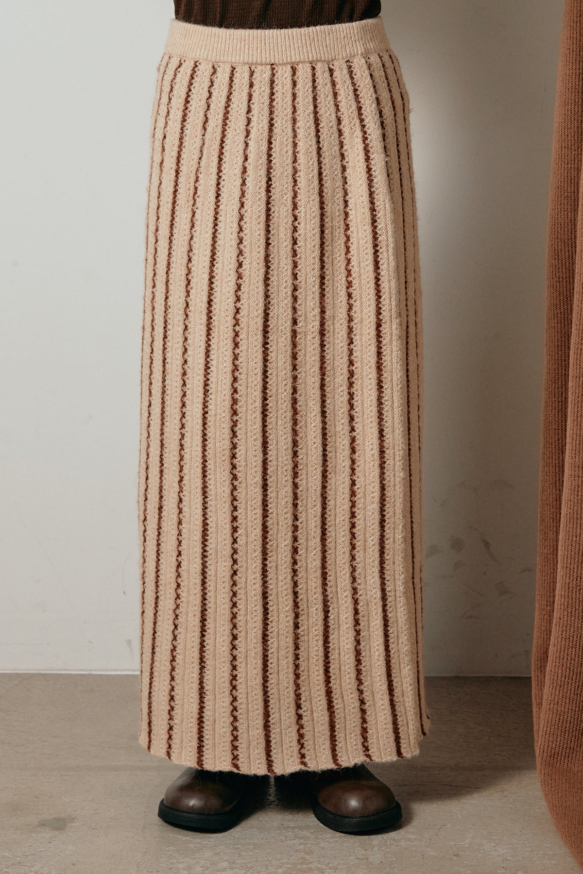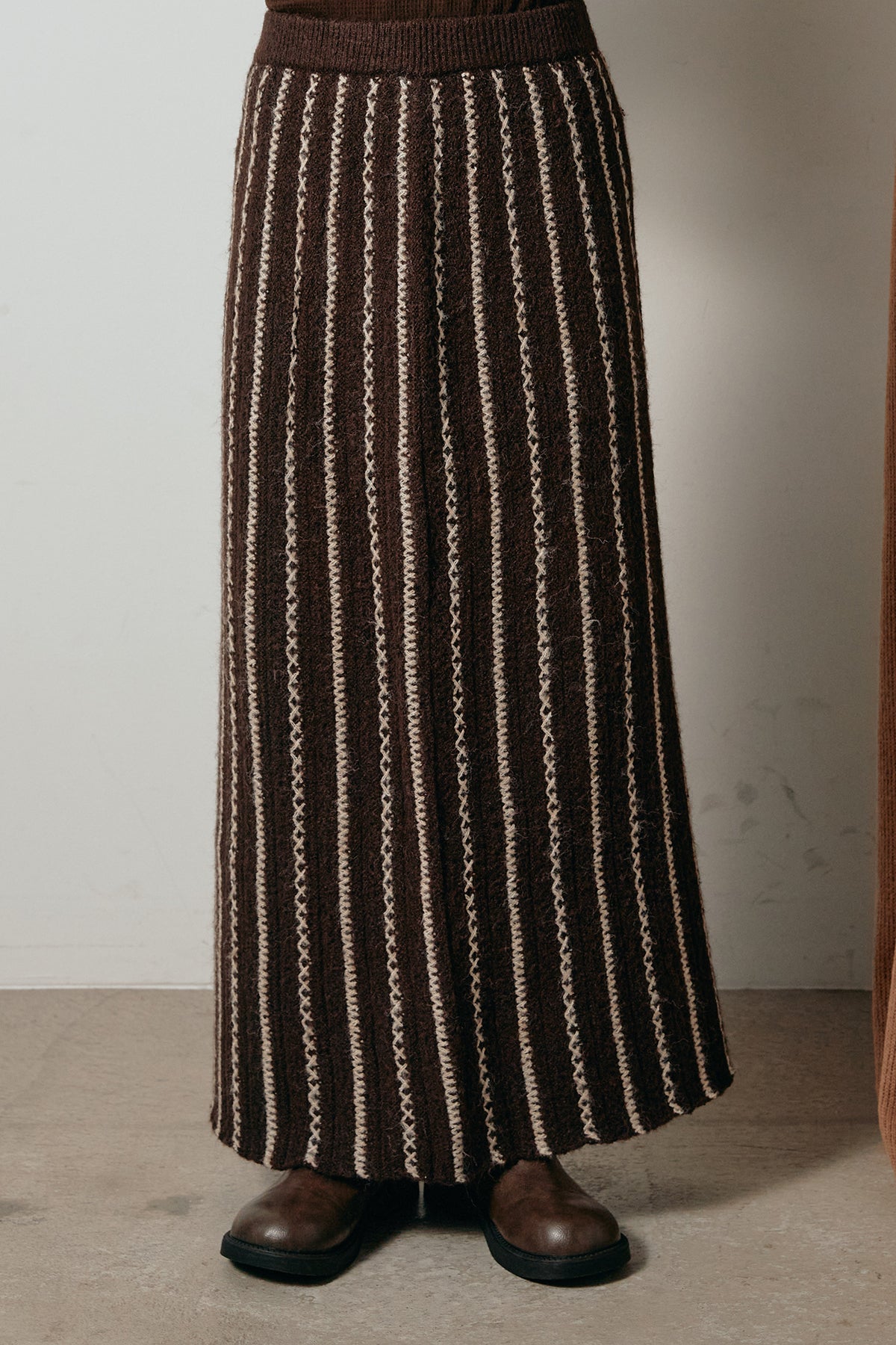 表面感のあるリブ編みが印象的なニットワイドスカート。縦ラインを強調する細ストライプ柄がスタイルアップ効果を高め、シンプルながらも奥行きのあるデザインに。柔らかく伸縮性のある素材で動きやすく、ウエストゴム仕様でストレスフリーな穿き心地です。スウェットやニットなど、さまざまなトップスと好相性の一枚。