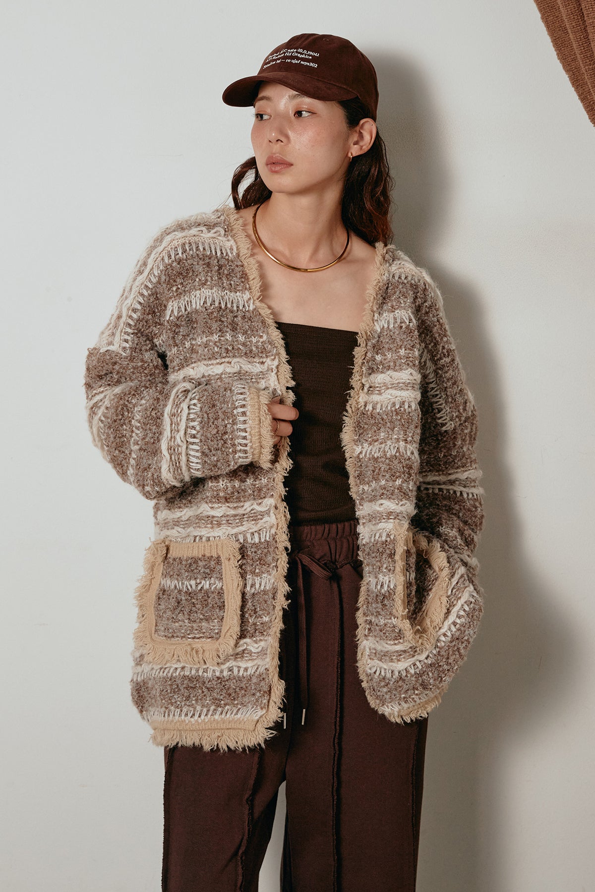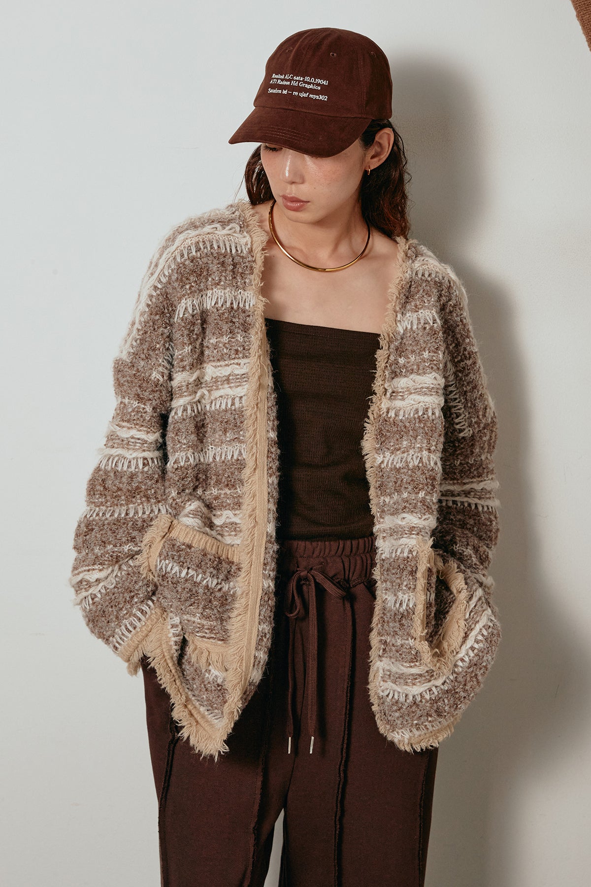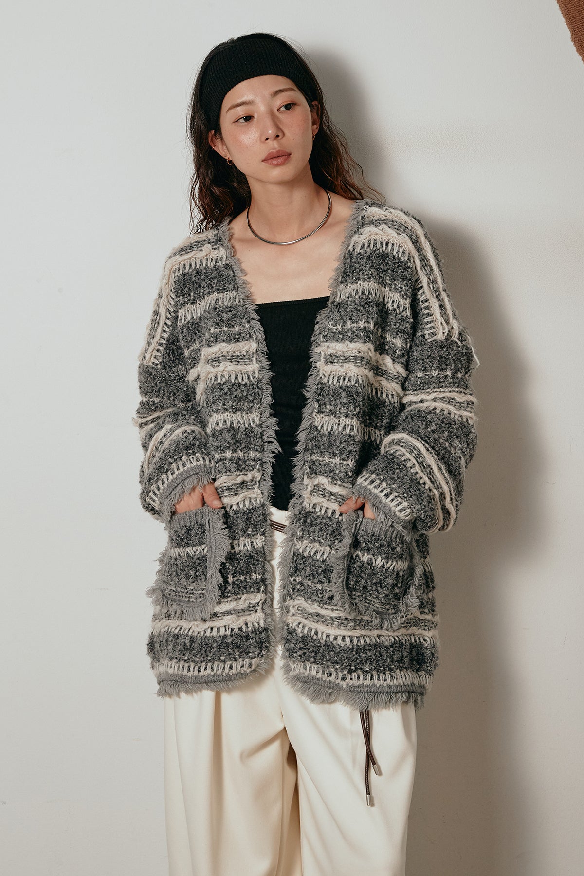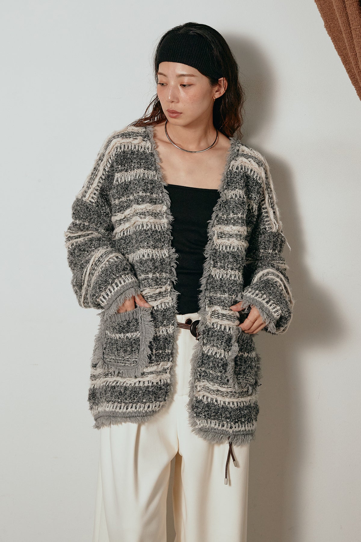 フリンジとニュアンスラインが印象的なニットカーディガン。ふんわりとした糸で編み立てた立体感のあるデザインが、シーズンムードを高めます。リラックス感のあるシルエットながら、フリンジのあしらいが程よくアクセントに。Tシャツやタンクに羽織るだけで存在感のあるスタイルが完成します。デイリーからお出かけまで幅広く活躍する一枚です。