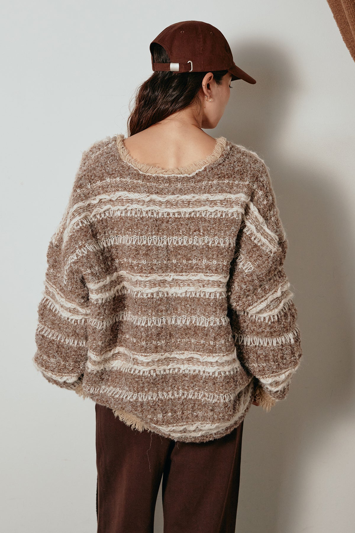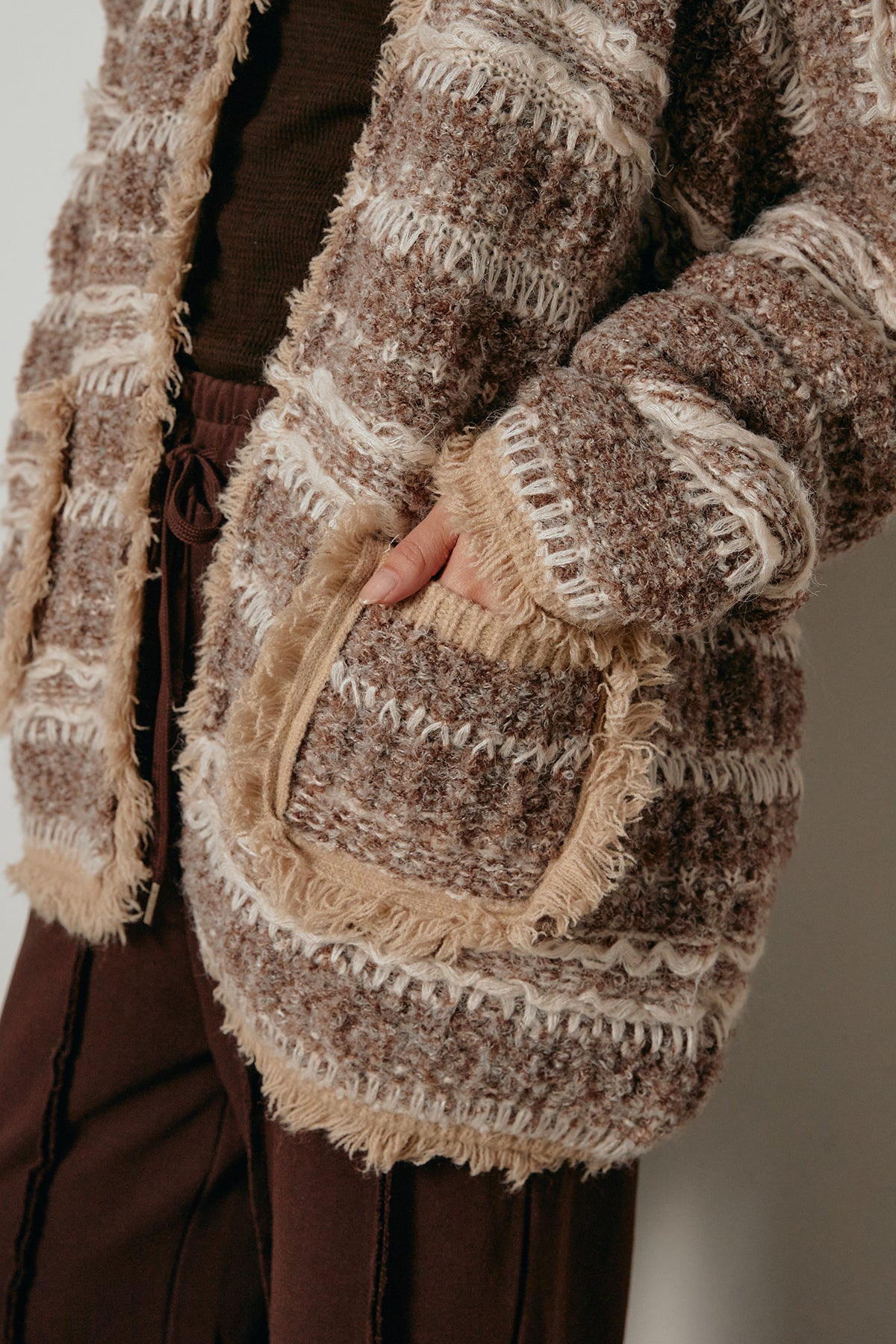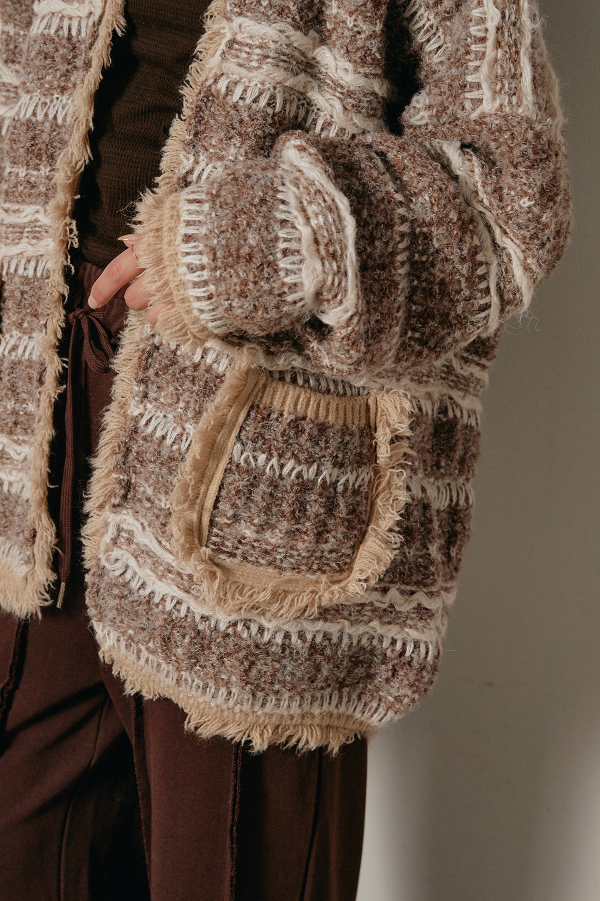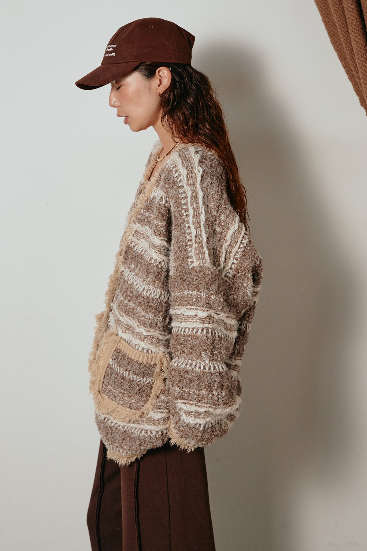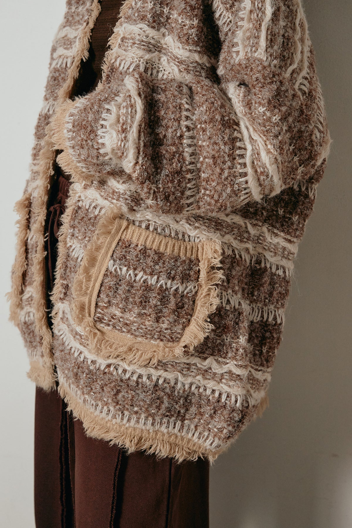 フリンジとニュアンスラインが印象的なニットカーディガン。ふんわりとした糸で編み立てた立体感のあるデザインが、シーズンムードを高めます。リラックス感のあるシルエットながら、フリンジのあしらいが程よくアクセントに。Tシャツやタンクに羽織るだけで存在感のあるスタイルが完成します。デイリーからお出かけまで幅広く活躍する一枚です。