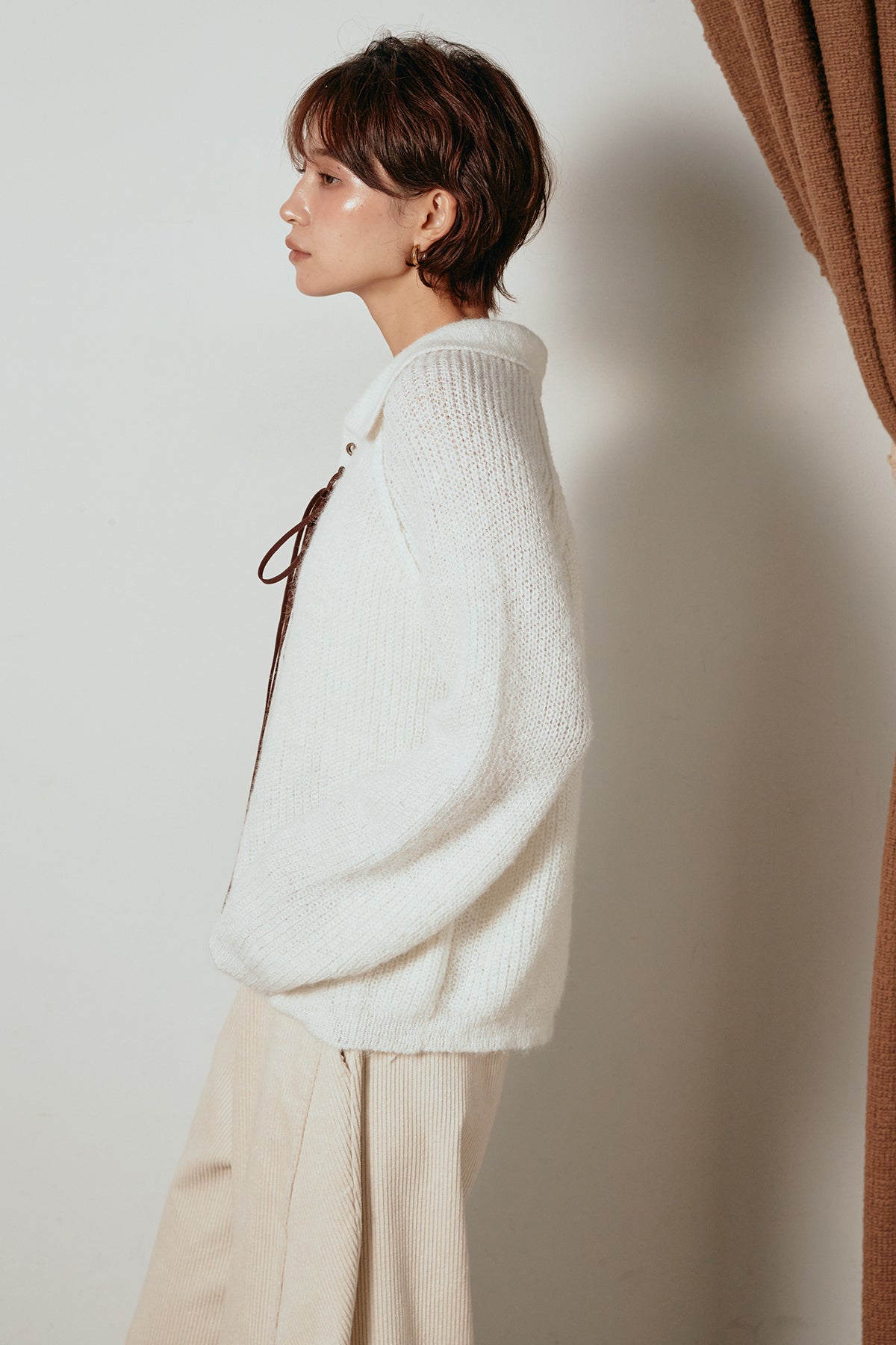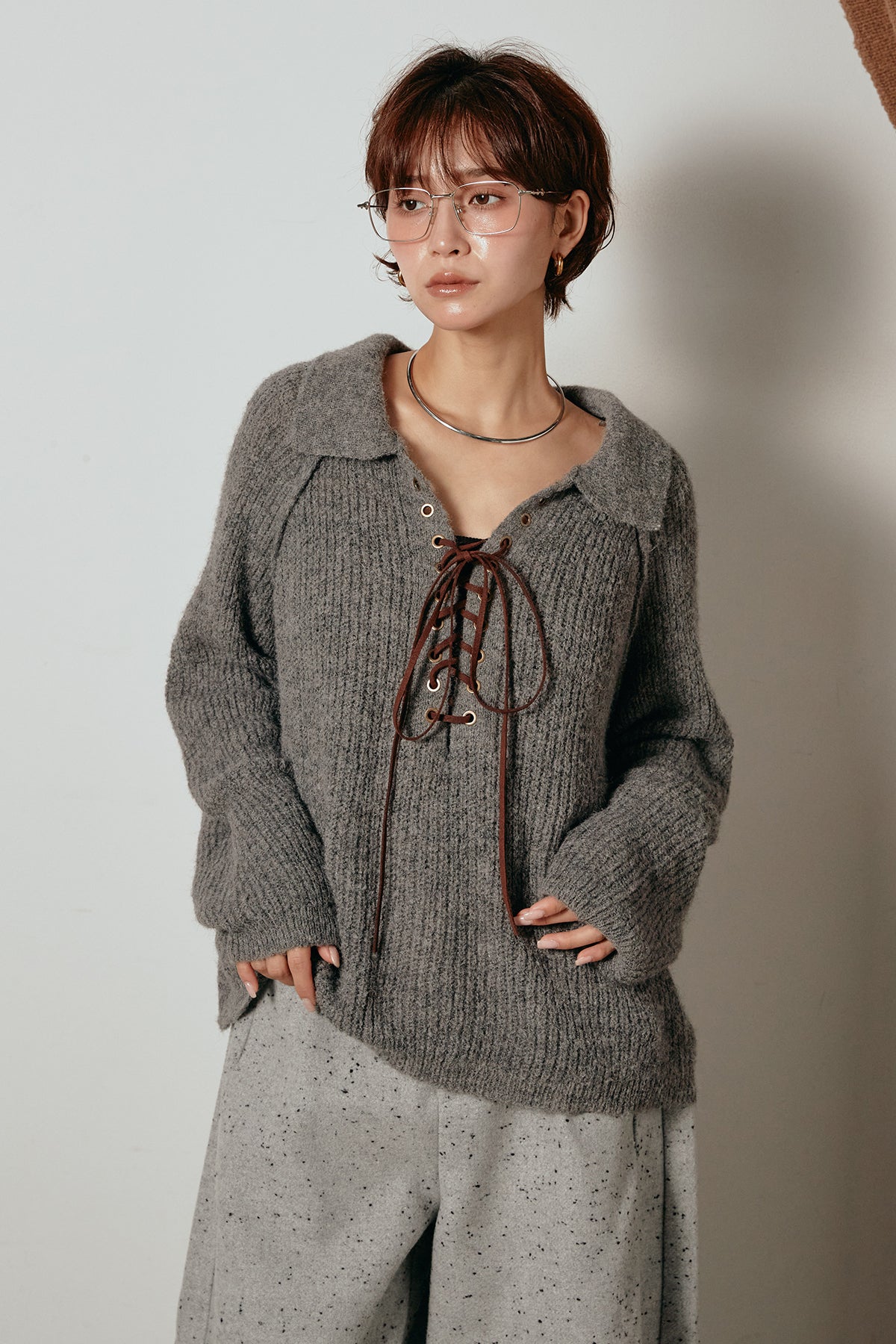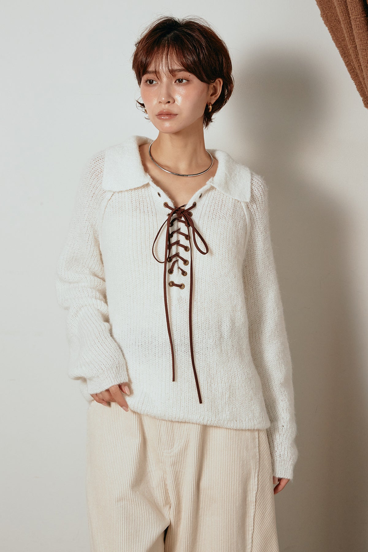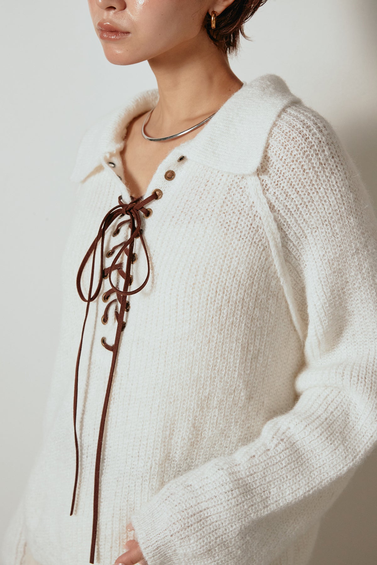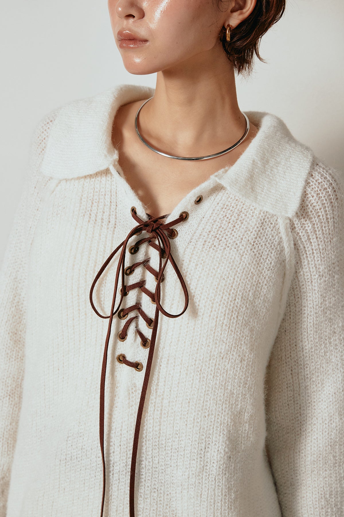 襟付きデザインとレースアップのディテールが印象的なニットトップス。胸元のレースアップが抜け感をプラスし、程よいボリュームのある袖が柔らかな印象を与えます。ざっくりとした編み地が季節感を高め、1枚で着ても存在感のあるスタイルに。パンツにもスカートにも合わせやすく、カジュアルからモードまで幅広く着回せるアイテムです。