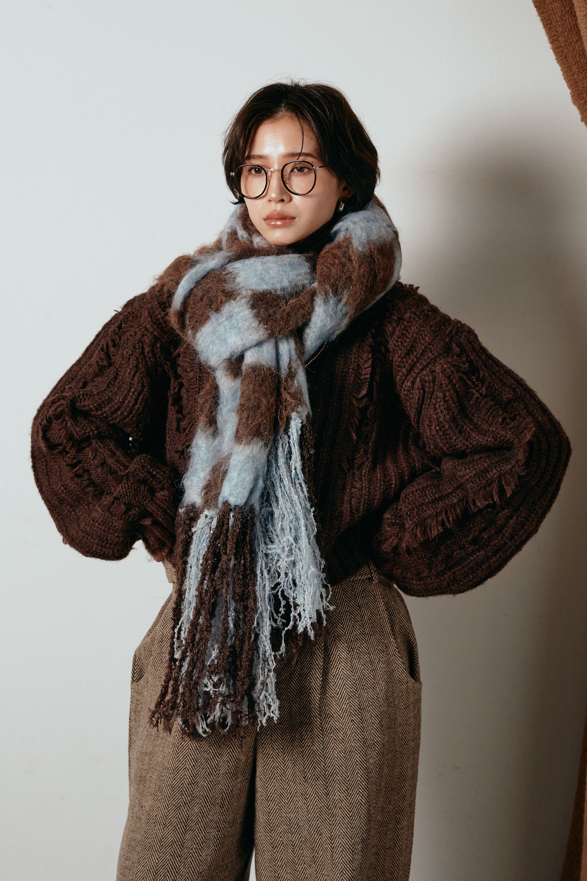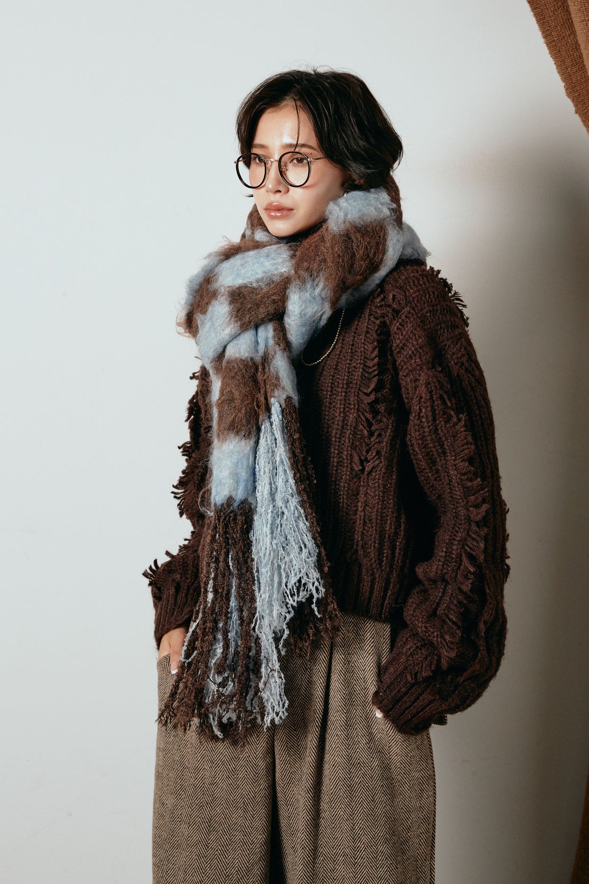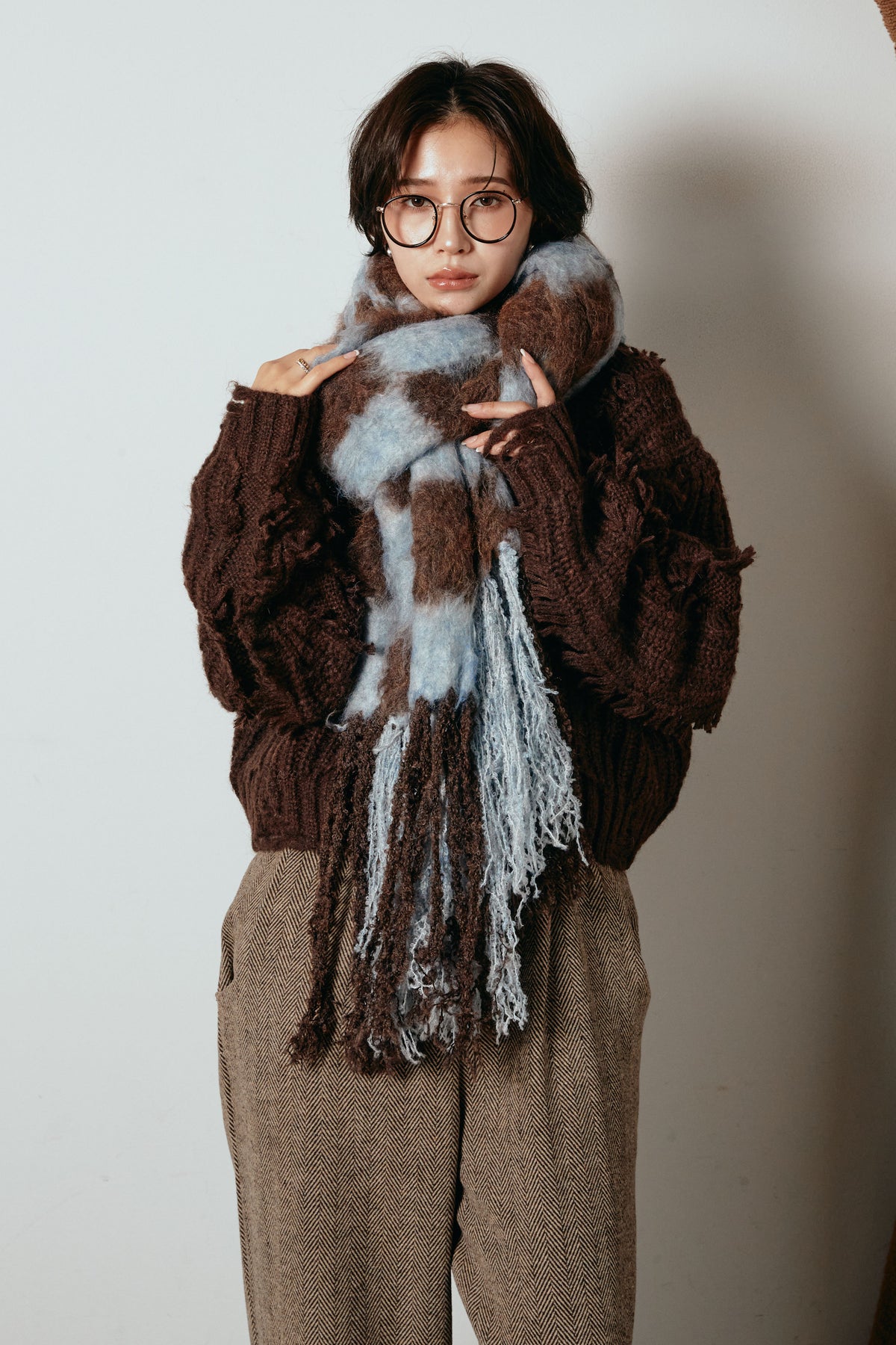 起毛感のあるチェック柄が存在感を放つマフラー。 ふんわりとした大判サイズで、巻き方次第で雰囲気を変えられるのがポイントです。 首元にボリュームを持たせるだけで季節感が一気に高まり、シンプルなスタイルにもメリハリをプラスしてくれるアイテムです。