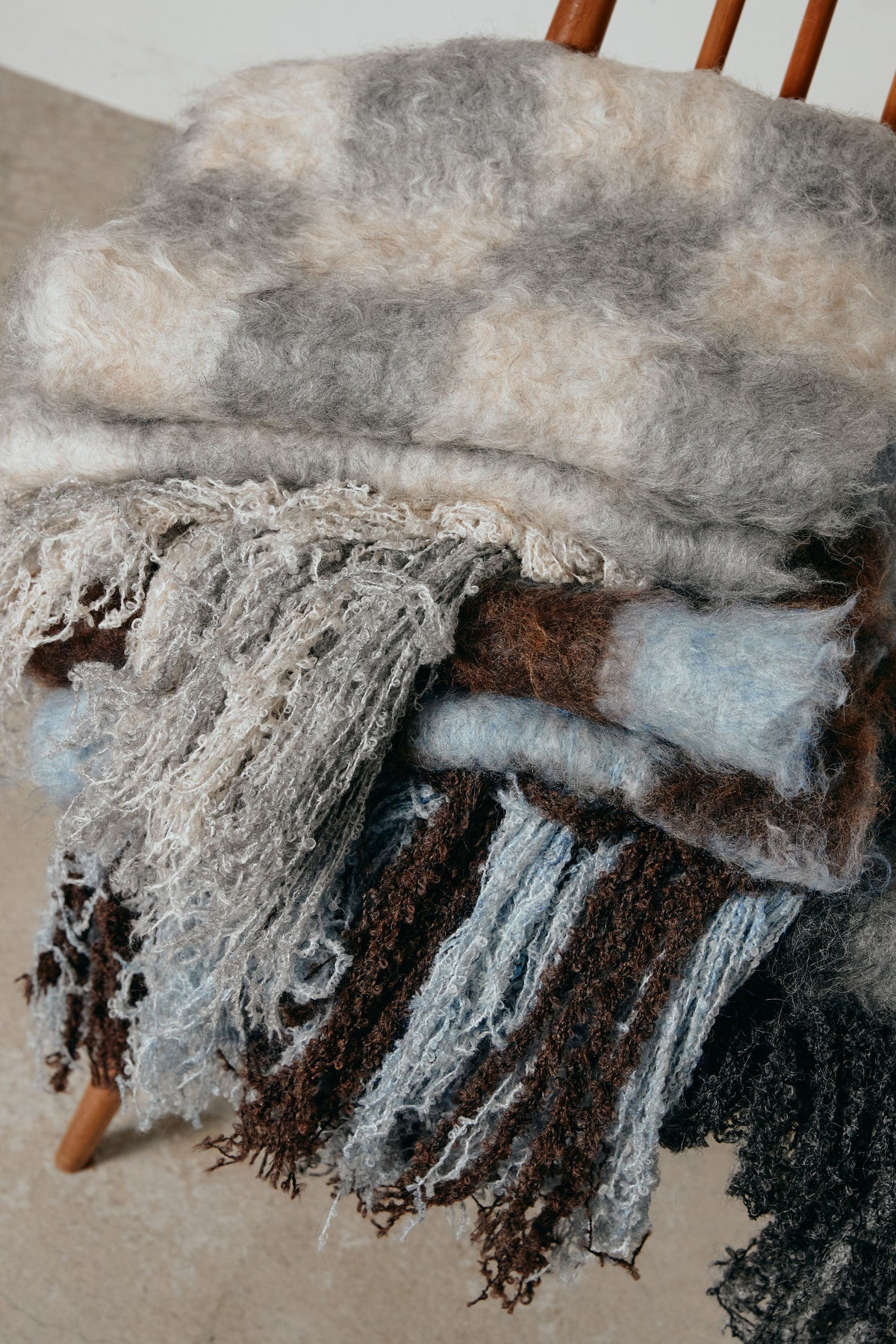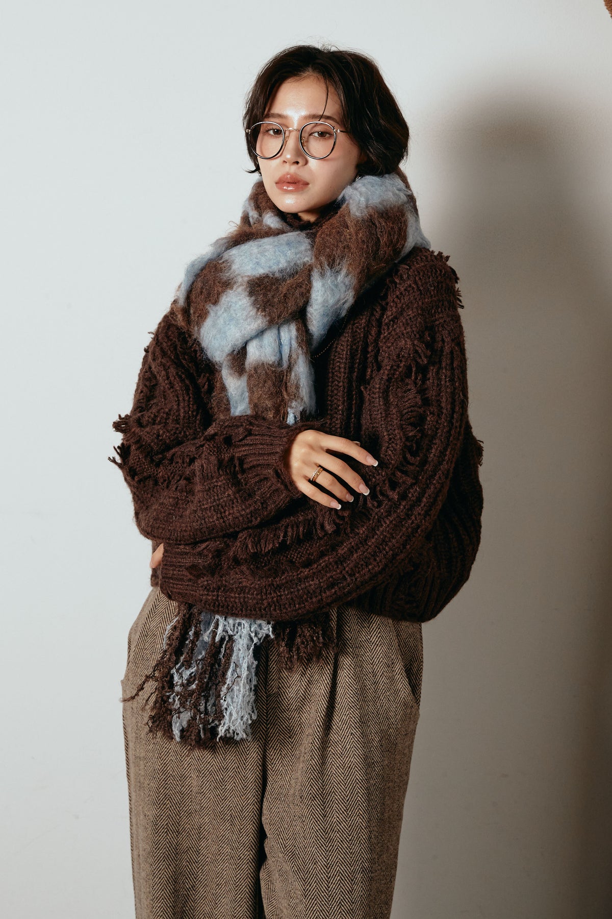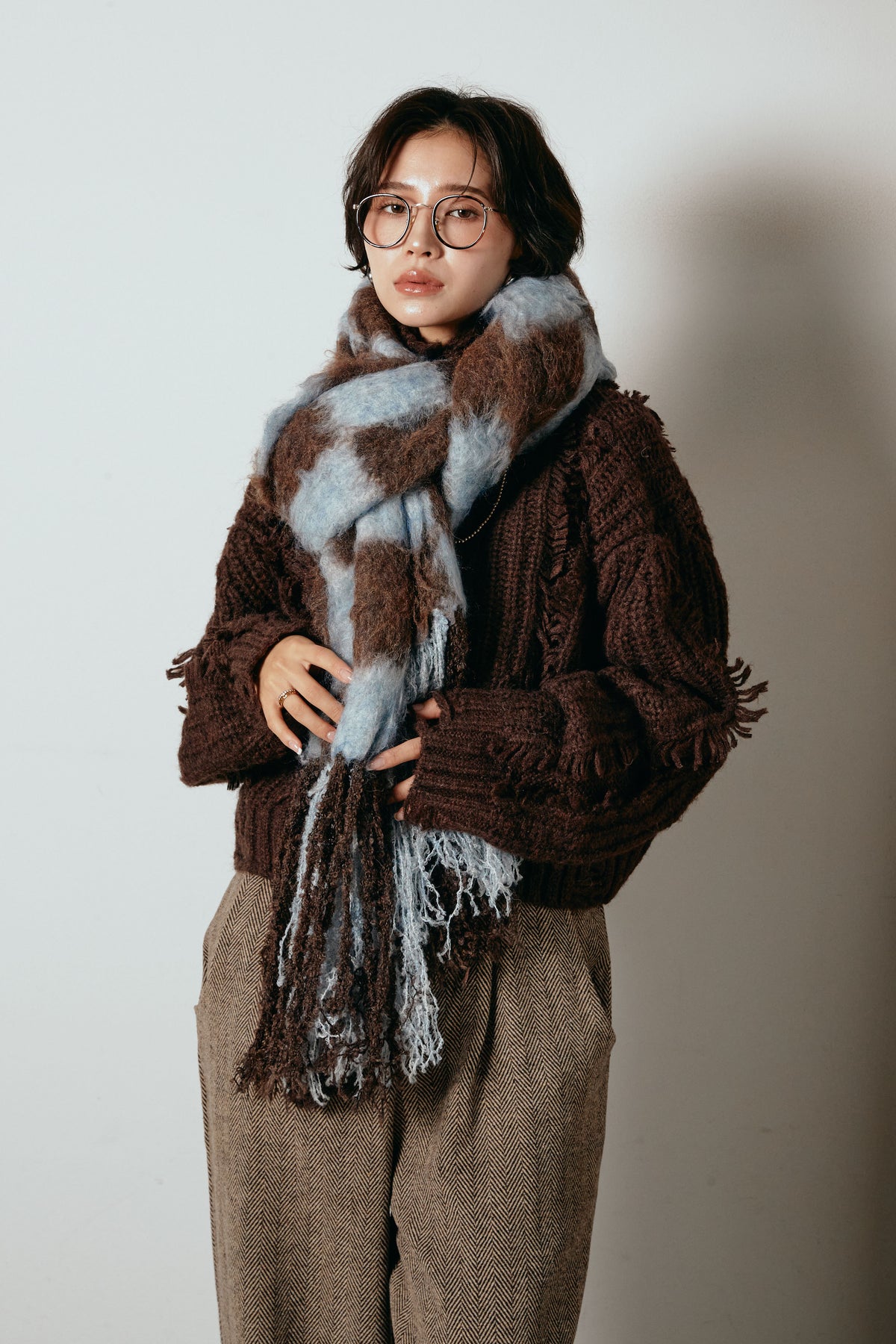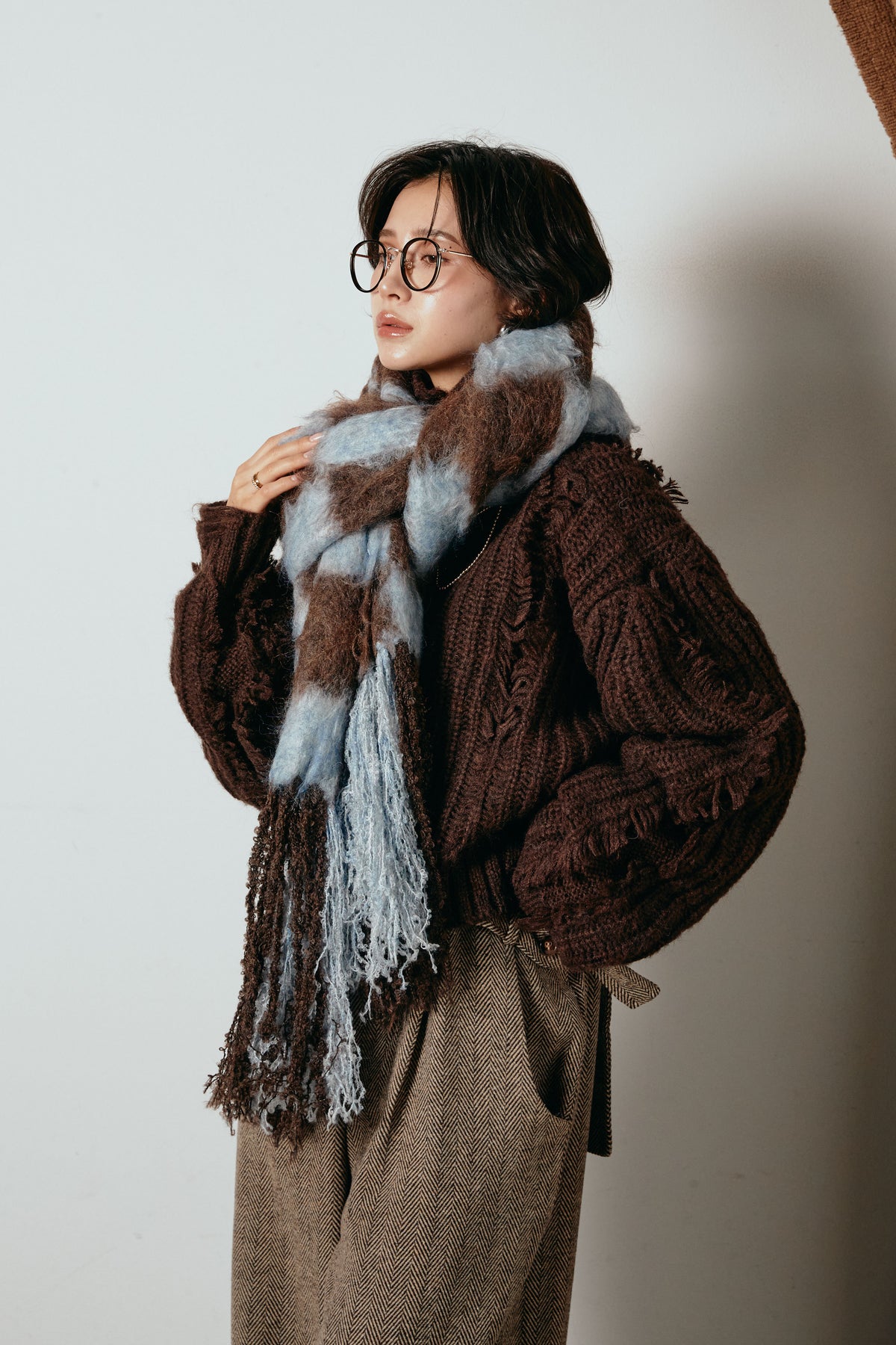 起毛感のあるチェック柄が存在感を放つマフラー。 ふんわりとした大判サイズで、巻き方次第で雰囲気を変えられるのがポイントです。 首元にボリュームを持たせるだけで季節感が一気に高まり、シンプルなスタイルにもメリハリをプラスしてくれるアイテムです。