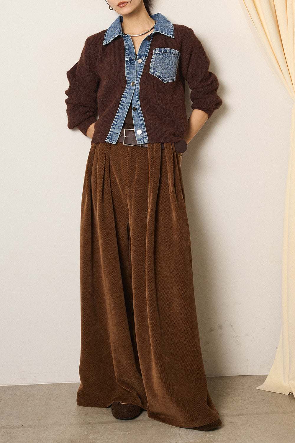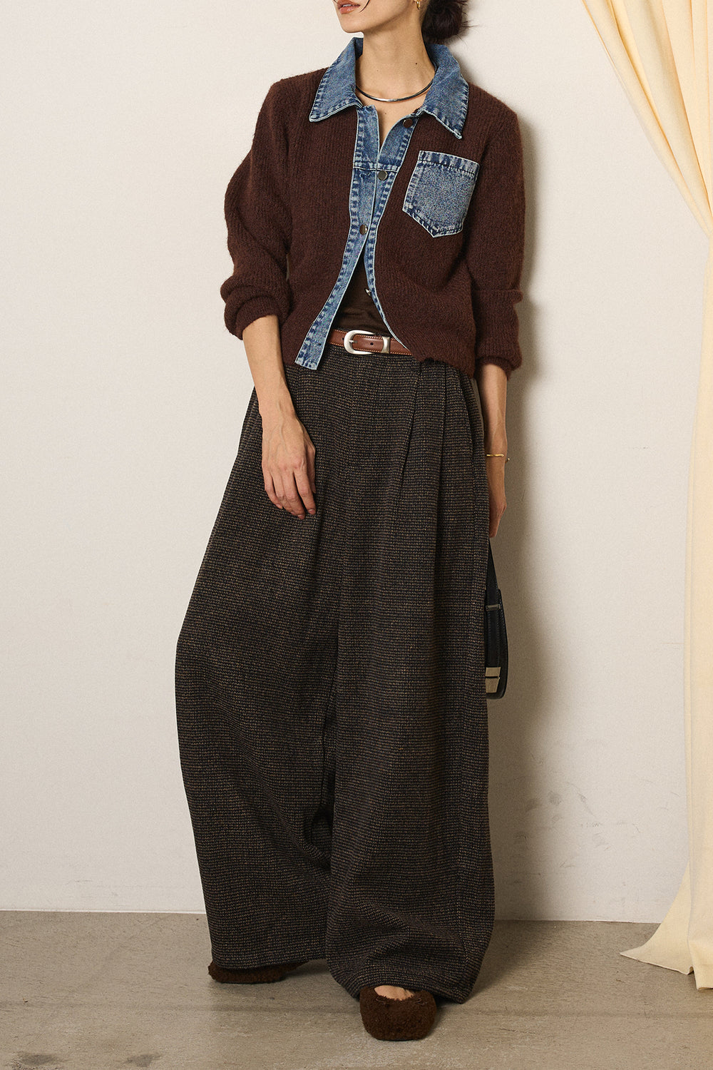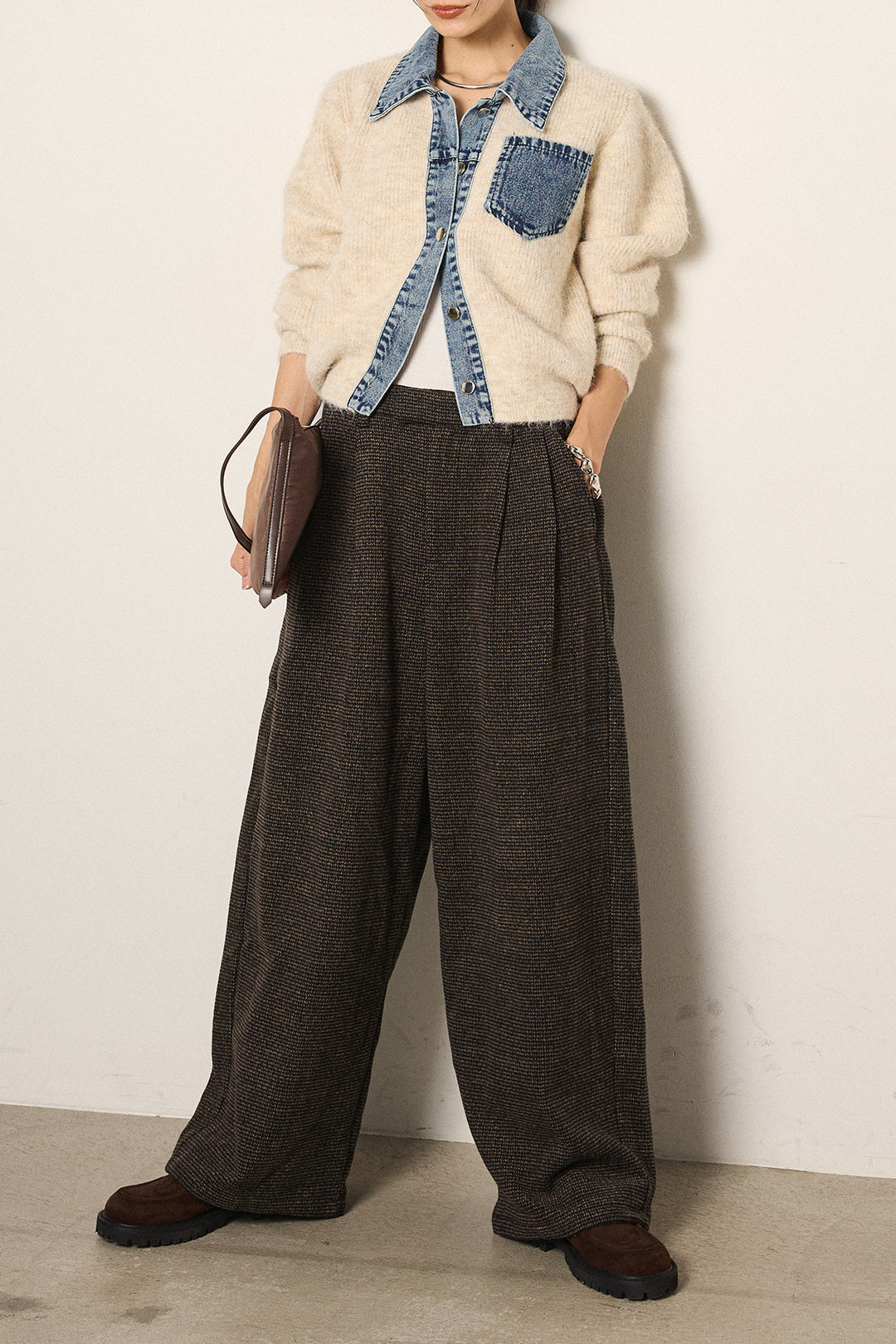 [SET]襟付きデニム切替ニットカーディガン+起毛タック入りツイードワイドパンツ(2set)