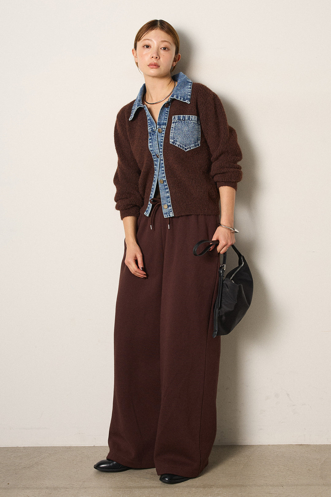 [SET]襟付きデニム切替ニットカーディガン+裏起毛スウェットワイドパンツ(2set)