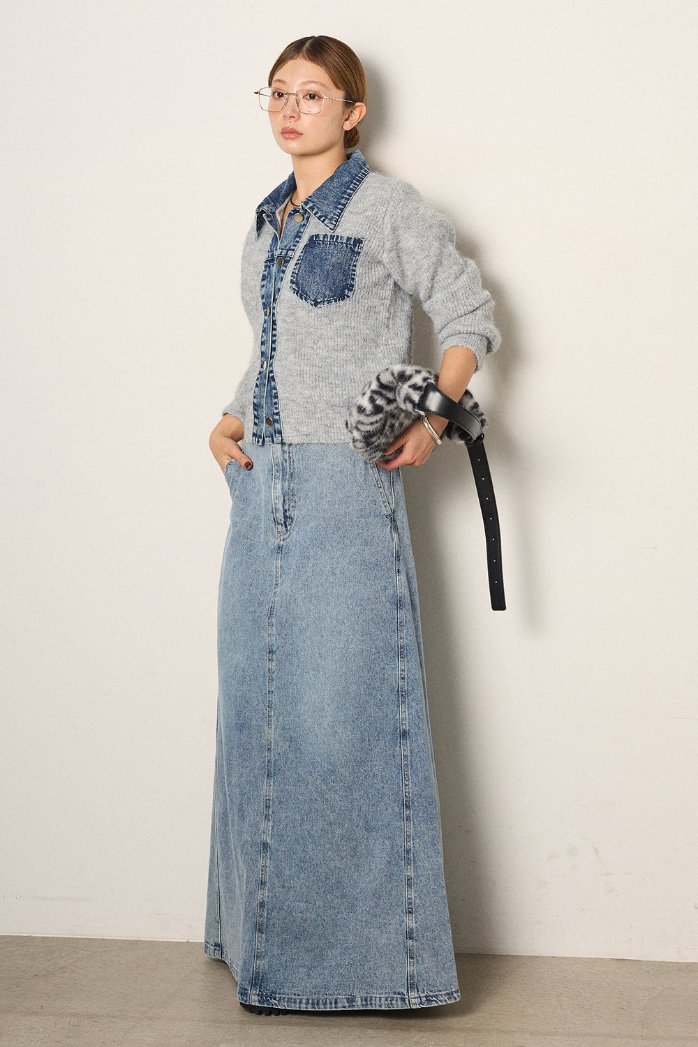 [SET]襟付きデニム切替ニットカーディガン+デニムロングフレアスカート(2set)