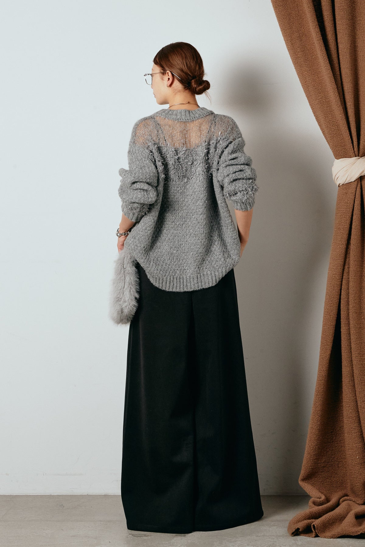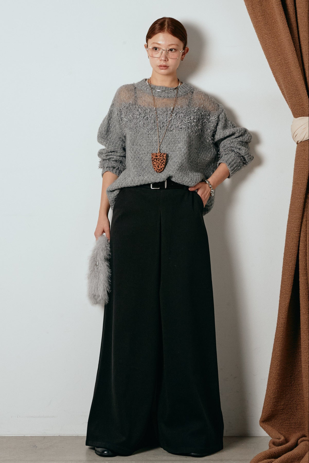 ランダムな編地切り替えを合わせたニットトップス。肩から胸元にかけての透け感と、ふわっとした立体的な編み表情がアクセントになり、シンプルながら印象のあるバランスに。身頃はすっきりした編地でまとめているので、ゆったりしたフォルムでも重たく見えにくく、パンツやスカートなど幅広く合わせやすいアイテムです。