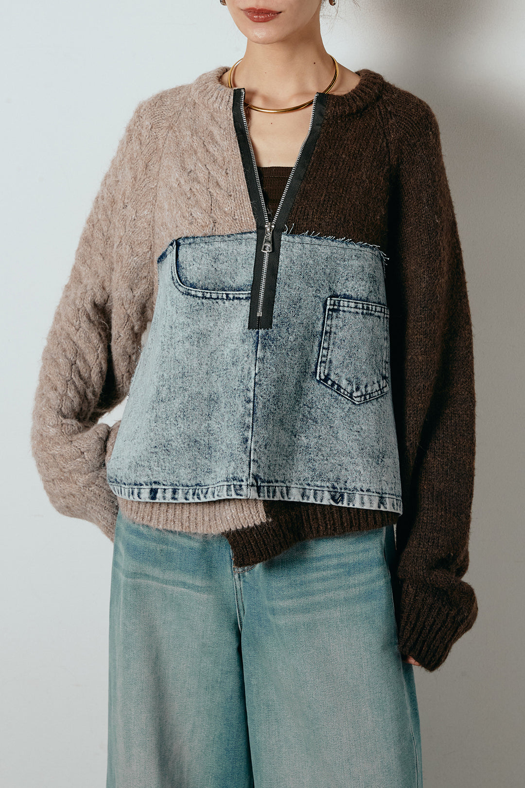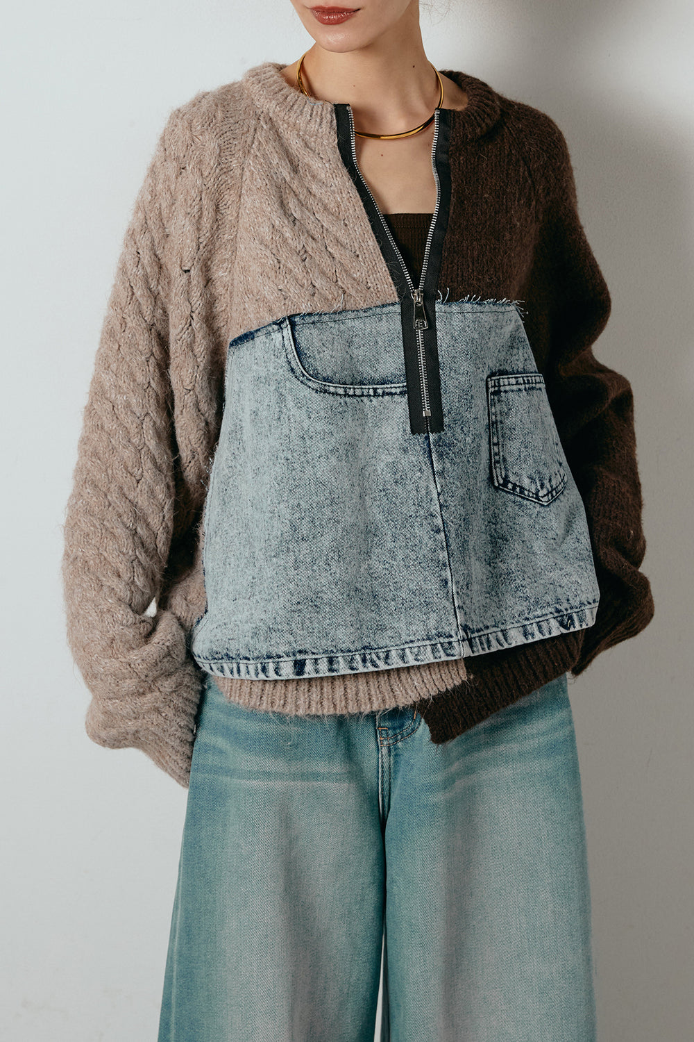 [SET]ハーフジップニットデニムドッキングトップス+裏起毛スウェットワイドパンツ(2set)