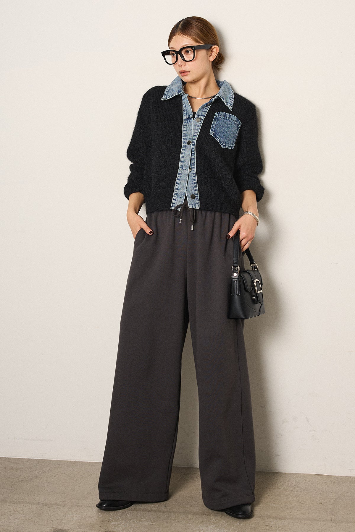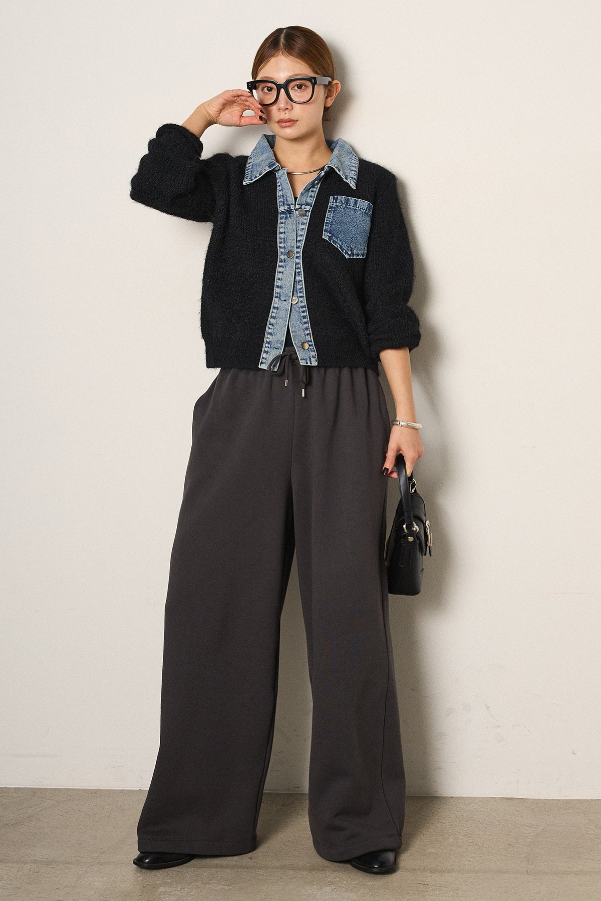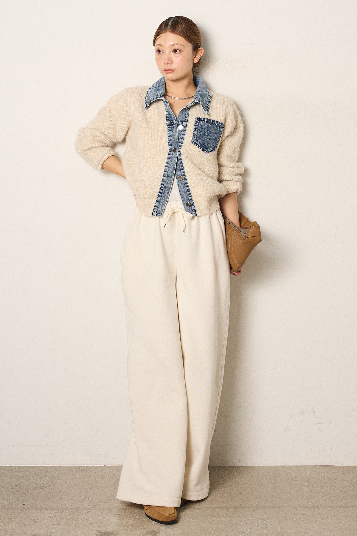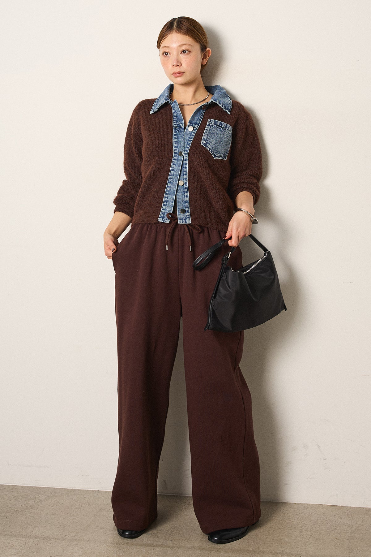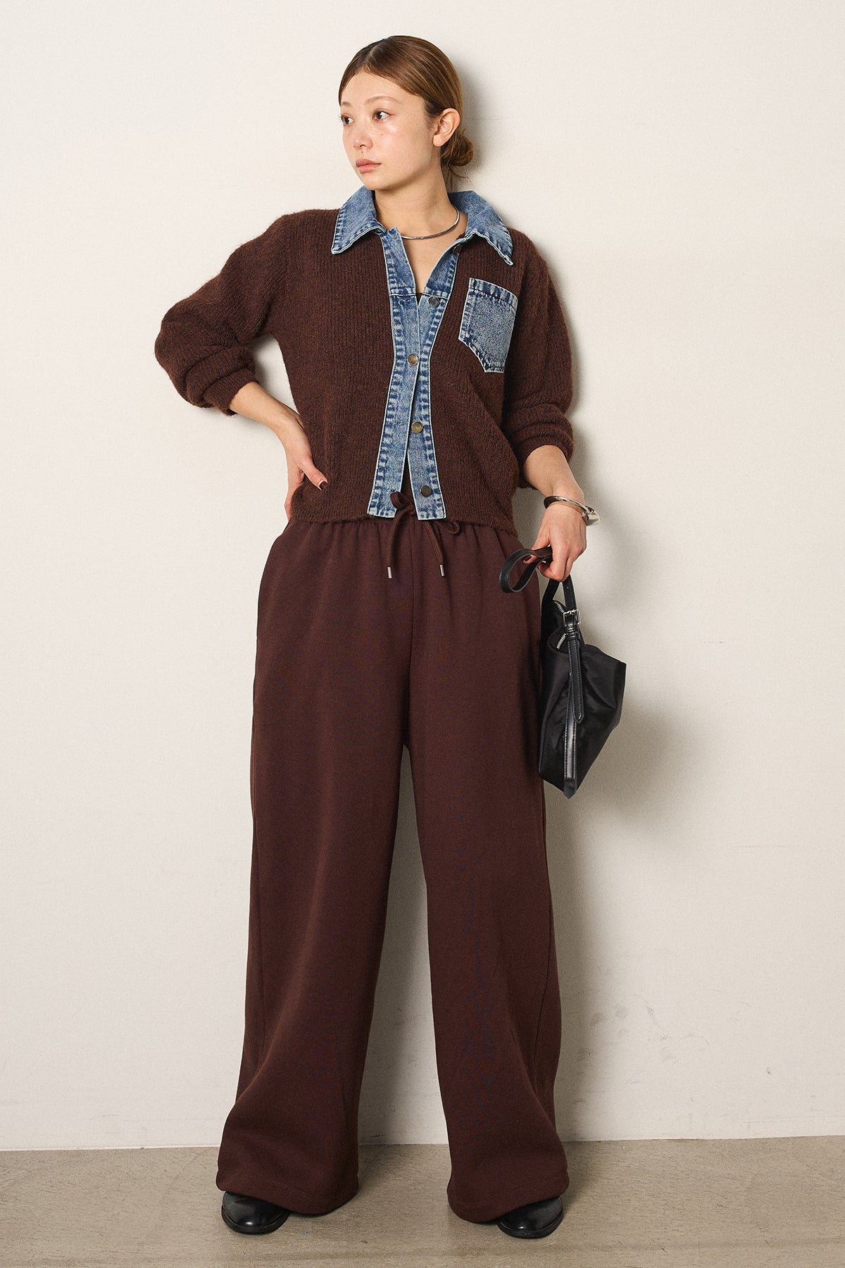 [SET]襟付きデニム切替ニットカーディガン+裏起毛スウェットワイドパンツ(2set)