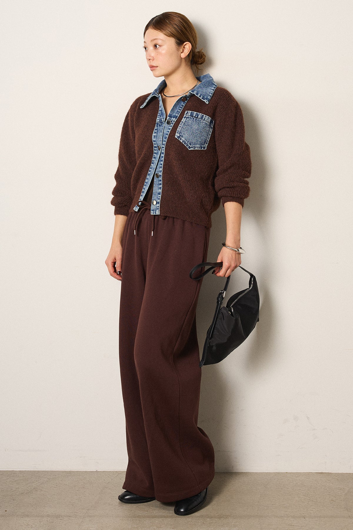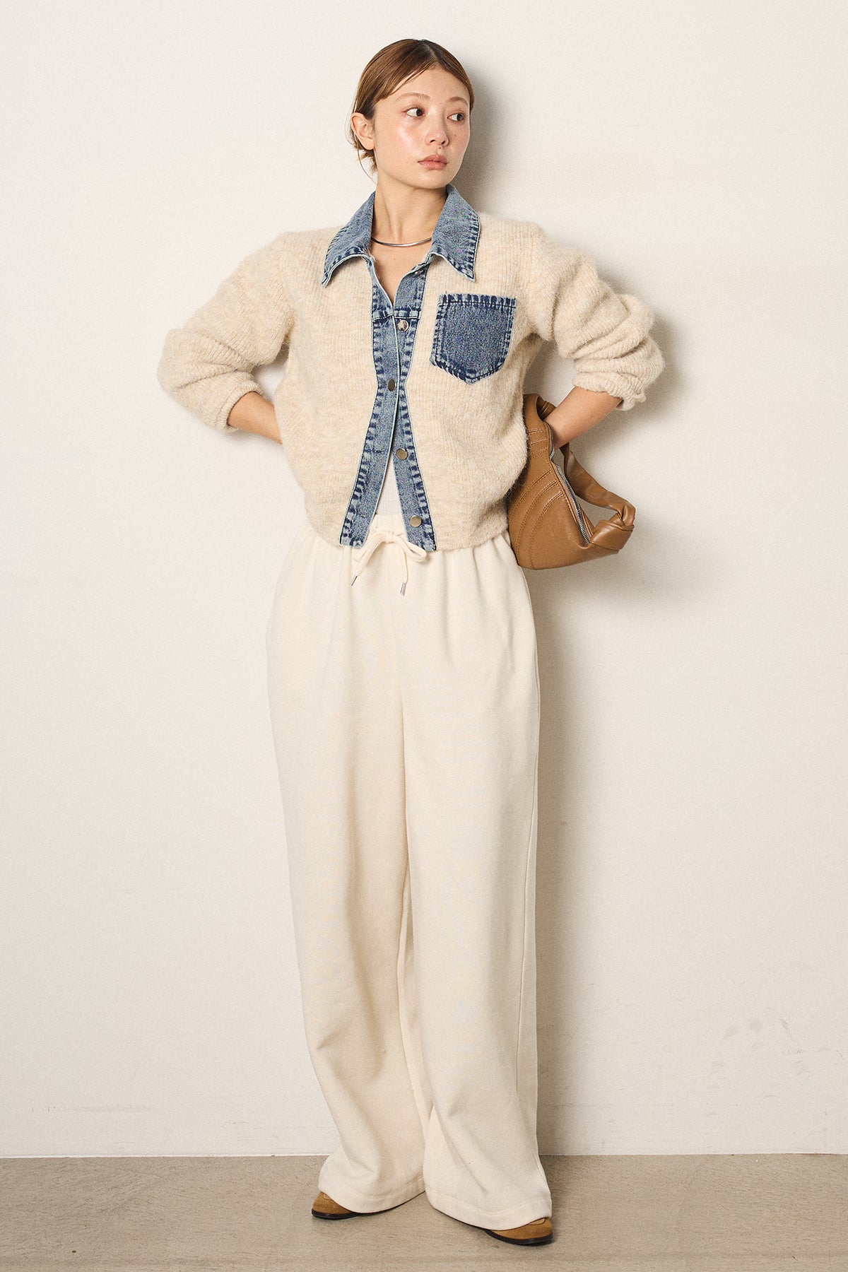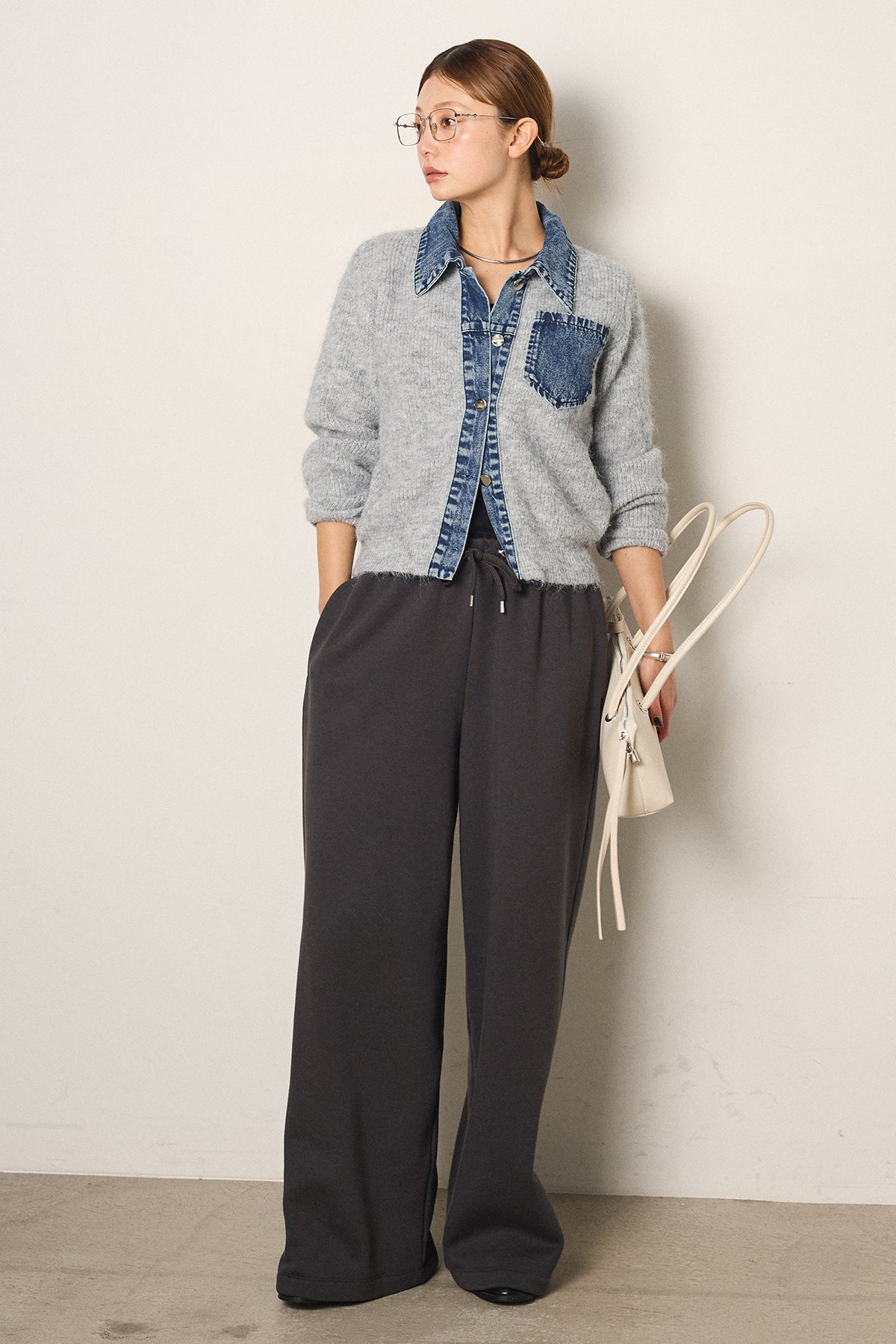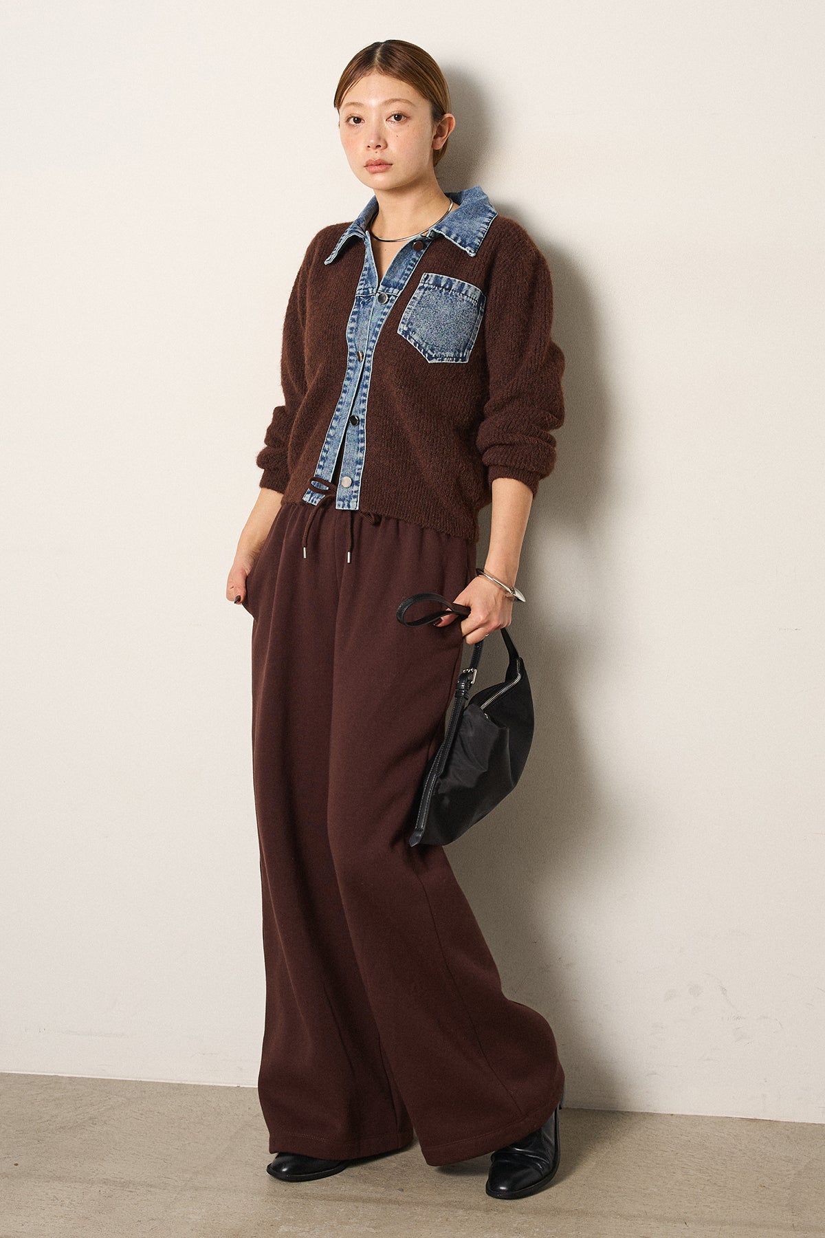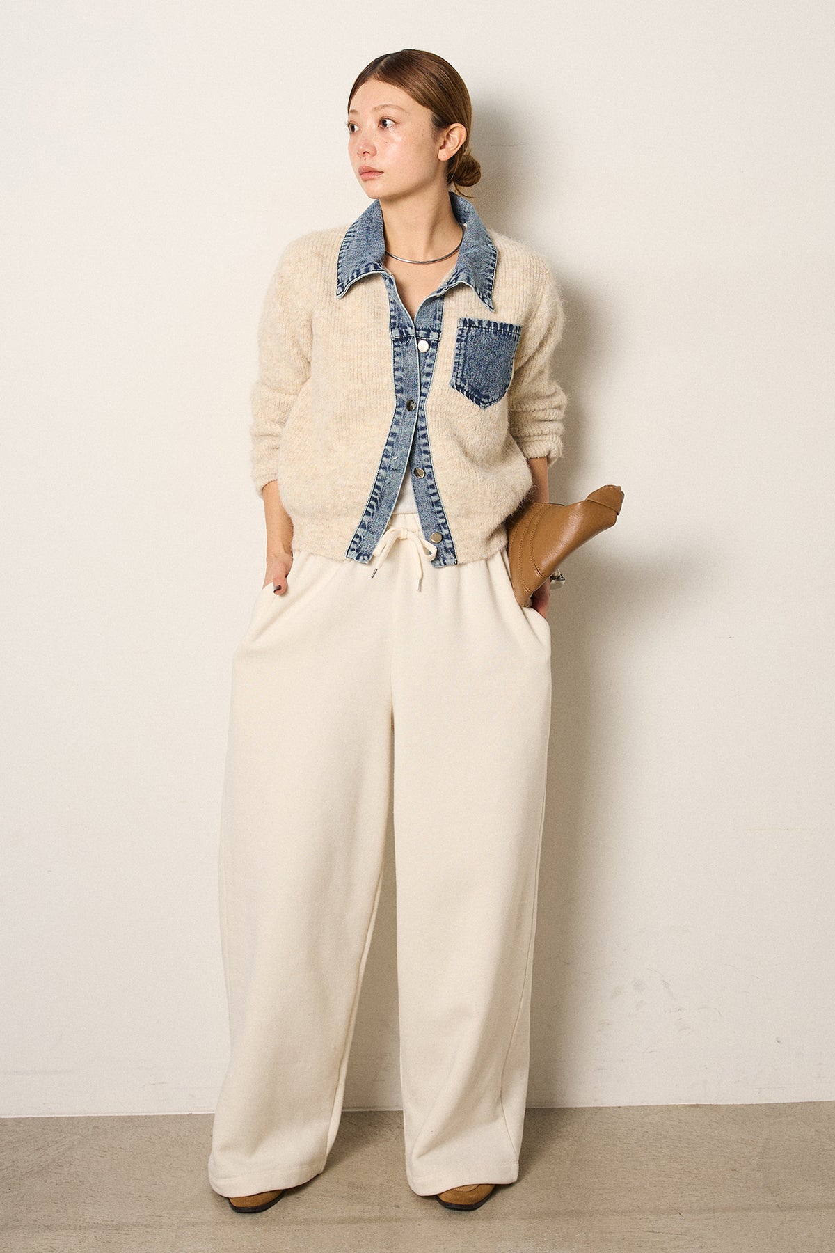 [SET]襟付きデニム切替ニットカーディガン+裏起毛スウェットワイドパンツ(2set)