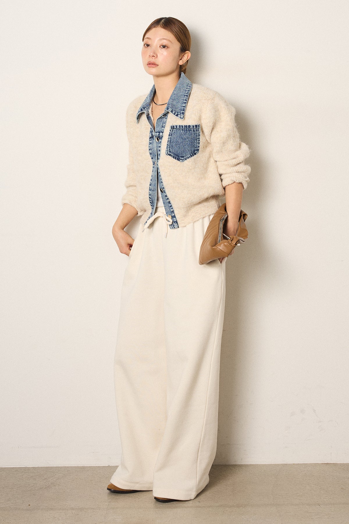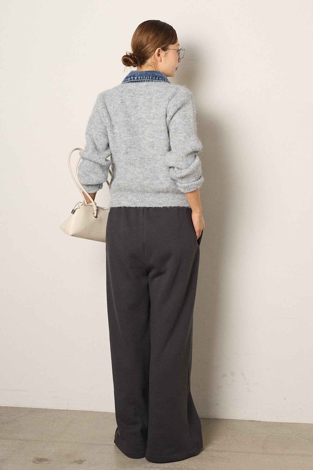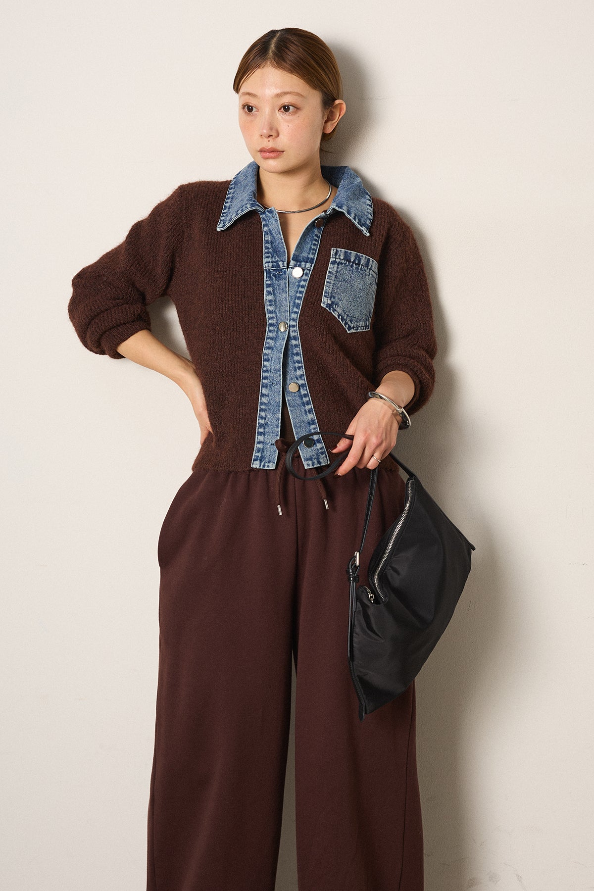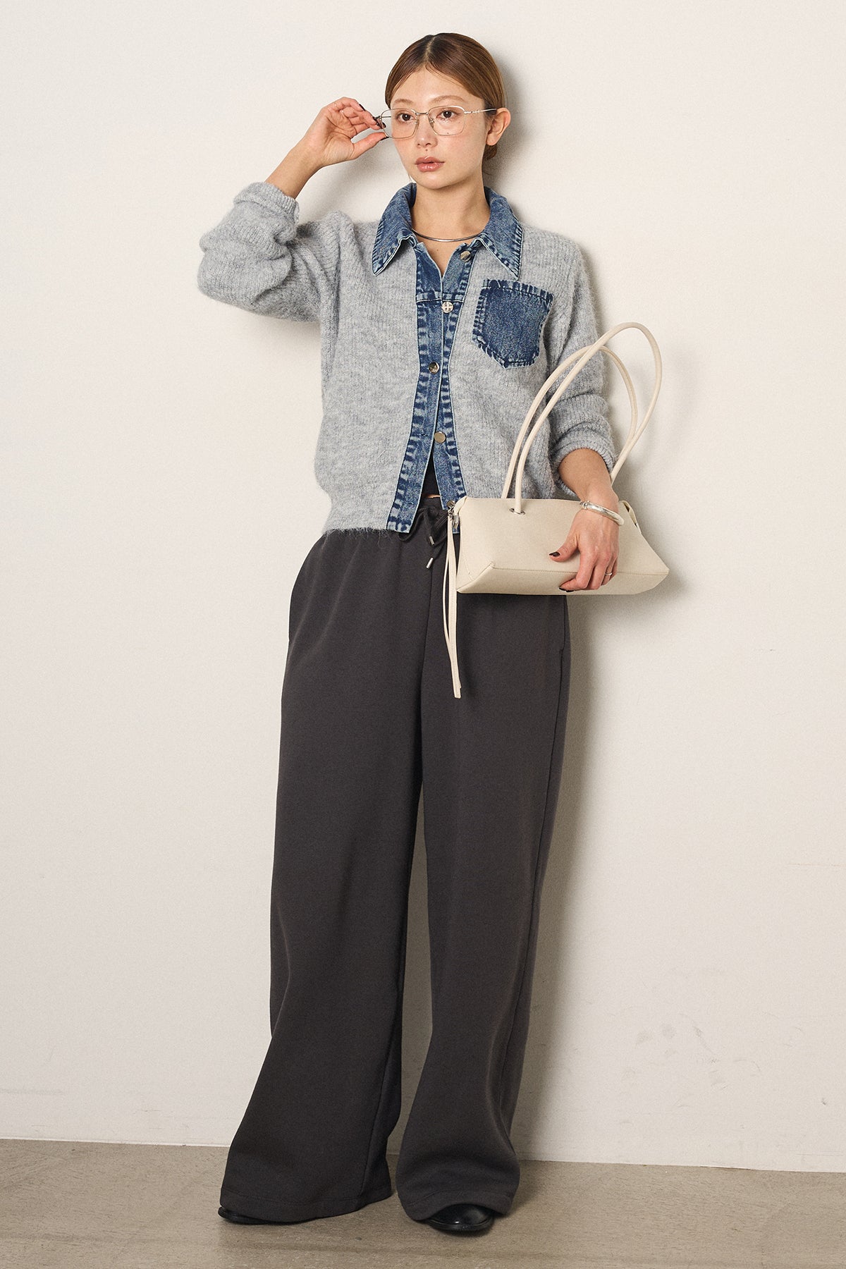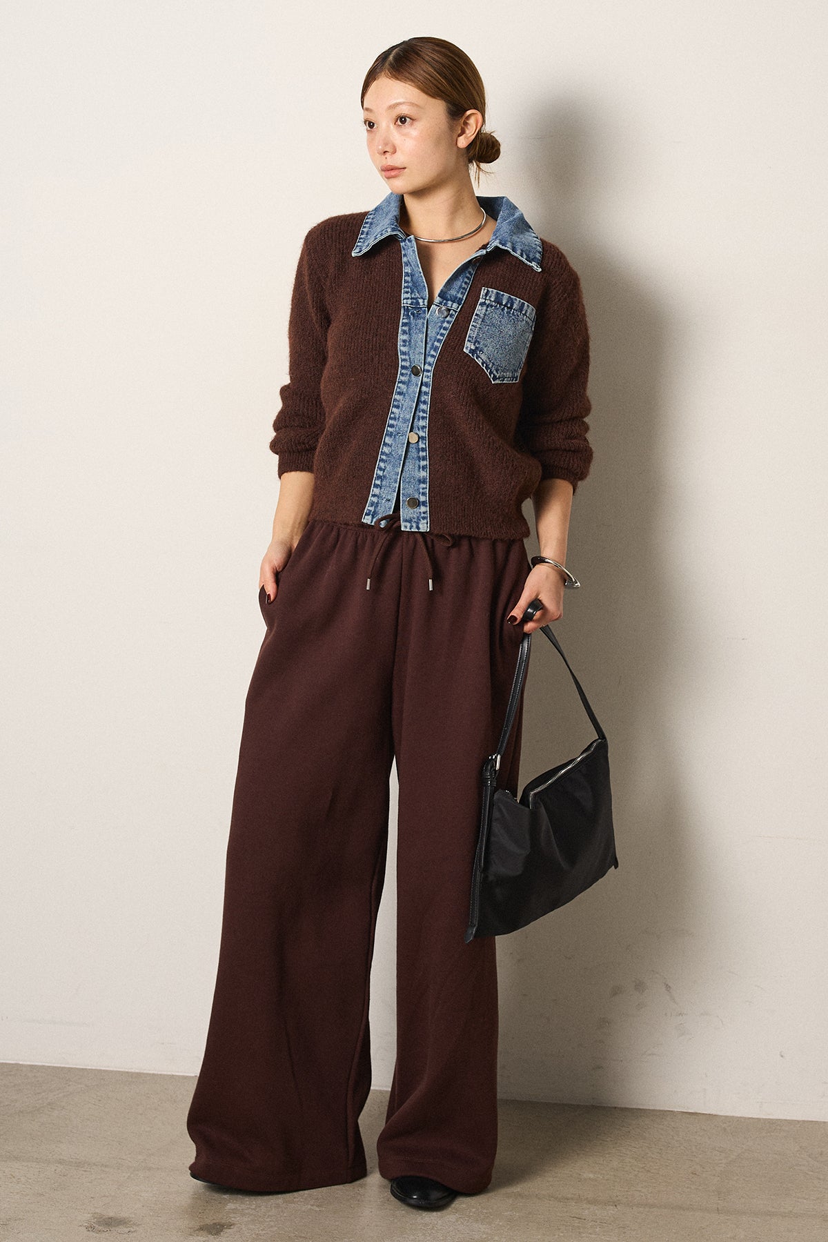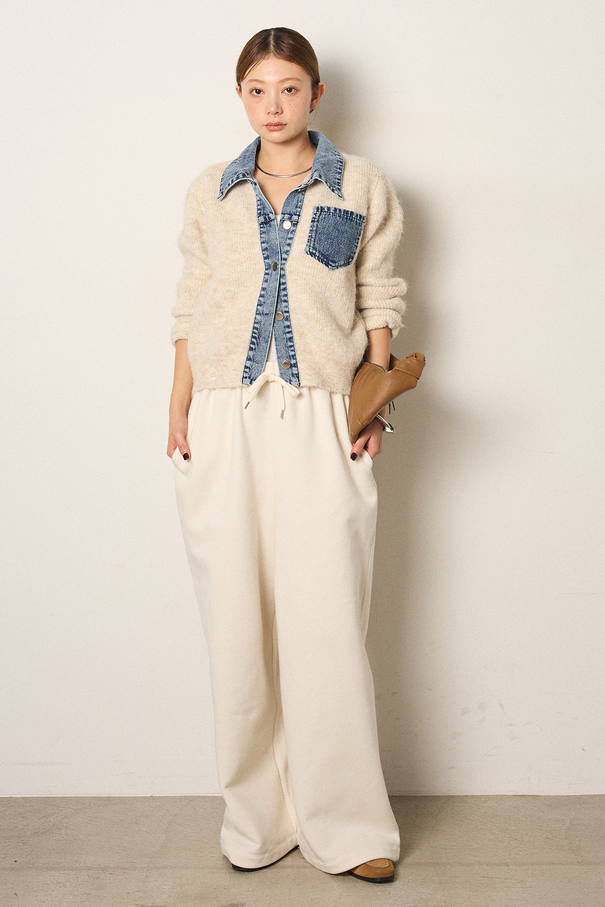 [SET]襟付きデニム切替ニットカーディガン+裏起毛スウェットワイドパンツ(2set)