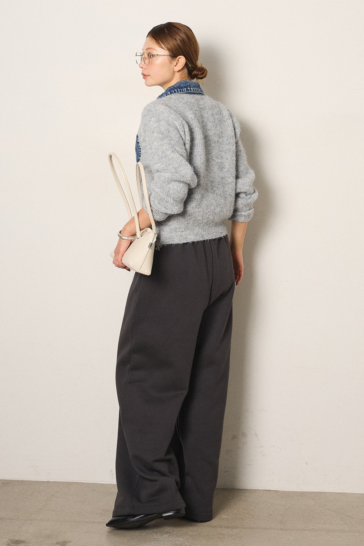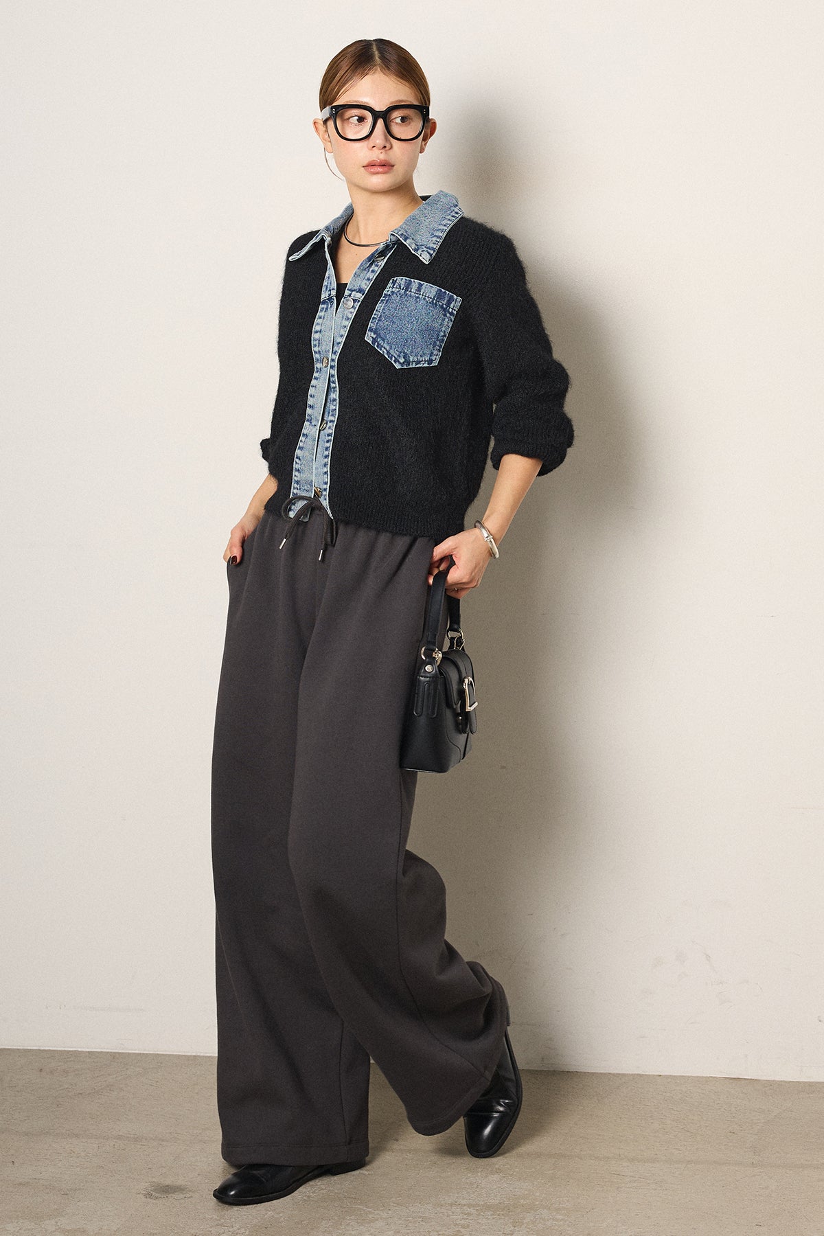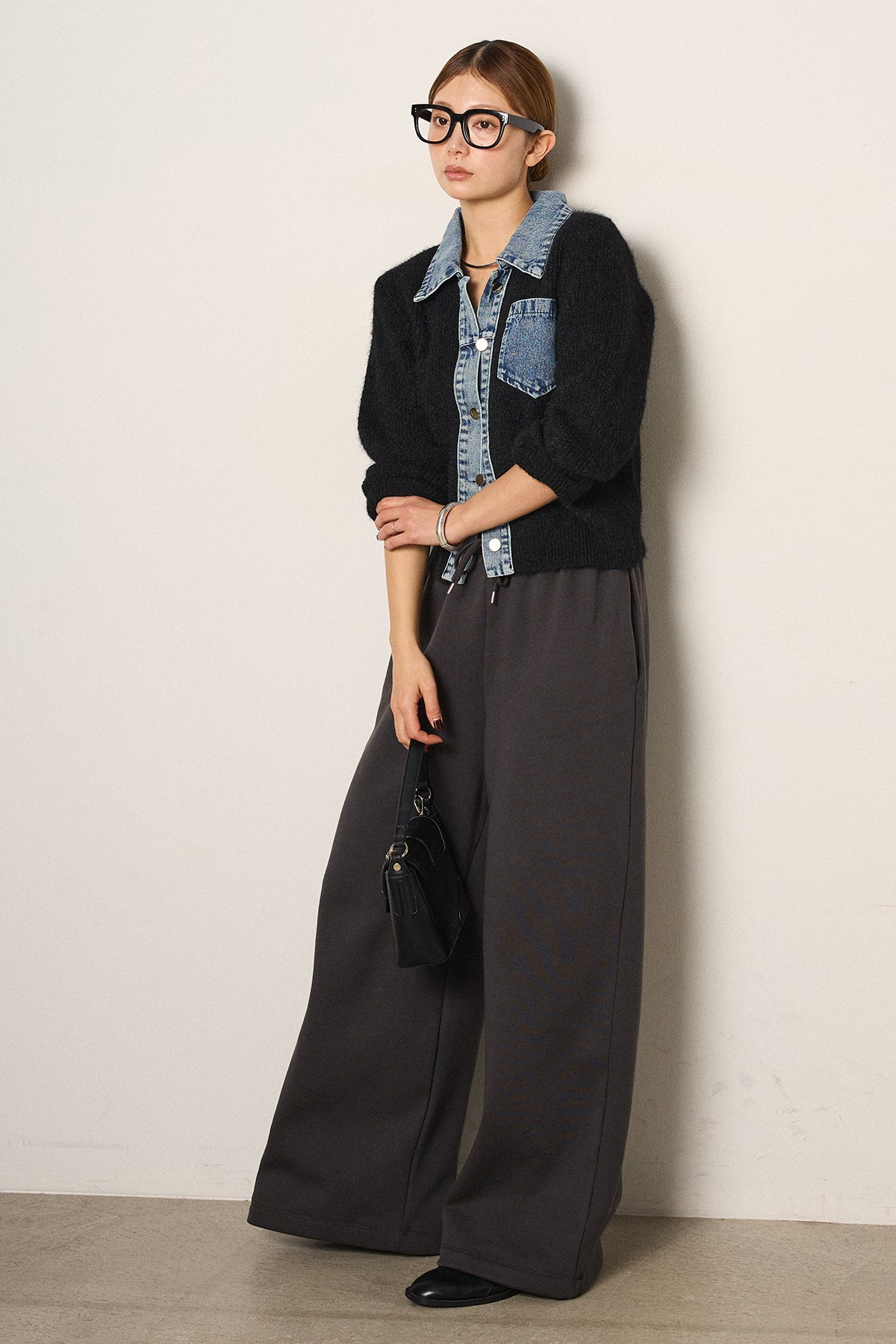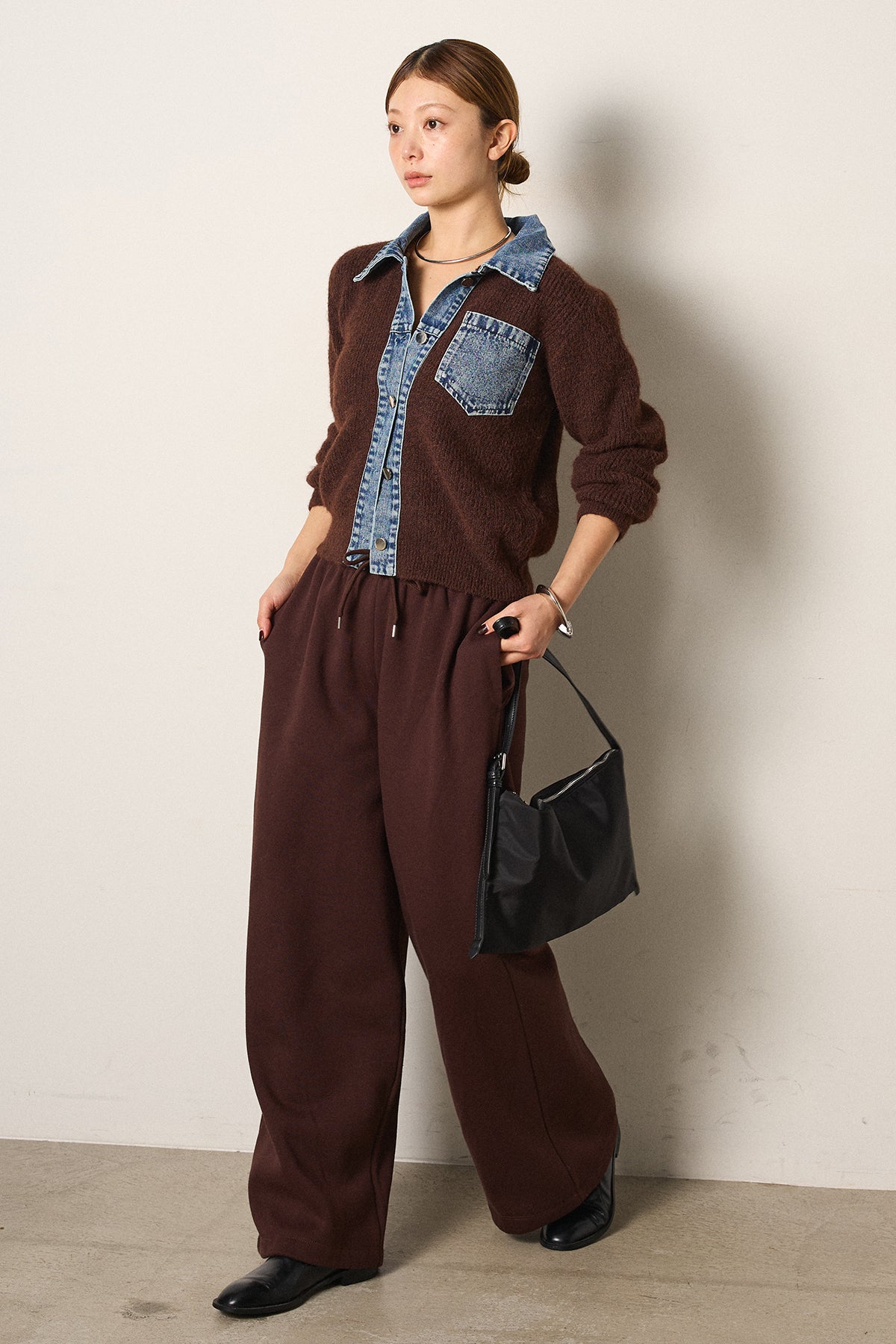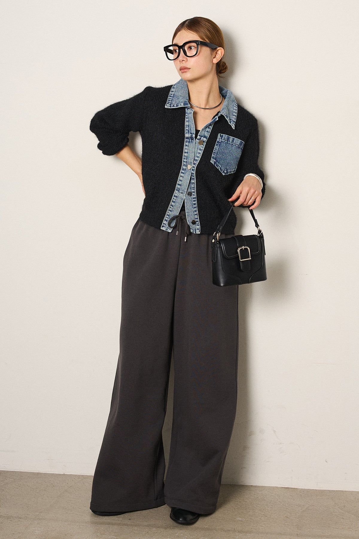 [SET]襟付きデニム切替ニットカーディガン+裏起毛スウェットワイドパンツ(2set)