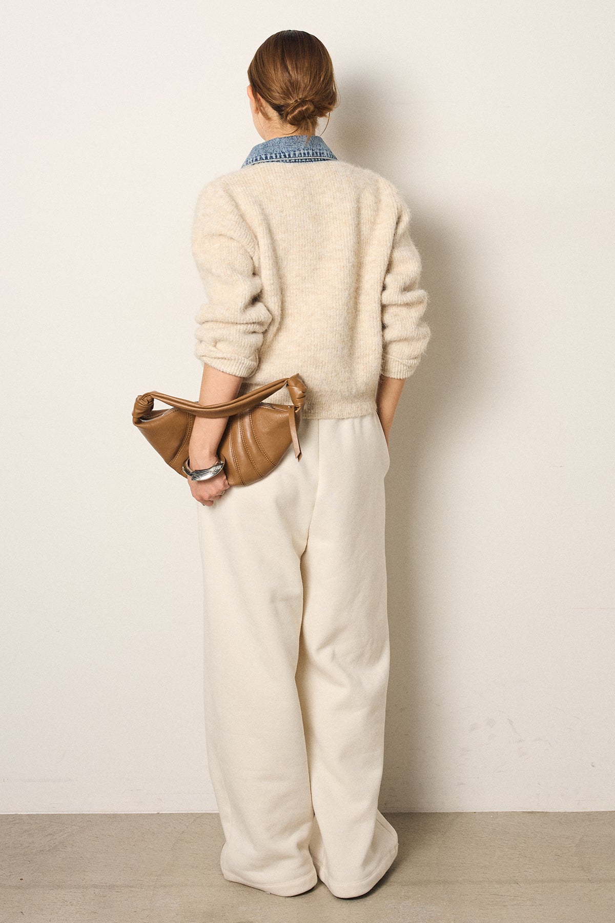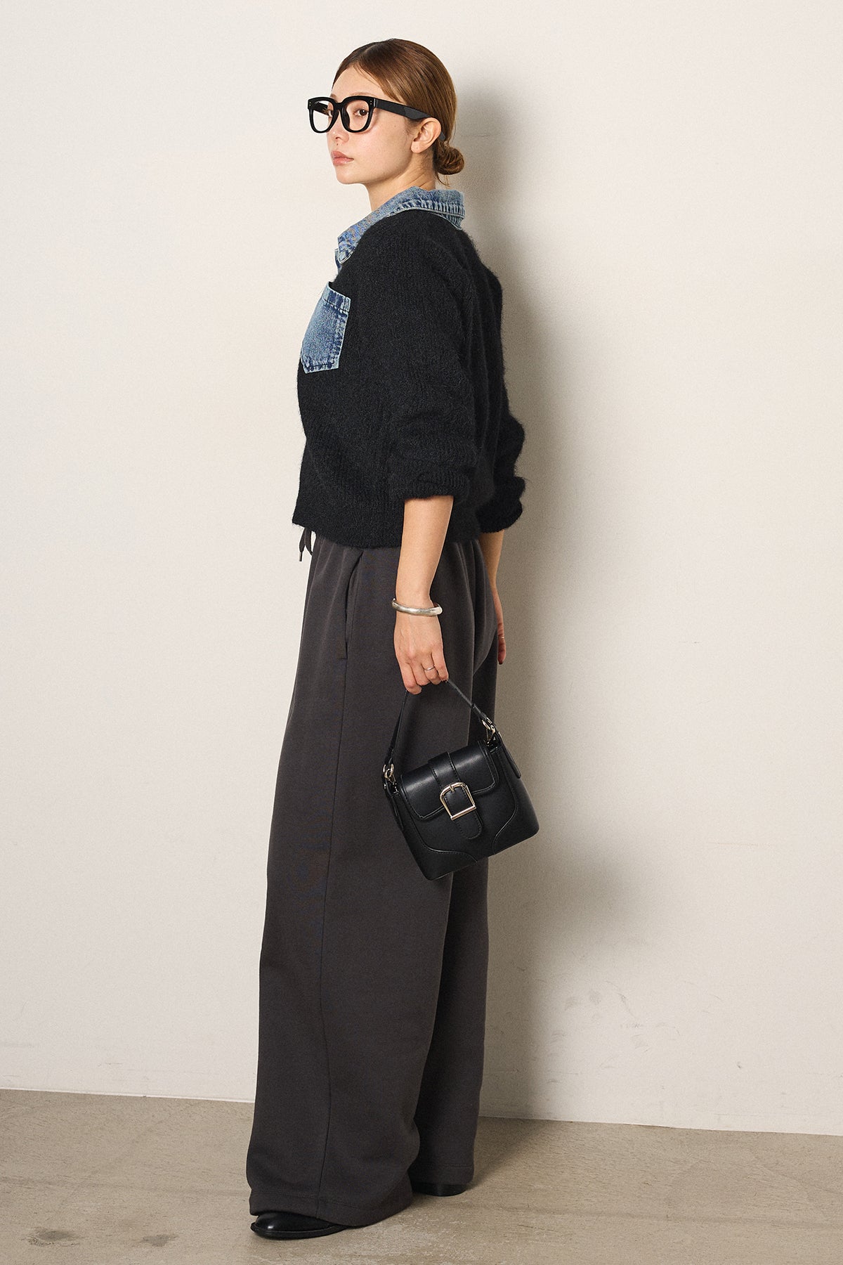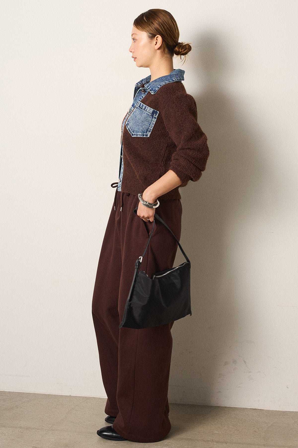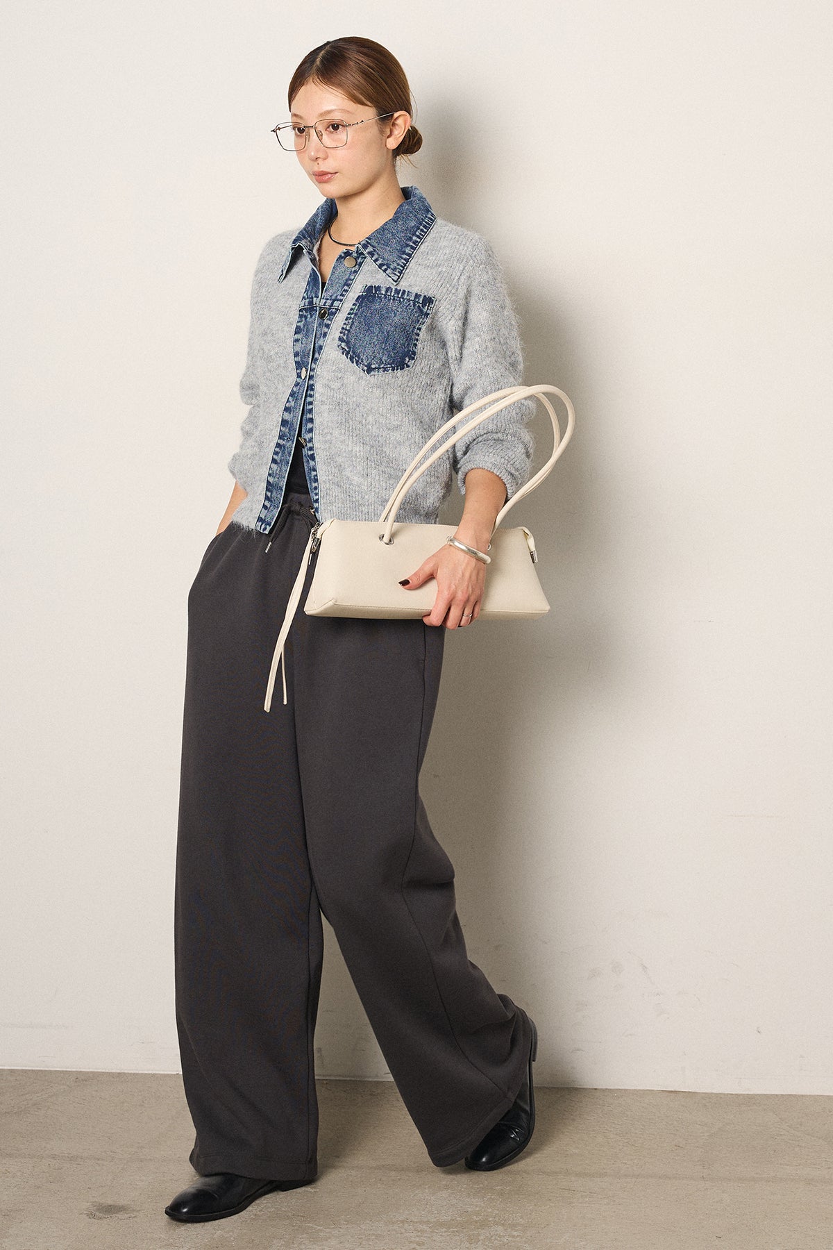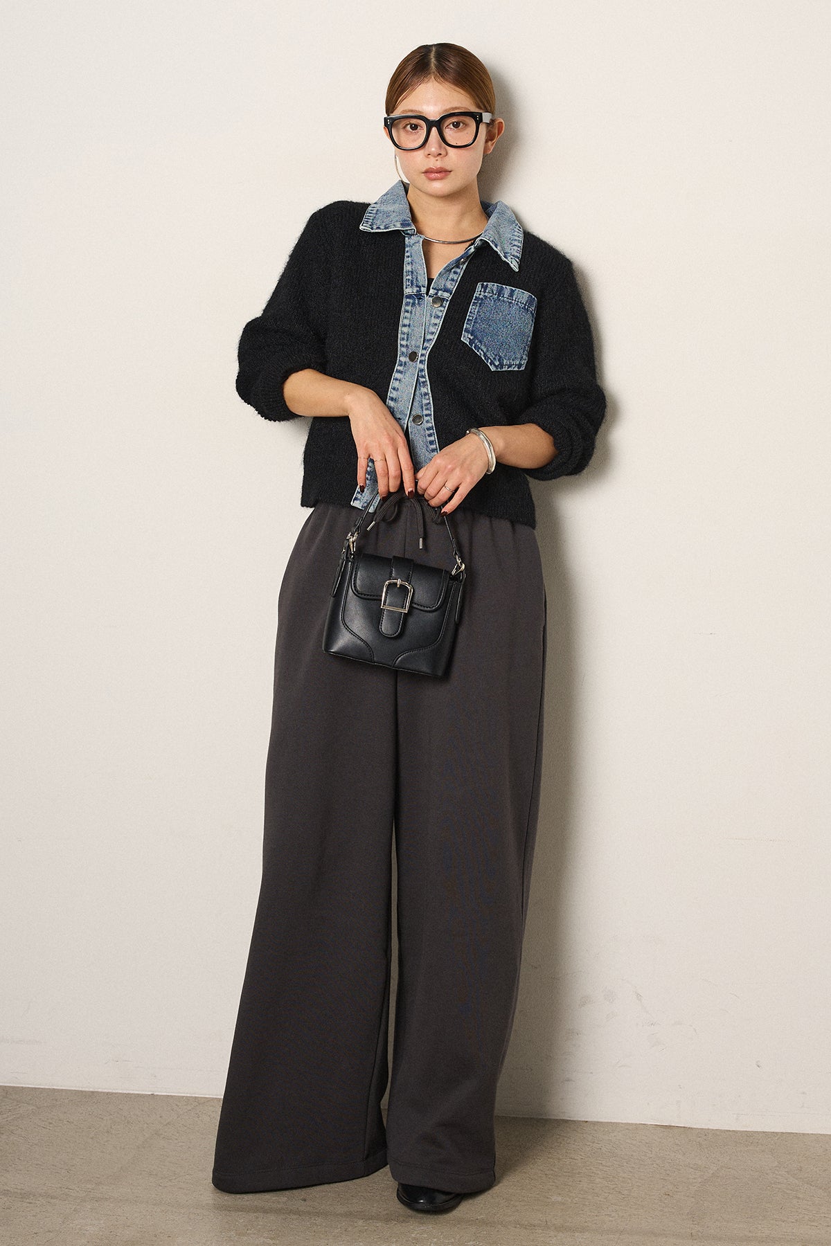 [SET]襟付きデニム切替ニットカーディガン+裏起毛スウェットワイドパンツ(2set)