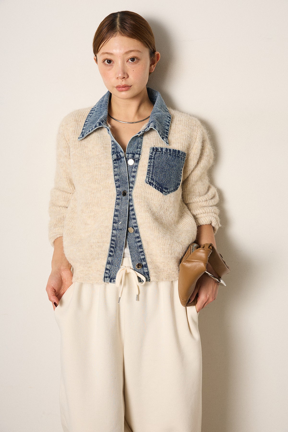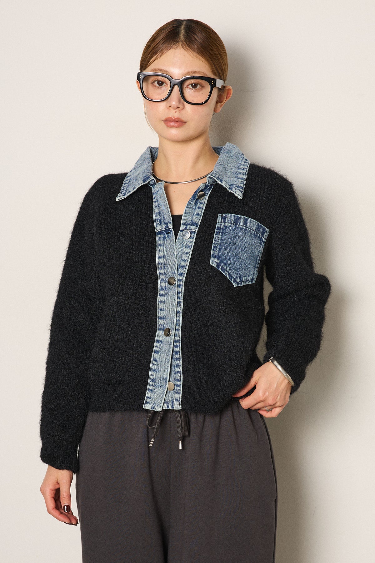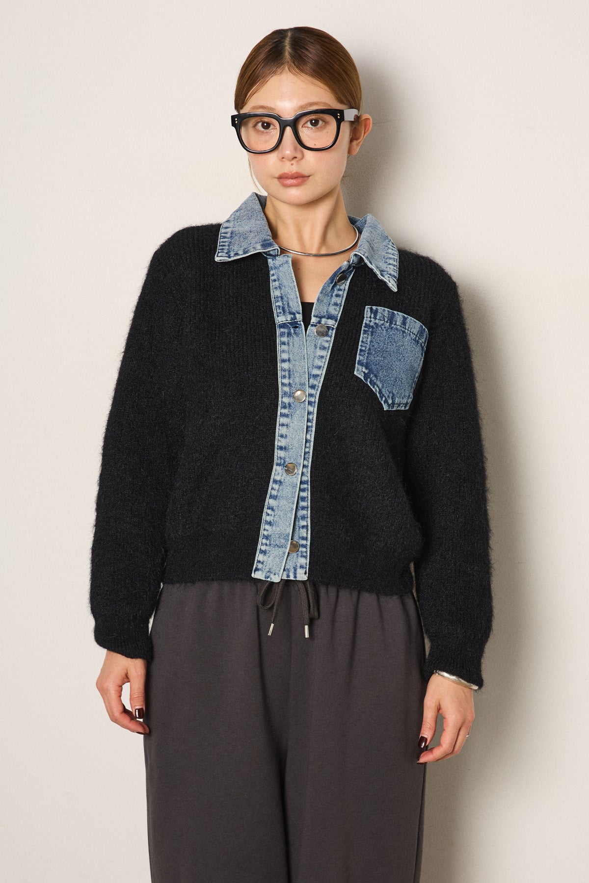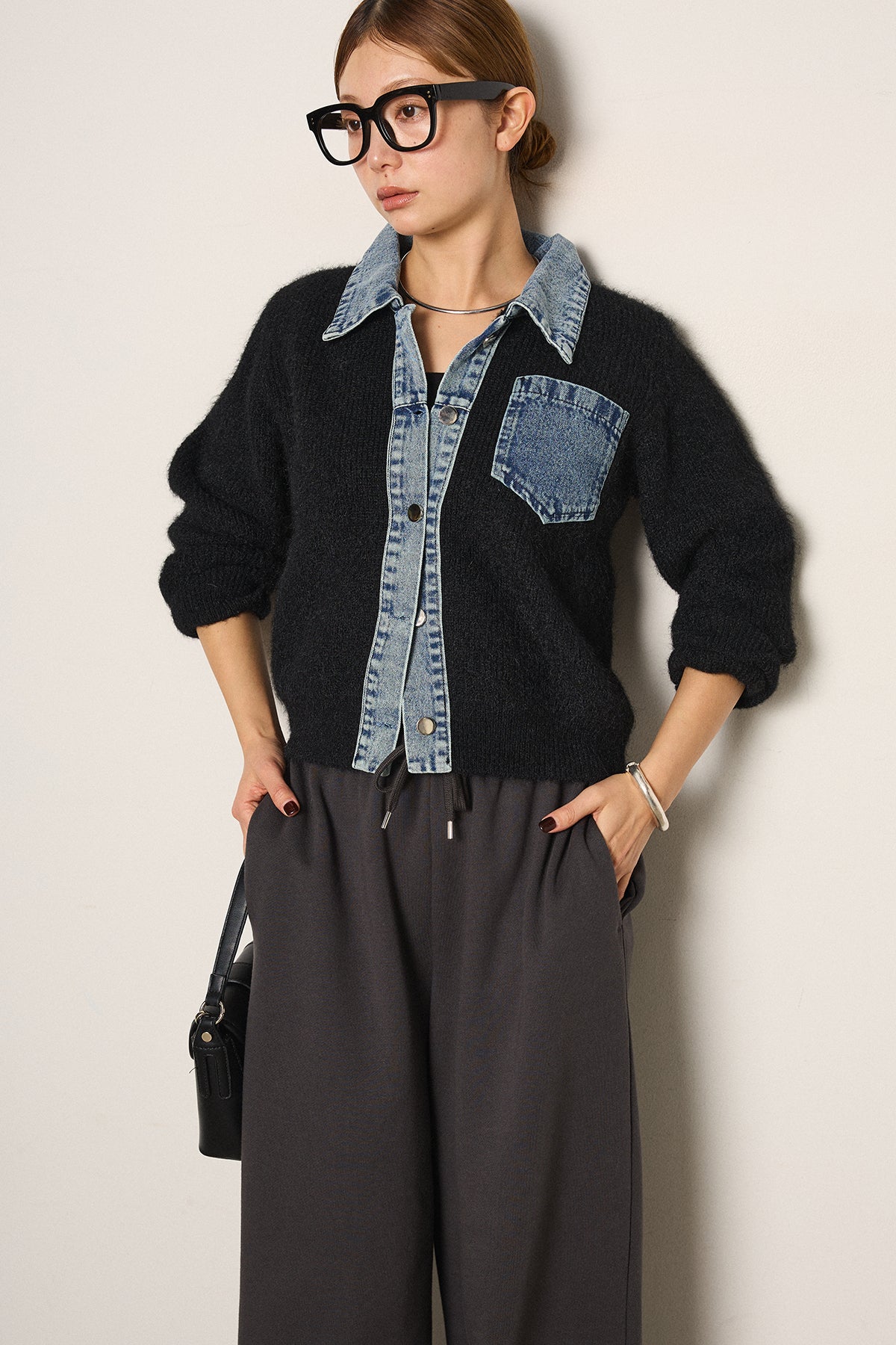 襟・前立て・胸ポケットにデニムを切り替えた、カーディガンとシャツの良さを一枚で楽しめるデザイン。ニットの柔らかさにデニムのアクセントが映え、シンプルに羽織るだけで存在感のあるスタイリングに。フロントは開けても閉めてもバランス良く着られ、ボトムにタックパンツやロングスカートを合わせるとこなれたムードに仕上がります。普段のニットに変化を付けたい日に取り入れたい一着です。」