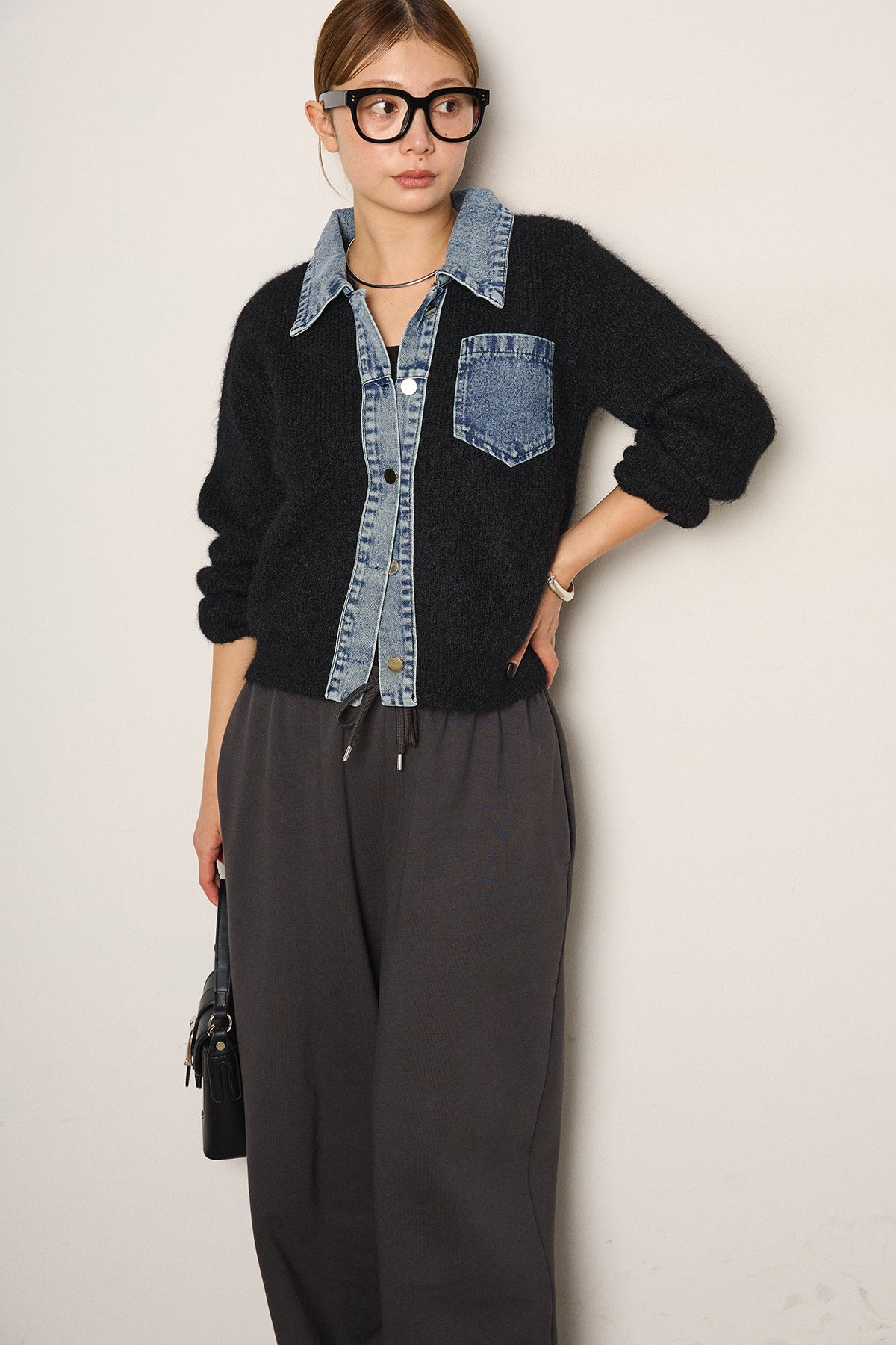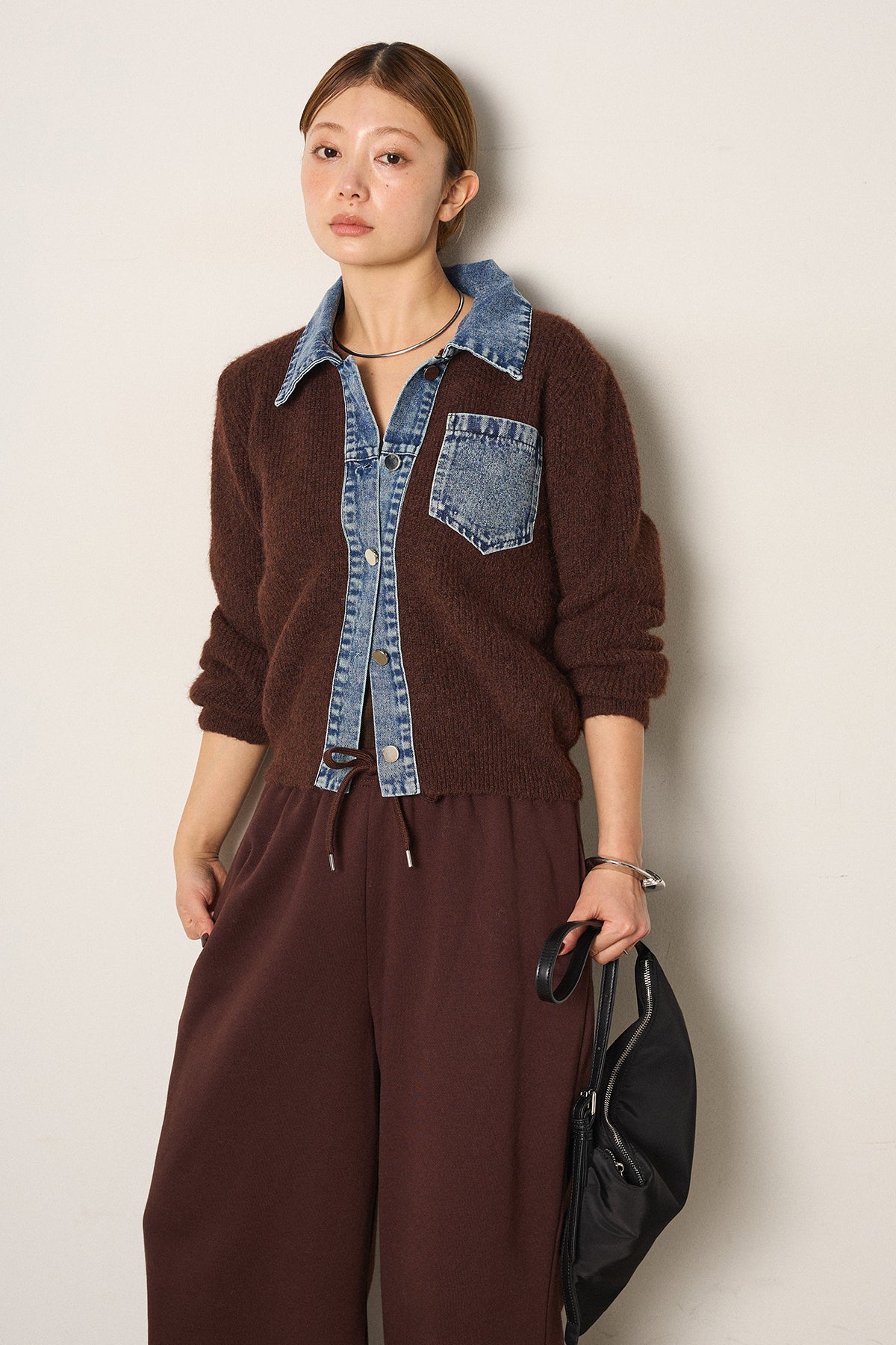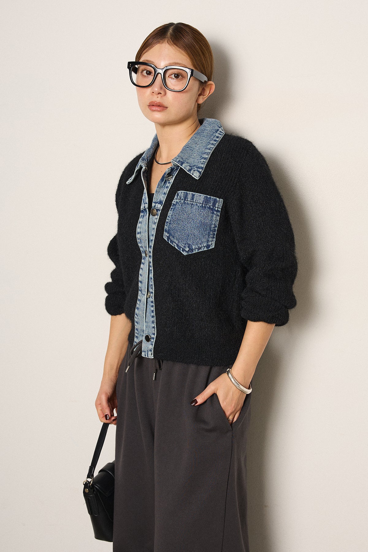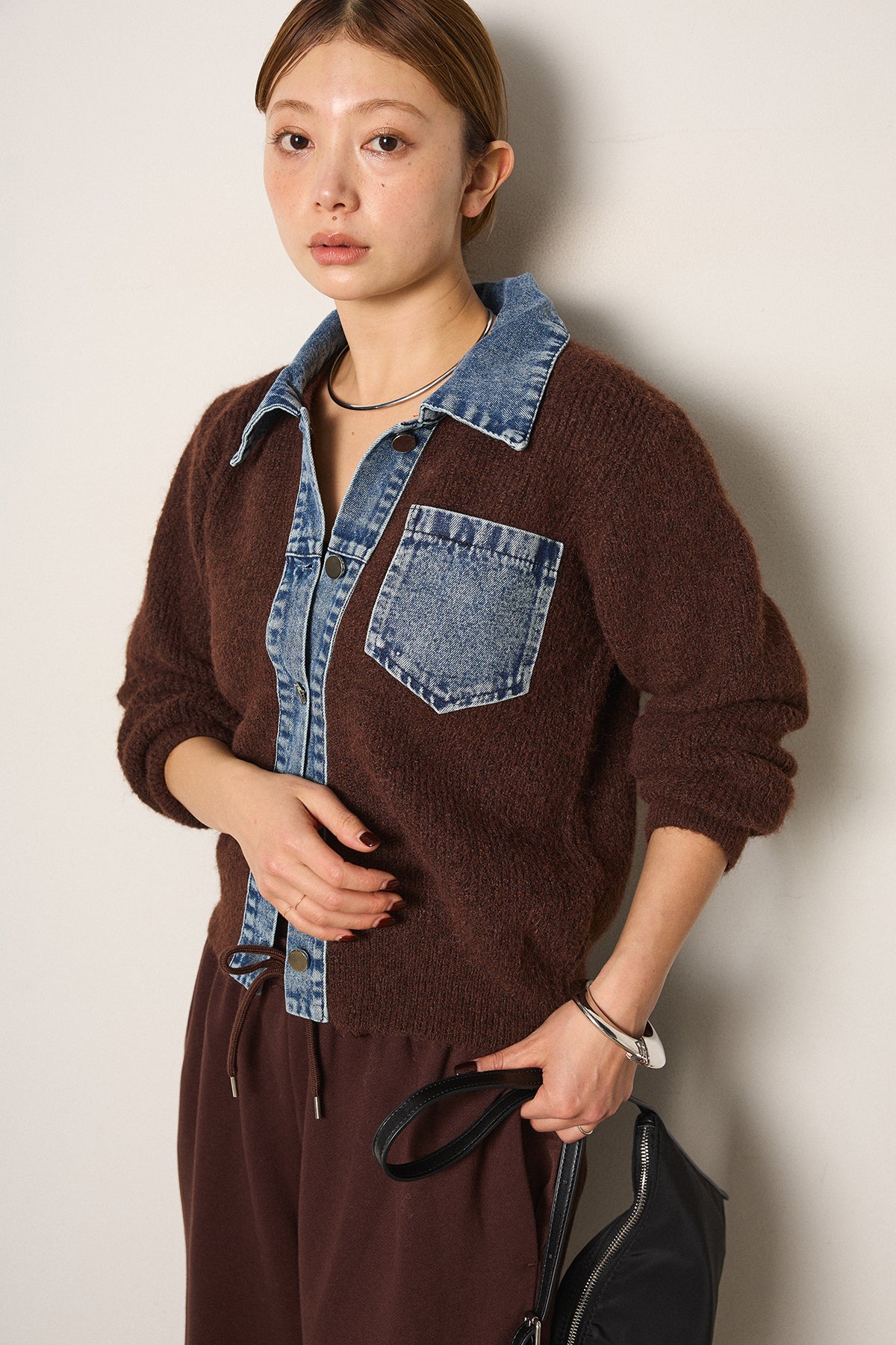 襟・前立て・胸ポケットにデニムを切り替えた、カーディガンとシャツの良さを一枚で楽しめるデザイン。ニットの柔らかさにデニムのアクセントが映え、シンプルに羽織るだけで存在感のあるスタイリングに。フロントは開けても閉めてもバランス良く着られ、ボトムにタックパンツやロングスカートを合わせるとこなれたムードに仕上がります。普段のニットに変化を付けたい日に取り入れたい一着です。」