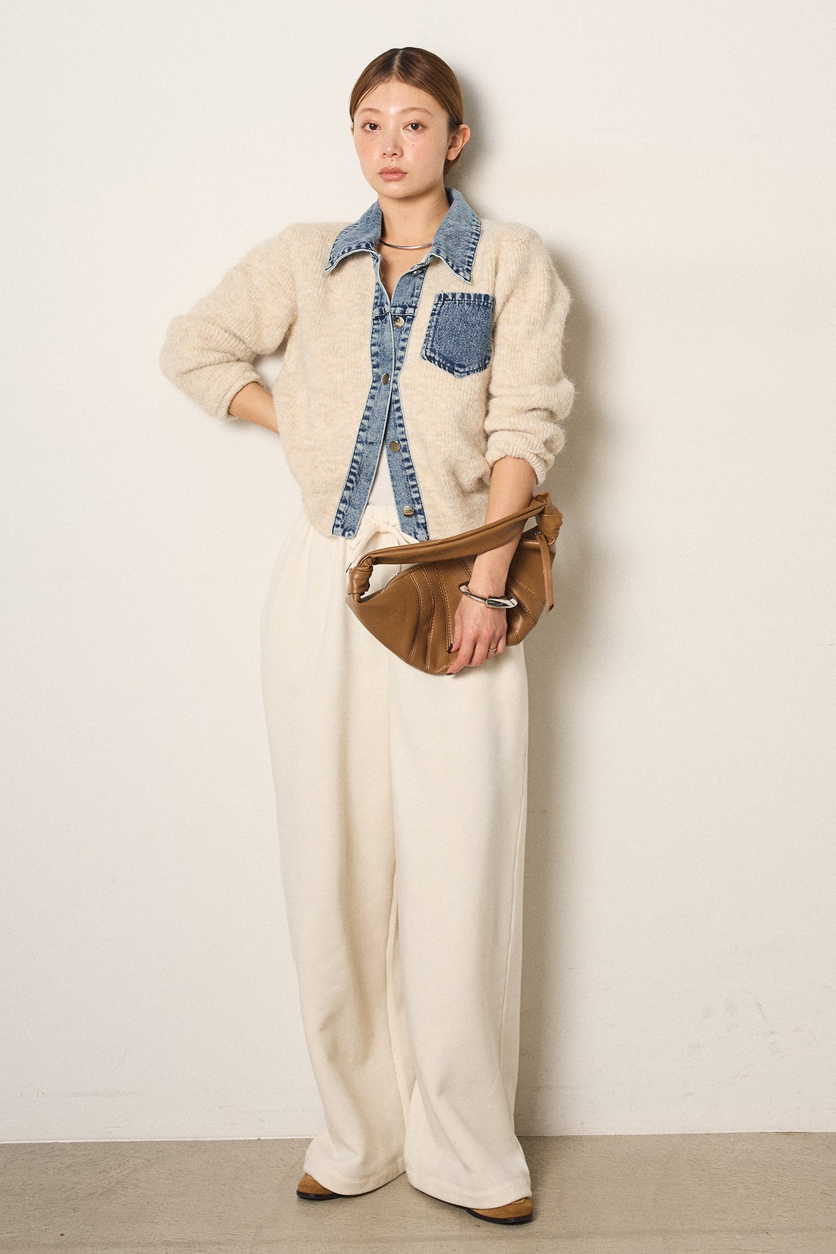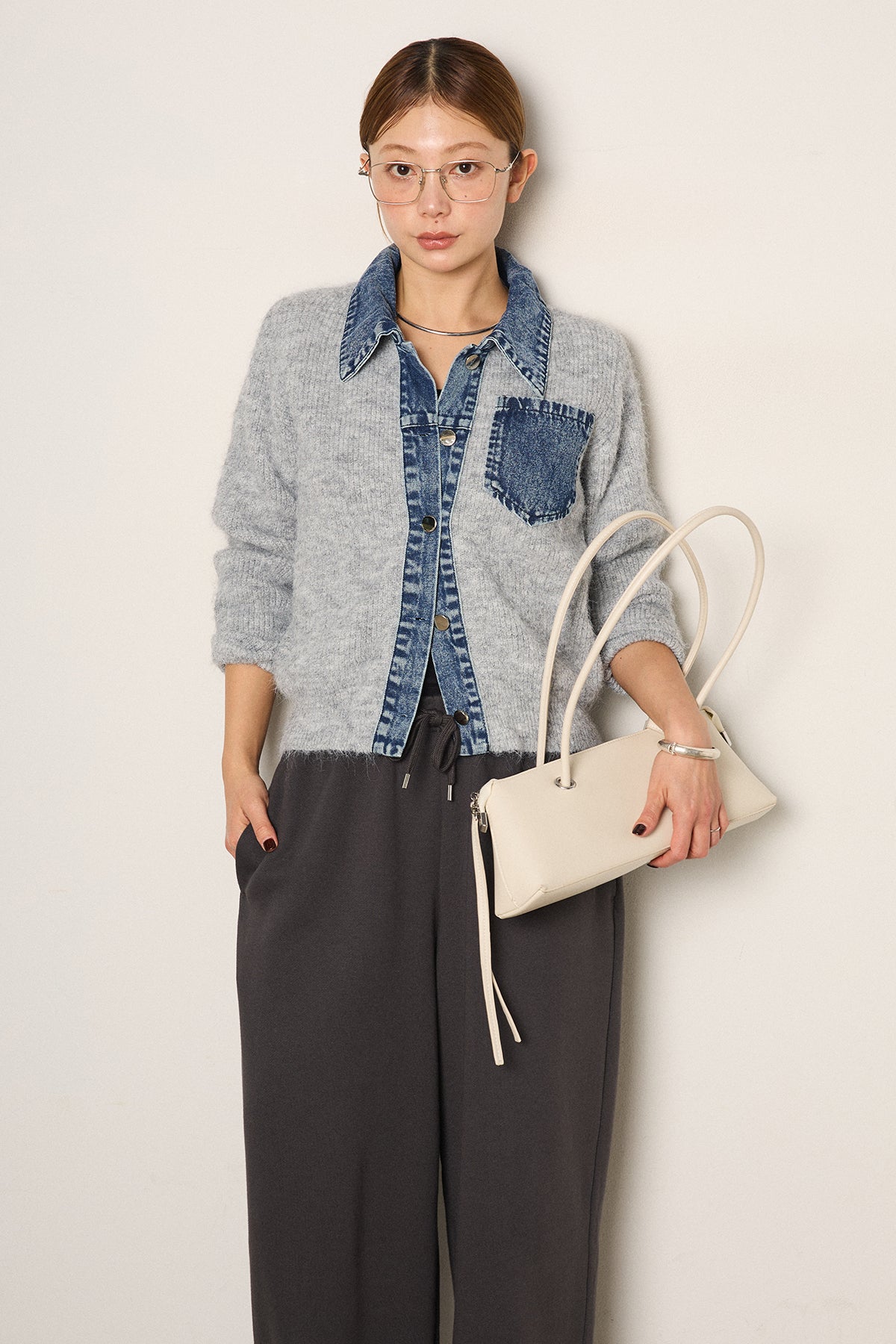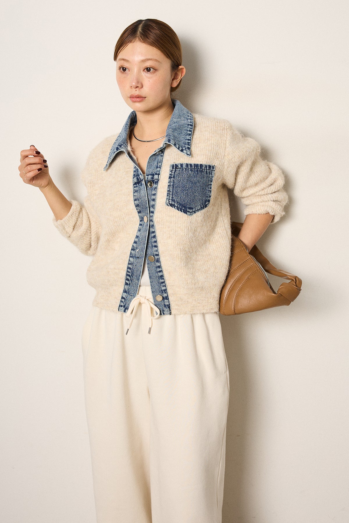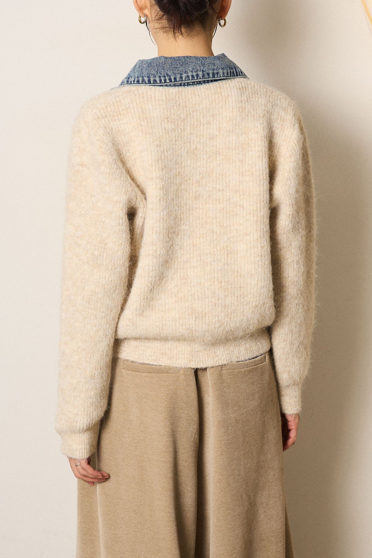 襟・前立て・胸ポケットにデニムを切り替えた、カーディガンとシャツの良さを一枚で楽しめるデザイン。ニットの柔らかさにデニムのアクセントが映え、シンプルに羽織るだけで存在感のあるスタイリングに。フロントは開けても閉めてもバランス良く着られ、ボトムにタックパンツやロングスカートを合わせるとこなれたムードに仕上がります。普段のニットに変化を付けたい日に取り入れたい一着です。」
